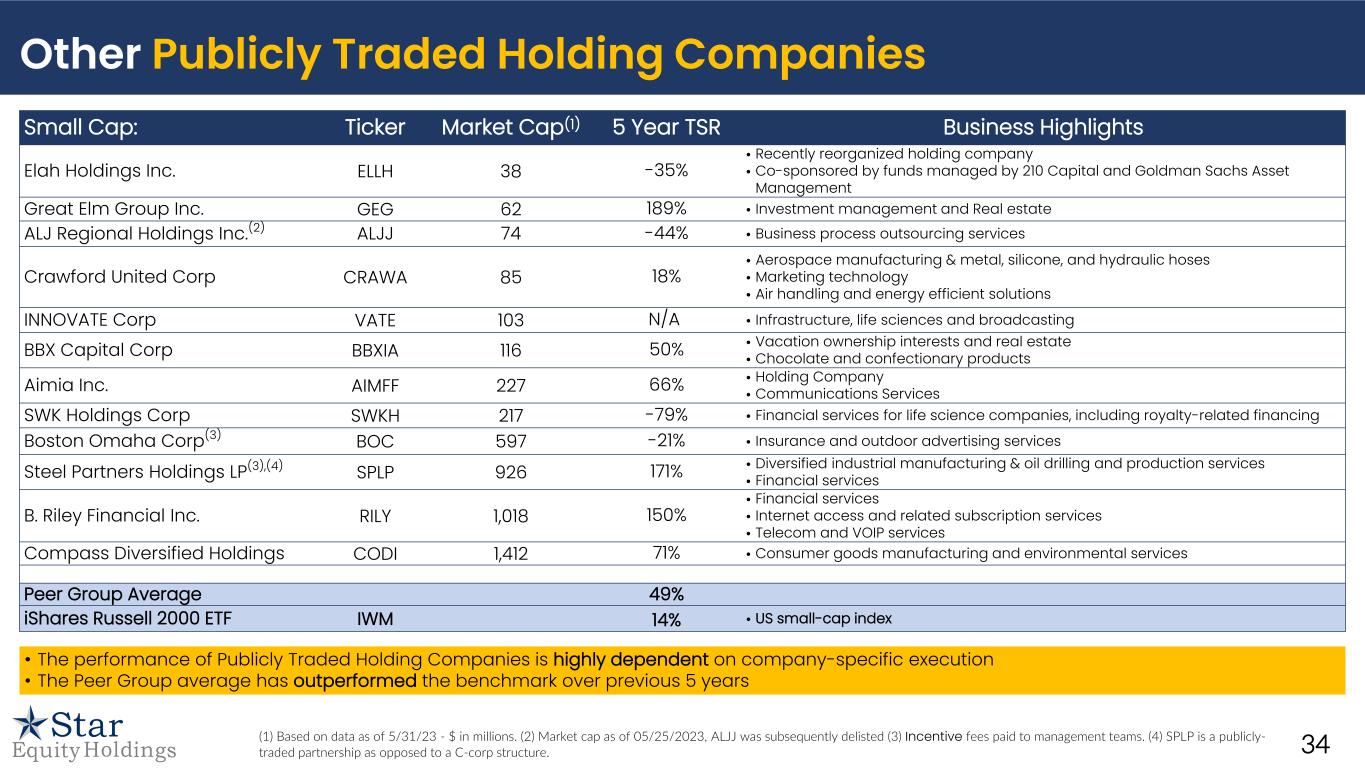 34 Small Cap: Ticker Market Cap(1) 5 Year TSR Business Highlights Elah Holdings Inc. ELLH 38 -35% • Recently reorganized holding company • Co-sponsored by funds managed by 210 Capital and Goldman Sachs Asset Management Great Elm Group Inc. GEG 62 189% • Investment management and Real estate ALJ Regional Holdings Inc.(2) ALJJ 74 -44% • Business process outsourcing services Crawford United Corp CRAWA 85 18% • Aerospace manufacturing & metal, silicone, and hydraulic hoses • Marketing technology • Air handling and energy efficient solutions INNOVATE Corp VATE 103 N/A • Infrastructure, life sciences and broadcasting BBX Capital Corp BBXIA 116 50% • Vacation ownership interests and real estate • Chocolate and confectionary products Aimia Inc. AIMFF 227 66% • Holding Company • Communications Services SWK Holdings Corp SWKH 217 -79% • Financial services for life science companies, including royalty-related financing Boston Omaha Corp(3) BOC 597 -21% • Insurance and outdoor advertising services Steel Partners Holdings LP(3),(4) SPLP 926 171% • Diversified industrial manufacturing & oil drilling and production services • Financial services B. Riley Financial Inc. RILY 1,018 150% • Financial services • Internet access and related subscription services • Telecom and VOIP services Compass Diversified Holdings CODI 1,412 71% • Consumer goods manufacturing and environmental services Peer Group Average 49% iShares Russell 2000 ETF IWM 14% • US small-cap index Other Publicly Traded Holding Companies (1) Based on data as of 5/31/23 - $ in millions. (2) Market cap as of 05/25/2023, ALJJ was subsequently delisted (3) Incentive fees paid to management teams. (4) SPLP is a publicly- traded partnership as opposed to a C-corp structure. • The performance of Publicly Traded Holding Companies is highly dependent on company-specific execution • The Peer Group average has outperformed the benchmark over previous 5 years
