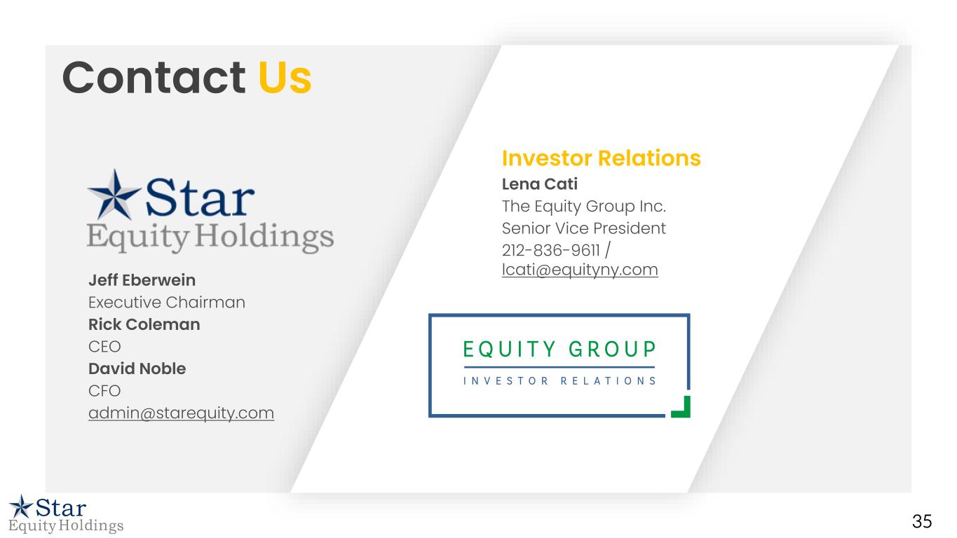 35 Jeff Eberwein Executive Chairman Rick Coleman CEO David Noble CFO admin@starequity.com Investor Relations Lena Cati The Equity Group Inc. Senior Vice President 212-836-9611 / lcati@equityny.com Contact Us