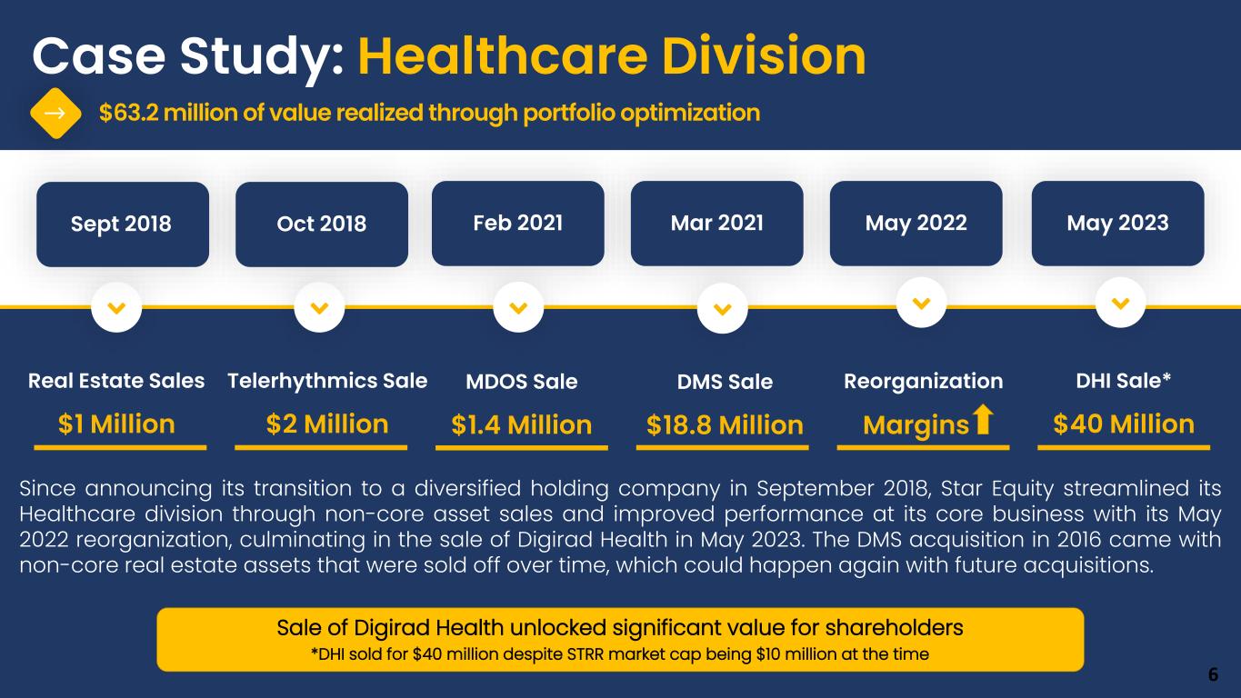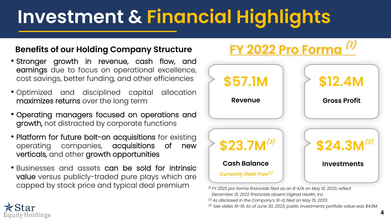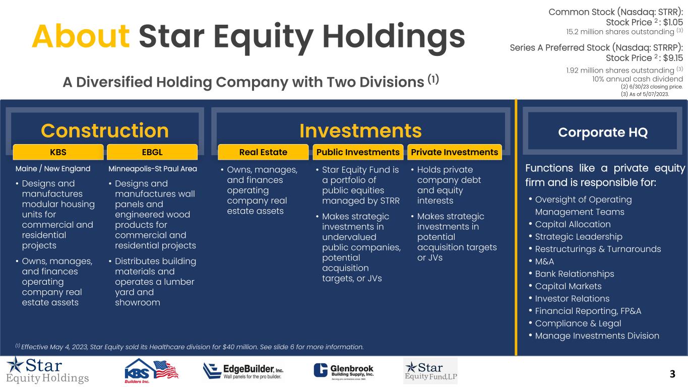 3 About Star Equity Holdings Construction Corporate HQInvestments A Diversified Holding Company with Two Divisions (1) Common Stock (Nasdaq: STRR): Stock Price 2 : $1.05 15.2 million shares outstanding (3) Series A Preferred Stock (Nasdaq: STRRP): Stock Price 2 : $9.15 1.92 million shares outstanding (3) 10% annual cash dividend (2) 6/30/23 closing price. (3) As of 5/07/2023. KBS EBGL Private InvestmentsPublic InvestmentsReal Estate (1) Effective May 4, 2023, Star Equity sold its Healthcare division for $40 million. See slide 6 for more information. Functions like a private equity firm and is responsible for: • Oversight of Operating Management Teams • Capital Allocation • Strategic Leadership • Restructurings & Turnarounds • M&A • Bank Relationships • Capital Markets • Investor Relations • Financial Reporting, FP&A • Compliance & Legal • Manage Investments Division • Star Equity Fund is a portfolio of public equities managed by STRR • Makes strategic investments in undervalued public companies, potential acquisition targets, or JVs • Owns, manages, and finances operating company real estate assets • Holds private company debt and equity interests • Makes strategic investments in potential acquisition targets or JVs Minneapolis-St Paul Area • Designs and manufactures wall panels and engineered wood products for commercial and residential projects • Distributes building materials and operates a lumber yard and showroom Maine / New England • Designs and manufactures modular housing units for commercial and residential projects • Owns, manages, and finances operating company real estate assets