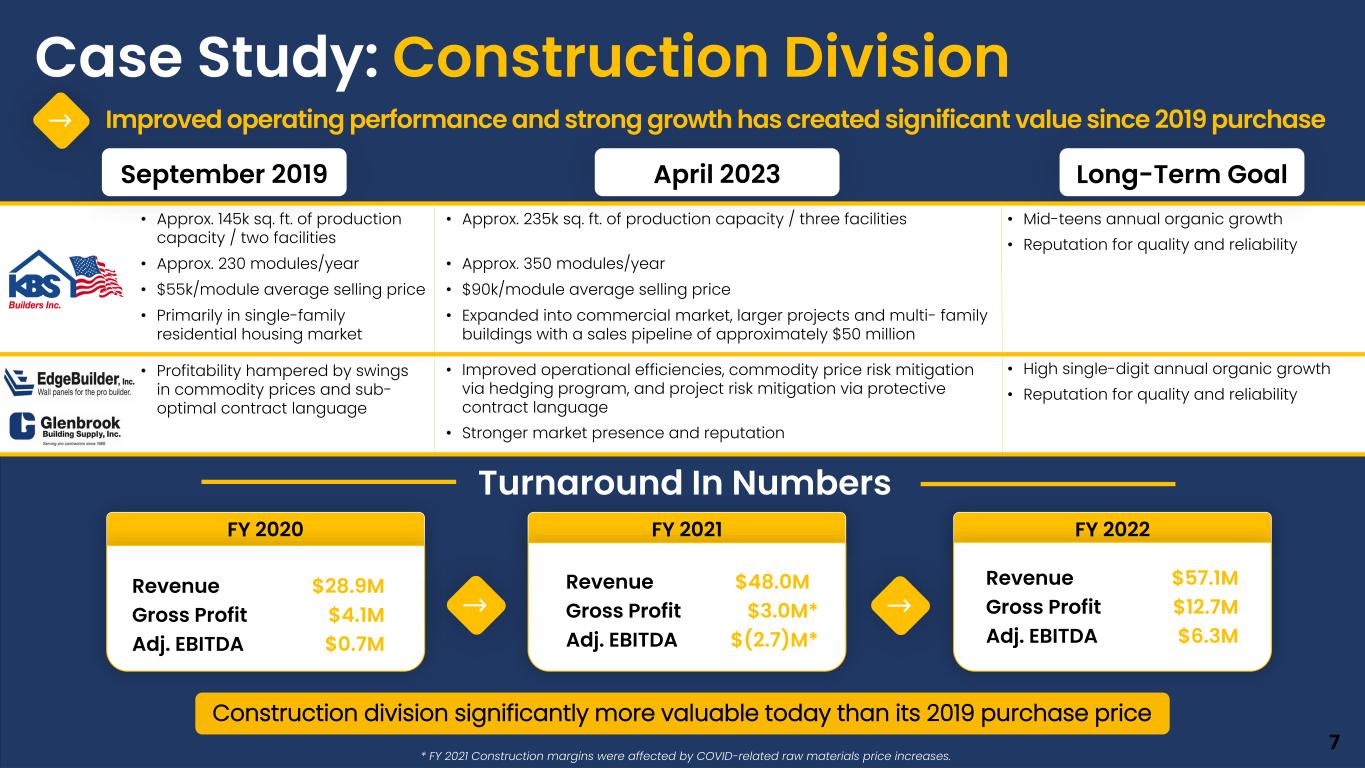 7 Case Study: Construction Division April 2023 Long-Term GoalSeptember 2019 • Approx. 145k sq. ft. of production capacity / two facilities • Approx. 230 modules/year • $55k/module average selling price • Primarily in single-family residential housing market • Approx. 235k sq. ft. of production capacity / three facilities • Approx. 350 modules/year • $90k/module average selling price • Expanded into commercial market, larger projects and multi- family buildings with a sales pipeline of approximately $50 million • Mid-teens annual organic growth • Reputation for quality and reliability • Profitability hampered by swings in commodity prices and sub- optimal contract language • Improved operational efficiencies, commodity price risk mitigation via hedging program, and project risk mitigation via protective contract language • Stronger market presence and reputation • High single-digit annual organic growth • Reputation for quality and reliability Turnaround In Numbers FY 2020 FY 2021 FY 2022 Revenue $28.9M Gross Profit $4.1M Adj. EBITDA $0.7M Revenue $48.0M Gross Profit $3.0M* Adj. EBITDA $(2.7)M* Revenue $57.1M Gross Profit $12.7M Adj. EBITDA $6.3M * FY 2021 Construction margins were affected by COVID-related raw materials price increases. Improved operating performance and strong growth has created significant value since 2019 purchase Construction division significantly more valuable today than its 2019 purchase price