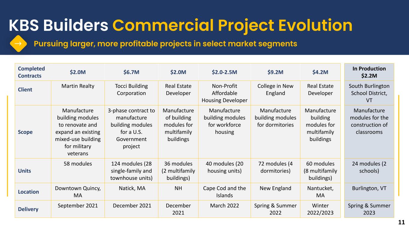 10 KBS Builders Business Unit Maine-based designer and manufacturer of modular housing units serving the New England Market MODULAR CONSTRUCTION BENEFITS - Shorter construction period - Significantly lower labor costs - Design flexibility - High quality control 3 MANUFACTURING FACILITIES - South Paris, Maine: approx. 85,000 sq. ft.; primary manufacturing facility - Oxford, Maine: approx. 90,000 sq. ft.; currently idle - Waterford, Maine: approx. 60,000 sq. ft.; currently idle GEOGRAPHIC FOOTPRINT - Expanding universe of single and multi- family homebuilders and commercial contractors and developers across New England ❖ Average selling price now exceeds $90,000/module(1) ❖ Sales pipeline of approximately $45 million(1) ❖ Long-Term Goal: mid-teens annual organic growth rate (CAGR from 2019 through 2022 = 33%) MODULAR UNITS - Residential homes and town houses - Apartment buildings and condos - Multi-story commercial/ office buildings - Other commercial applications, hospitals, schools, dormitories, etc. (1) As of 6/30/2023.