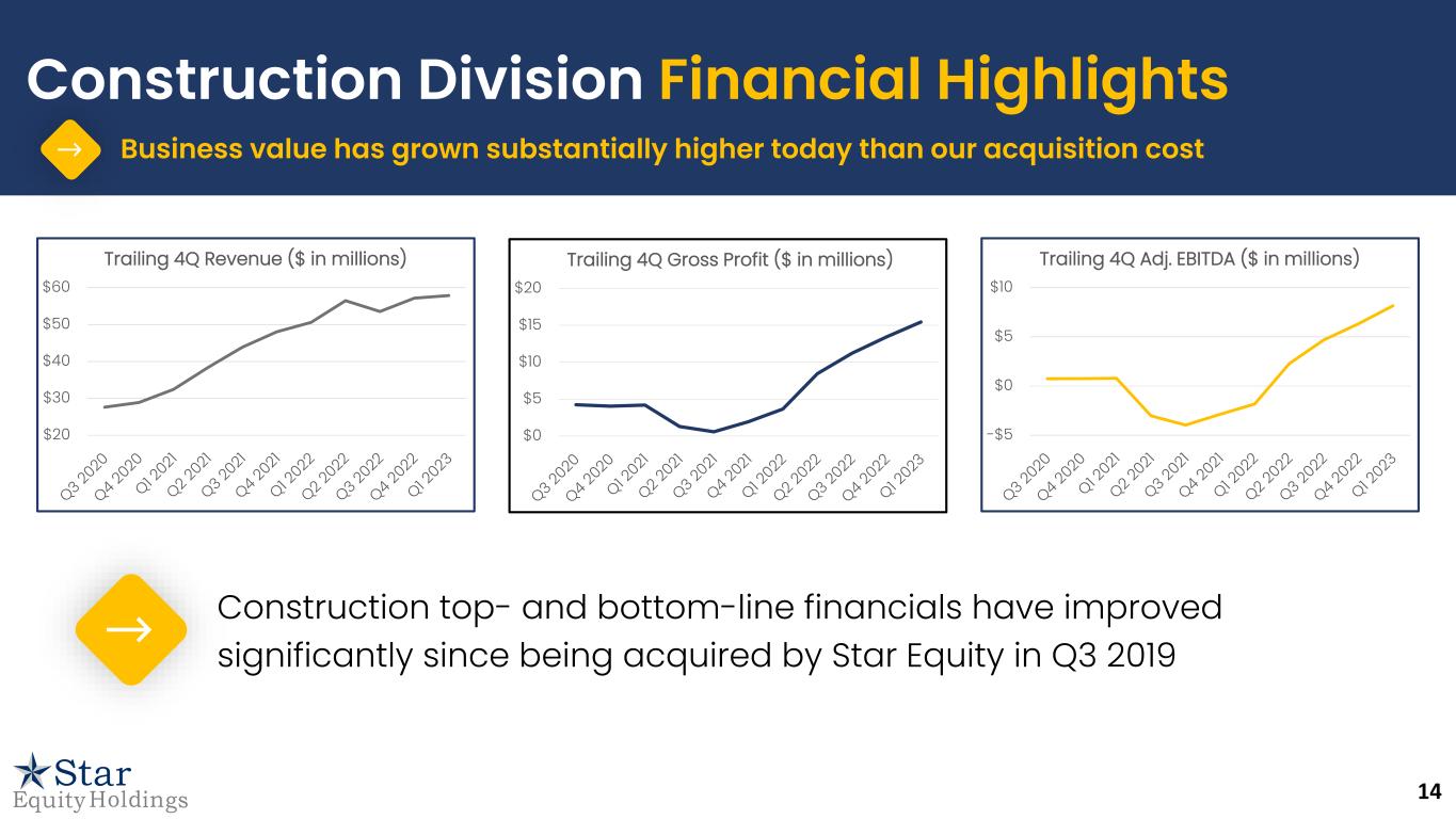 14 -$5 $0 $5 $10 Trailing 4Q Adj. EBITDA ($ in millions) $20 $30 $40 $50 $60 Trailing 4Q Revenue ($ in millions) Construction top- and bottom-line financials have improved significantly since being acquired by Star Equity in Q3 2019 Construction Division Financial Highlights Business value has grown substantially higher today than our acquisition cost $0 $5 $10 $15 $20 Trailing 4Q Gross Profit ($ in millions)