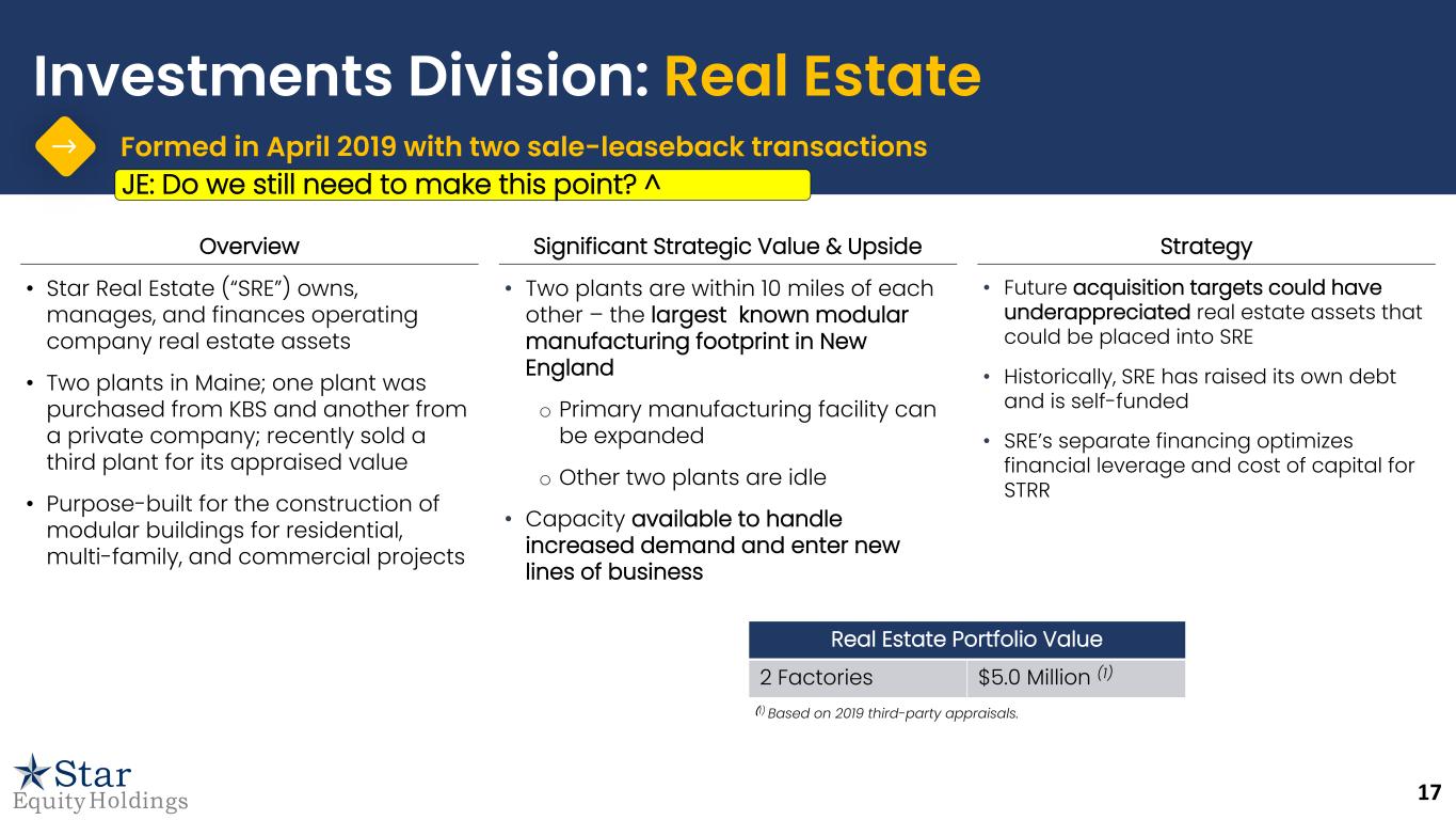 17 Investments Division: Real Estate Real Estate Portfolio Value 2 Factories $5.0 Million (1) (1) Based on 2019 third-party appraisals. Formed in April 2019 with two sale-leaseback transactions JE: Do we still need to make this point? ^ Overview • Star Real Estate (“SRE”) owns, manages, and finances operating company real estate assets • Two plants in Maine; one plant was purchased from KBS and another from a private company; recently sold a third plant for its appraised value • Purpose-built for the construction of modular buildings for residential, multi-family, and commercial projects Significant Strategic Value & Upside • Two plants are within 10 miles of each other – the largest known modular manufacturing footprint in New England o Primary manufacturing facility can be expanded o Other two plants are idle • Capacity available to handle increased demand and enter new lines of business Strategy • Future acquisition targets could have underappreciated real estate assets that could be placed into SRE • Historically, SRE has raised its own debt and is self-funded • SRE’s separate financing optimizes financial leverage and cost of capital for STRR