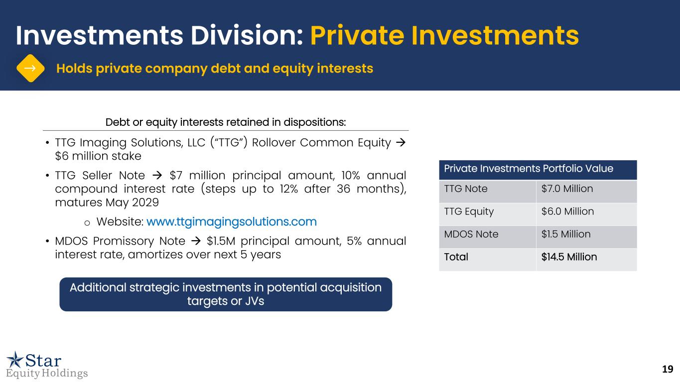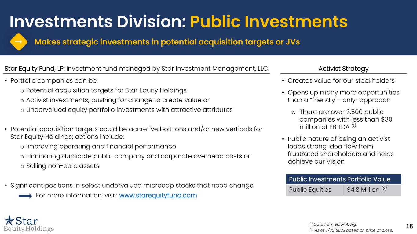 18 Star Equity Fund, LP: investment fund managed by Star Investment Management, LLC Investments Division: Public Investments • Portfolio companies can be: o Potential acquisition targets for Star Equity Holdings o Activist investments; pushing for change to create value or o Undervalued equity portfolio investments with attractive attributes • Potential acquisition targets could be accretive bolt-ons and/or new verticals for Star Equity Holdings; actions include: o Improving operating and financial performance o Eliminating duplicate public company and corporate overhead costs or o Selling non-core assets • Significant positions in select undervalued microcap stocks that need change For more information, visit: www.starequityfund.com Makes strategic investments in potential acquisition targets or JVs Public Investments Portfolio Value Public Equities $4.8 Million (2) Activist Strategy • Creates value for our stockholders • Opens up many more opportunities than a “friendly – only” approach o There are over 3,500 public companies with less than $30 million of EBITDA (1) • Public nature of being an activist leads strong idea flow from frustrated shareholders and helps achieve our Vision (1) Data from Bloomberg. (2) As of 6/30/2023 based on price at close.