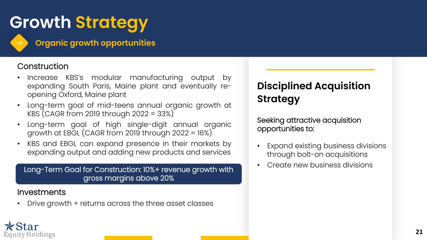 21 Disciplined Acquisition Strategy Seeking attractive acquisition opportunities to: • Expand existing business divisions through bolt-on acquisitions • Create new business divisions Construction • Increase KBS’s modular manufacturing output by expanding South Paris, Maine plant and eventually re- opening Oxford, Maine plant • Long-term goal of mid-teens annual organic growth at KBS (CAGR from 2019 through 2022 = 33%) • Long-term goal of high single-digit annual organic growth at EBGL (CAGR from 2019 through 2022 = 16%) • KBS and EBGL can expand presence in their markets by expanding output and adding new products and services Investments • Drive growth + returns across the three asset classes Growth Strategy Organic growth opportunities Long-Term Goal for Construction: 10%+ revenue growth with gross margins above 20%