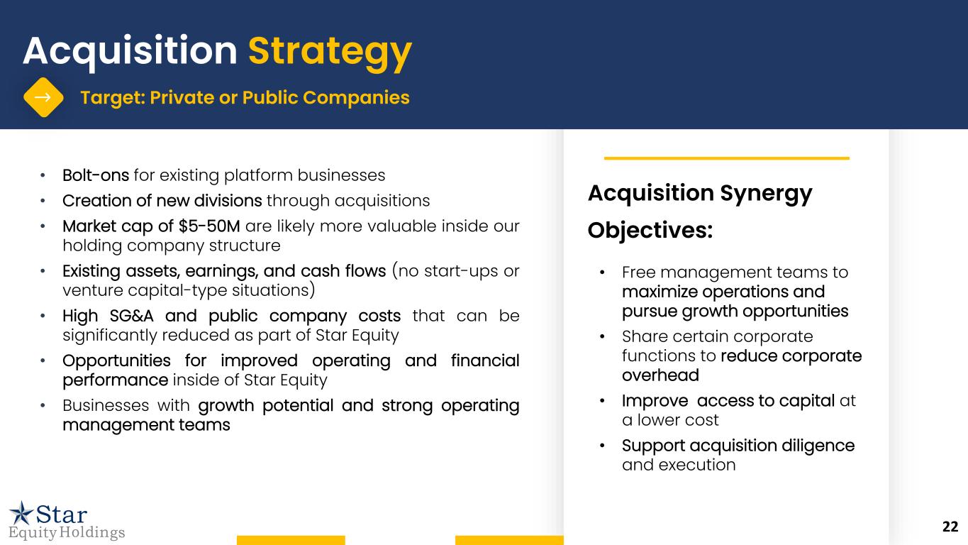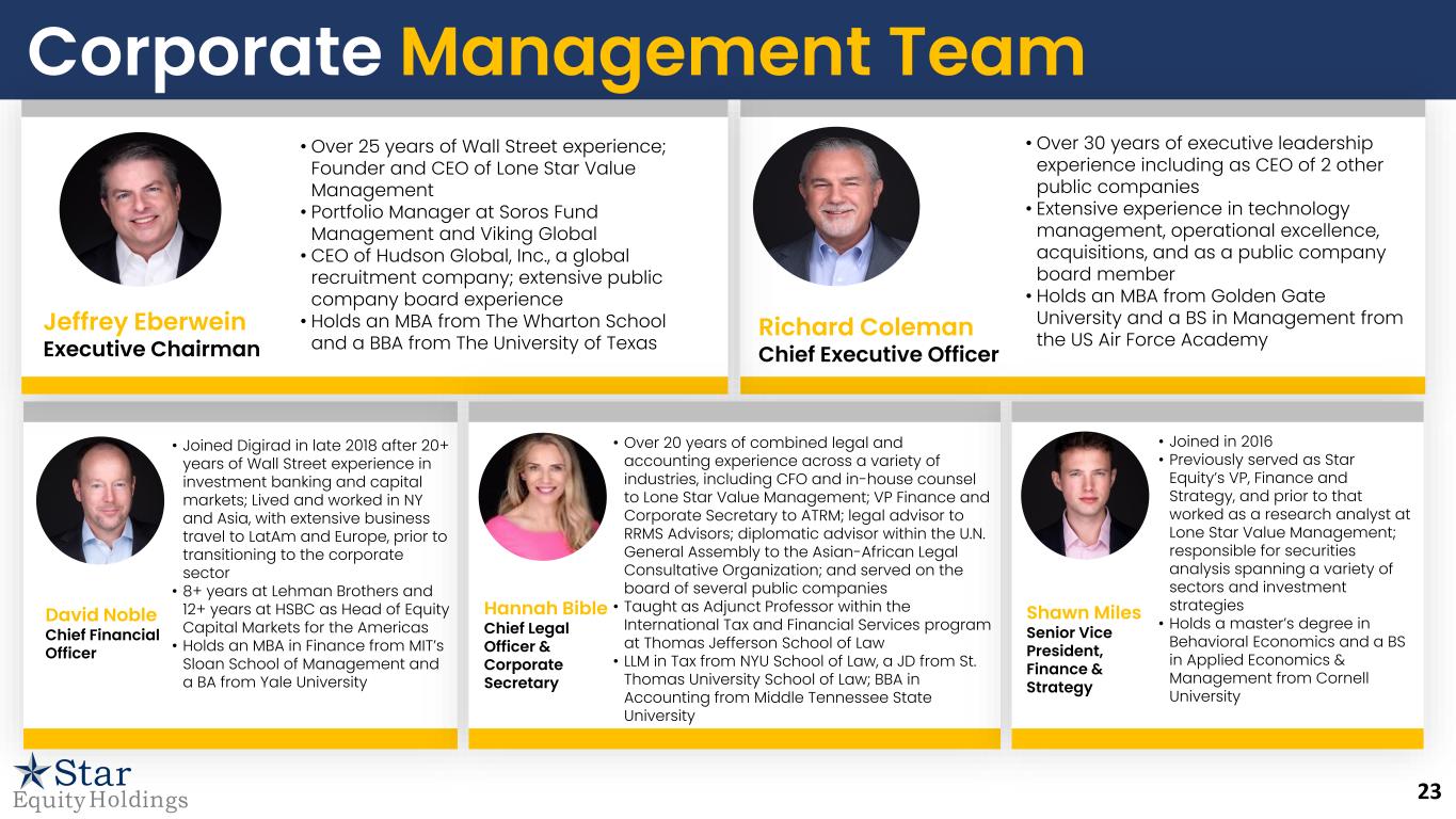 22 Acquisition Synergy Objectives: • Free management teams to maximize operations and pursue growth opportunities • Share certain corporate functions to reduce corporate overhead • Improve access to capital at a lower cost • Support acquisition diligence and execution • Bolt-ons for existing platform businesses • Creation of new divisions through acquisitions • Market cap of $5-50M are likely more valuable inside our holding company structure • Existing assets, earnings, and cash flows (no start-ups or venture capital-type situations) • High SG&A and public company costs that can be significantly reduced as part of Star Equity • Opportunities for improved operating and financial performance inside of Star Equity • Businesses with growth potential and strong operating management teams Acquisition Strategy Target: Private or Public Companies