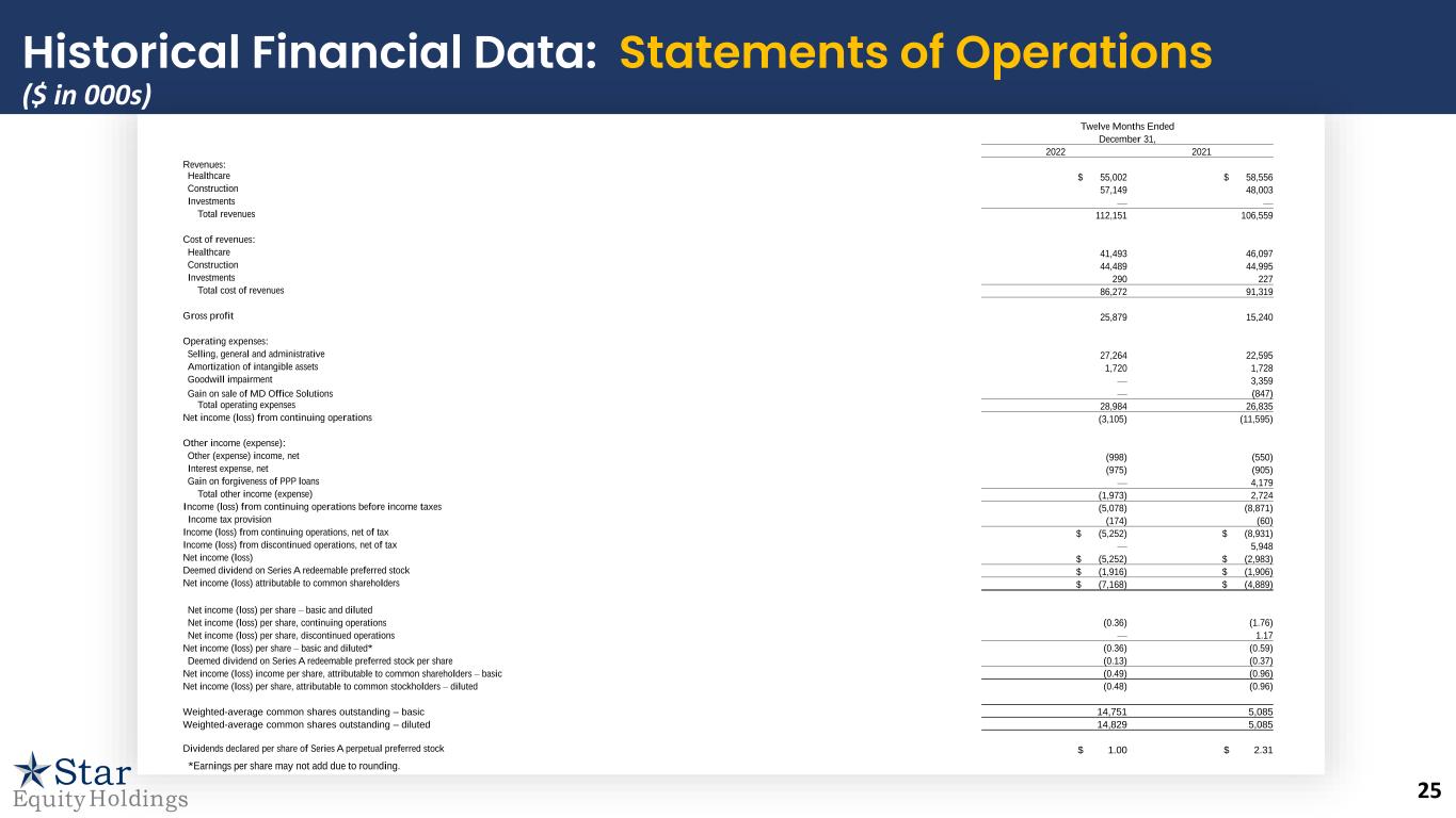 25 Historical Financial Data: Statements of Operations ($ in 000s) Twelve Months Ended December 31, 2022 2021 Revenues: Healthcare $ 55,002 $ 58,556 Construction 57,149 48,003 Investments — — Total revenues 112,151 106,559 Cost of revenues: Healthcare 41,493 46,097 Construction 44,489 44,995 Investments 290 227 Total cost of revenues 86,272 91,319 Gross profit 25,879 15,240 Operating expenses: Selling, general and administrative 27,264 22,595 Amortization of intangible assets 1,720 1,728 Goodwill impairment — 3,359 Gain on sale of MD Office Solutions — (847) Total operating expenses 28,984 26,835 Net income (loss) from continuing operations (3,105) (11,595) Other income (expense): Other (expense) income, net (998) (550) Interest expense, net (975) (905) Gain on forgiveness of PPP loans — 4,179 Total other income (expense) (1,973) 2,724 Income (loss) from continuing operations before income taxes (5,078) (8,871) Income tax provision (174) (60) Income (loss) from continuing operations, net of tax $ (5,252) $ (8,931) Income (loss) from discontinued operations, net of tax — 5,948 Net income (loss) $ (5,252) $ (2,983) Deemed dividend on Series A redeemable preferred stock $ (1,916) $ (1,906) Net income (loss) attributable to common shareholders $ (7,168) $ (4,889) Net income (loss) per share – basic and diluted Net income (loss) per share, continuing operations (0.36) (1.76) Net income (loss) per share, discontinued operations — 1.17 Net income (loss) per share – basic and diluted* (0.36) (0.59) Deemed dividend on Series A redeemable preferred stock per share (0.13) (0.37) Net income (loss) income per share, attributable to common shareholders – basic (0.49) (0.96) Net income (loss) per share, attributable to common stockholders – diluted (0.48) (0.96) Weighted-average common shares outstanding – basic 14,751 5,085 Weighted-average common shares outstanding – diluted 14,829 5,085 Dividends declared per share of Series A perpetual preferred stock $ 1.00 $ 2.31 *Earnings per share may not add due to rounding.