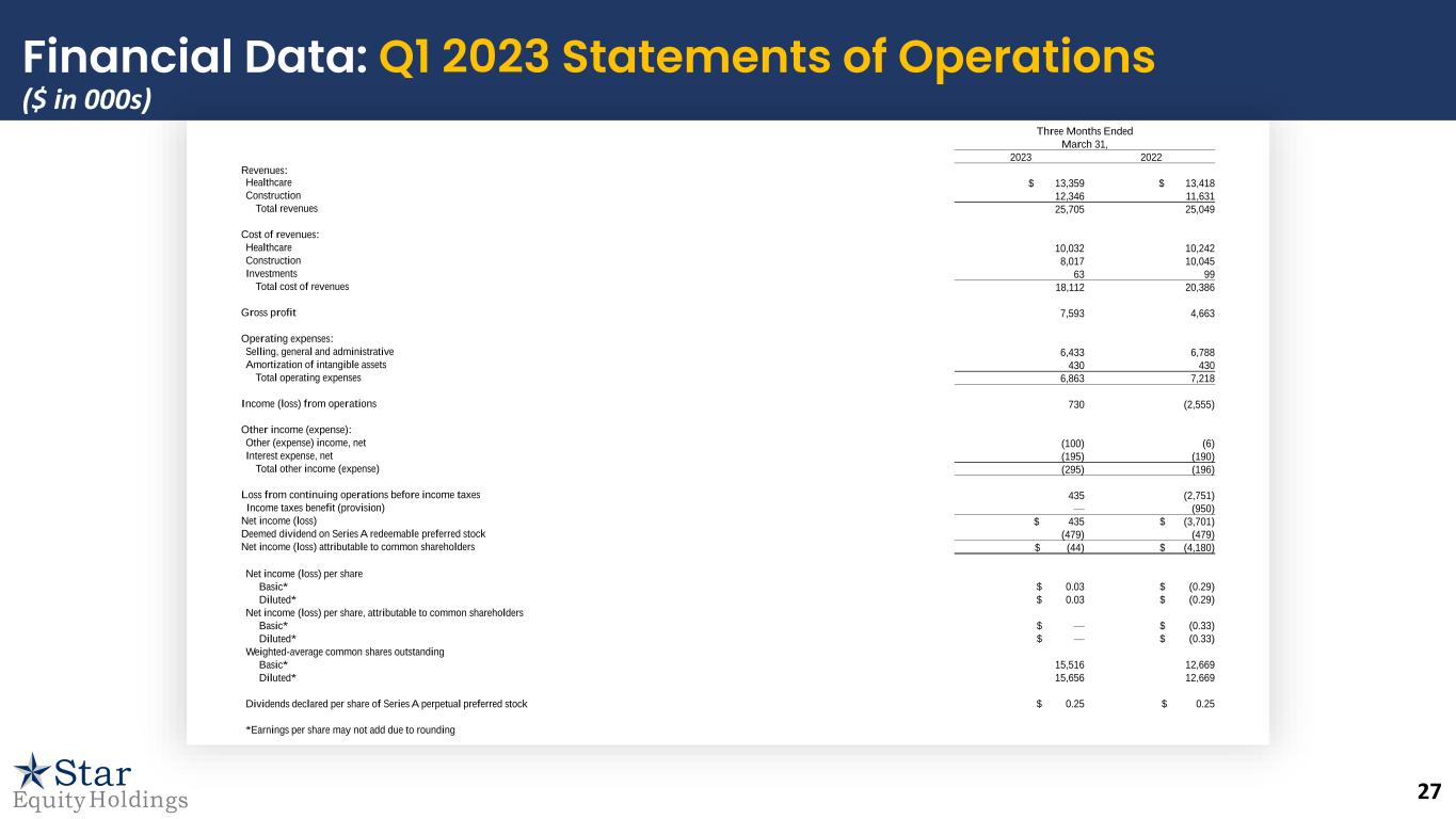 26 Historical Financial Data: Pro Forma Statements of Operations ($ in 000s) Star Equity Holdings, Inc Historical (See note below) Transaction Accounting Adjustments Star Equity Holdings, Inc. Pro Forma Revenues: Healthcare $ 55,002 $ (55,002) $ — Construction 57,149 — 57,149 Investments — — — Total revenues 112,151 (55,002) 57,149 Cost of revenues: Healthcare 41,493 (41,493) — Construction 44,489 — 44,489 Investments 290 — 290 Total cost of revenues 86,272 (41,493) 44,779 Gross profit 25,879 (13,509) 12,370 Operating expenses: Selling, general and administrative 27,264 (13,068) 14,196 Amortization of intangible assets 1,720 (1) 1,719 Total operating expenses 28,984 (13,069) 15,915 Net Income (loss) from continuing operations (3,105) (440) (3,545) Other income (expense): Other income (expense), net (998) (338) (1,336) Interest expense, net (975) 411 (564) Total other income (expense), net (1,973) 73 (1,900) Income (loss) from continuing operations before income taxes (5,078) (367) (5,445) Income tax benefit (provision) (174) 262 88 Net income (loss) from continuing operations, net of tax $ (5,252) $ (105) $ (5,357) Deemed dividend on Series A redeemable preferred stock (1,916) — (1,916) Net income (loss) attributable to common shareholders $ (7,168) $ (105) $ (7,273) Net income (loss) per share Basic* $ (0.36) $ (0.01) $ (0.36) Net income (loss) per share, attributable to common shareholders Basic* $ (0.49) $ (0.01) $ (0.49) Weighted-average common shares outstanding Basic* 14,751 14,751 14,751 For the Year Ended December 31, 2022 *Earnings per share may not add due to rounding.