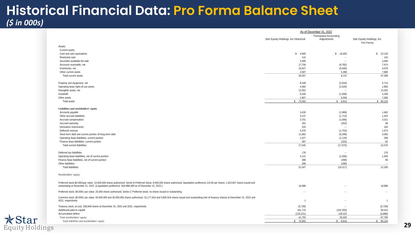 29 Historical Financial Data: Pro Forma Balance Sheet ($ in 000s) Star Equity Holdings, Inc Historical Transaction Accounting Adjustments Star Equity Holdings, Inc. Pro Forma Assets Current assets: Cash and cash equivalents $ 4,665 $ 18,455 $ 23,120 Restricted cash 142 — 142 Securities available-for-sale 3,490 — 3,490 Accounts receivable, net 17,756 (9,782) 7,974 Inventories, net 10,627 (5,949) 4,678 Other current assets 2,587 5,398 7,985 Total current assets 39,267 8,122 47,389 Property and equipment, net 8,348 (2,634) 5,714 Operating lease right-of-use assets 4,482 (2,626) 1,856 Intangible assets, net 13,352 — 13,352 Goodwill 6,046 (1,608) 4,438 Other assets 1,807 5,559 7,366 Total assets $ 73,302 $ 6,813 $ 80,115 Liabilities and stockholders’ equity Accounts payable 3,430 (1,968) 1,462 Other accrued liabilities 3,137 (1,713) 1,424 Accrued compensation 3,701 (1,690) 2,011 Accrued warranty 291 (253) 38 Derivative Instruments 104 — 104 Deferred revenue 3,376 (1,703) 1,673 Short-term debt and current portion of long-term debt 11,682 (8,299) 3,383 Operating lease liabilities, current portion 1,427 (1,129) 298 Finance lease liabilities, current portion 397 (315) 82 Total current liabilities 27,545 (17,070) 10,475 Deferred tax liabilities 176 — 176 Operating lease liabilities, net of current portion 3,141 (1,558) 1,583 Finance lease liabilities, net of current portion 386 (290) 96 Other liabilities 299 (299) — Total liabilities 31,547 (19,217) 12,330 Stockholders’ equity: Preferred stock,$0.0001par value: 10,000,000 shares authorized: Series A Preferred Stock, 8,000,000 shares authorized, liquidation preference (10.00 per share), 1,915,637 shares issued and outstanding at December 31, 2022. (Liquidation preference: $18,988,390 as of December 31, 2022.) 18,988 — 18,988 Preferred stock, $0.0001 par value: 25,000 shares authorized; Series C Preferred stock, no shares issued or outstanding — — — Common stock, $0.0001 par value: 50,000,000 and 30,000,000 shares authorized; 15,177,919 and 5,805,916 shares issued and outstanding (net of treasury shares) at December 31, 2022 and 2021, respectively 1 — 1 Treasury stock, at cost; 258,849 shares at December 31, 2022 and 2021, respectively (5,728) — (5,728) Additional paid-in capital 161,715 (102,293) 59,422 Accumulated deficit (133,221) 128,323 (4,898) Total stockholders’ equity 41,755 26,030 67,785 Total liabilities and stockholders’ equity $ 73,302 $ 6,813 $ 80,115 As of December 31, 2022