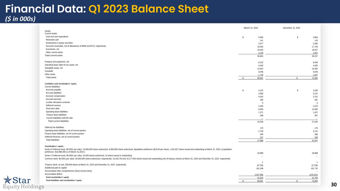28 Historical Financial Data: Balance Sheet ($ in 000s) December 31, 2022 December 31, 2021 Assets Current assets: Cash and cash equivalents $ 4,665 $ 4,538 Restricted cash 142 278 Investments in equity securities 3,490 47 Lumber derivative contracts — 666 Accounts receivable, net of allowances of $714 and $843, respectively 17,756 15,811 Inventories, net 10,627 8,525 Other current assets 2,587 1,998 Total current assets 39,267 31,863 Property and equipment, net 8,348 8,918 Operating lease right-of-use assets, net 4,482 4,494 Intangible assets, net 13,352 15,072 Goodwill 6,046 6,046 Other assets 1,807 1,659 Total assets $ 73,302 $ 68,052 Liabilities, Mezzanine Equity and Stockholders’ Equity Current liabilities: Accounts payable 3,430 4,277 Accrued liabilities 3,137 2,445 Accrued compensation 3,701 3,051 Accrued warranty 291 569 Lumber derivative contracts 104 — Billings in excess of costs and estimated profit — 312 Deferred revenue 3,376 2,457 Short-term debt 11,682 12,869 Operating lease liabilities 1,427 1,253 Finance lease liabilities 397 588 Total current liabilities 27,545 27,821 Deferred tax liabilities 176 72 Operating lease liabilities, net of current portion 3,141 3,299 Finance lease liabilities, net of current portion 386 706 Other liabilities 299 412 Total liabilities 31,547 32,310 Preferred stock, $0.0001 par value: 10,000,000 shares authorized: Series A Preferred Stock, $8,000,000 shares authorized, liquidation preference ($10.00 per share), 1,915,637 shares issued or outstanding at December 31, 2021. (Liquidation preference: $18,988,390 as of December 31, 2021.) — 18,988 Stockholders’ equity: Preferred stock,$0.0001par value: 10,000,000 shares authorized: Series A Preferred Stock, 8,000,000 shares authorized, liquidation preference (10.00 per share), 1,915,637 shares issued and outstanding at December 31, 2022. (Liquidation preference:$18,988,390 as of December 31, 2022.) 18,988 — Preferred stock, $0.0001 par value: 25,000 shares authorized; Series C Preferred stock, no shares issued or outstanding — — Common stock, $0.0001 par value: 50,000,000 and 30,000,000 shares authorized; 15,177,919 and 5,805,916 shares issued and outstanding (net of treasury shares) at December 31, 2022 and 2021, respectively 1 — Treasury stock, at cost; 258,849 shares at December 31, 2022 and 2021, respectively (5,728) (5,728) Additional paid-in capital 161,715 150,451 Accumulated deficit (133,221) (127,969) Total stockholders’ equity 41,755 16,754 Total liabilities, mezzanine equity and stockholders’ equity $ 73,302 $ 68,052