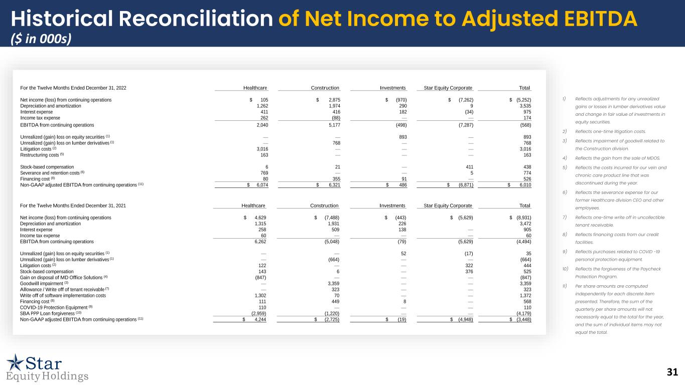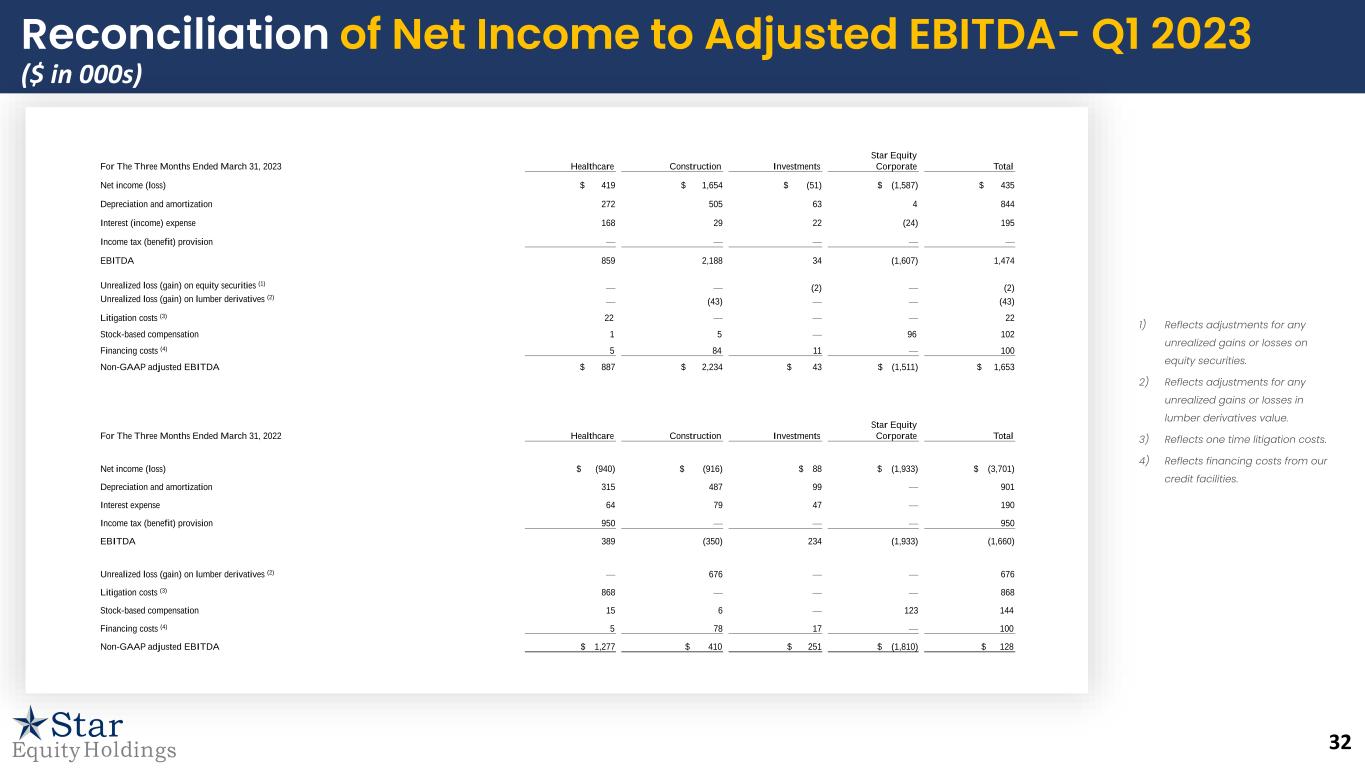 31 Historical Reconciliation of Net Income to Adjusted EBITDA ($ in 000s) 1) Reflects adjustments for any unrealized gains or losses in lumber derivatives value and change in fair value of investments in equity securities. 2) Reflects one-time litigation costs. 3) Reflects impairment of goodwill related to the Construction division. 4) Reflects the gain from the sale of MDOS. 5) Reflects the costs incurred for our vein and chronic care product line that was discontinued during the year. 6) Reflects the severance expense for our former Healthcare division CEO and other employees. 7) Reflects one-time write off in uncollectible tenant receivable. 8) Reflects financing costs from our credit facilities. 9) Reflects purchases related to COVID -19 personal protection equipment. 10) Reflects the forgiveness of the Paycheck Protection Program. 11) Per share amounts are computed independently for each discrete item presented. Therefore, the sum of the quarterly per share amounts will not necessarily equal to the total for the year, and the sum of individual items may not equal the total. For the Twelve Months Ended December 31, 2022 Healthcare Construction Investments Star Equity Corporate Total Net income (loss) from continuing operations $ 105 $ 2,875 $ (970) $ (7,262) $ (5,252) Depreciation and amortization 1,262 1,974 290 9 3,535 Interest expense 411 416 182 (34) 975 Income tax expense 262 (88) — — 174 EBITDA from continuing operations 2,040 5,177 (498) (7,287) (568) Unrealized (gain) loss on equity securities (1) — — 893 — 893 Unrealized (gain) loss on lumber derivatives (1) — 768 — — 768 Litigation costs (2) 3,016 — — — 3,016 Restructuring costs (5) 163 — — — 163 Stock-based compensation 6 21 — 411 438 Severance and retention costs (6) 769 — — 5 774 Financing cost (8) 80 355 91 — 526 Non-GAAP adjusted EBITDA from continuing operations (11) $ 6,074 $ 6,321 $ 486 $ (6,871) $ 6,010 For the Twelve Months Ended December 31, 2021 Healthcare Construction Investments Star Equity Corporate Total Net income (loss) from continuing operations $ 4,629 $ (7,488) $ (443) $ (5,629) $ (8,931) Depreciation and amortization 1,315 1,931 226 3,472 Interest expense 258 509 138 — 905 Income tax expense 60 — — — 60 EBITDA from continuing operations 6,262 (5,048) (79) (5,629) (4,494) Unrealized (gain) loss on equity securities (1) — — 52 (17) 35 Unrealized (gain) loss on lumber derivatives (1) — (664) — — (664) Litigation costs (2) 122 — — 322 444 Stock-based compensation 143 6 — 376 525 Gain on disposal of MD Office Solutions (4) (847) — — — (847) Goodwill impairment (3) — 3,359 — — 3,359 Allowance / Write off of tenant receivable (7) — 323 — — 323 Write off of software implementation costs 1,302 70 — — 1,372 Financing cost (8) 111 449 8 — 568 COVID-19 Protection Equipment (9) 110 — — — 110 SBA PPP Loan forgiveness (10) (2,959) (1,220) — — (4,179) Non-GAAP adjusted EBITDA from continuing operations (11) $ 4,244 $ (2,725) $ (19) $ (4,948) $ (3,448)