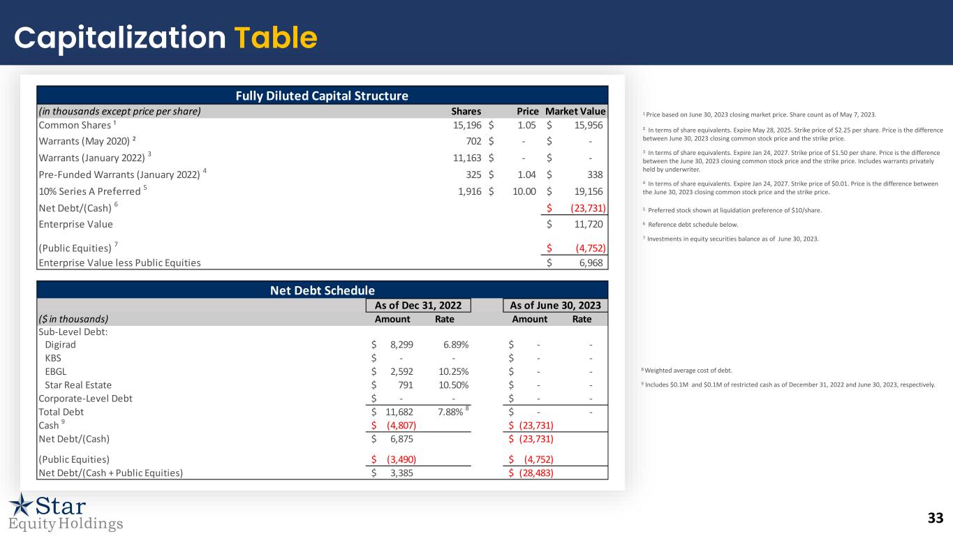 33 Capitalization Table 8 Weighted average cost of debt. 9 Includes $0.1M and $0.1M of restricted cash as of December 31, 2022 and June 30, 2023, respectively. 1 Price based on June 30, 2023 closing market price. Share count as of May 7, 2023. ² In terms of share equivalents. Expire May 28, 2025. Strike price of $2.25 per share. Price is the difference between June 30, 2023 closing common stock price and the strike price. 3 In terms of share equivalents. Expire Jan 24, 2027. Strike price of $1.50 per share. Price is the difference between the June 30, 2023 closing common stock price and the strike price. Includes warrants privately held by underwriter. 4 In terms of share equivalents. Expire Jan 24, 2027. Strike price of $0.01. Price is the difference between the June 30, 2023 closing common stock price and the strike price. 5 Preferred stock shown at liquidation preference of $10/share. 6 Reference debt schedule below. 7 Investments in equity securities balance as of June 30, 2023. (in thousands except price per share) Shares Price Market Value Common Shares ¹ 15,196 1.05$ 15,956$ Warrants (May 2020) ² 702 -$ -$ Warrants (January 2022) 3 11,163 -$ -$ Pre-Funded Warrants (January 2022) 4 325 1.04$ 338$ 10% Series A Preferred 5 1,916 10.00$ 19,156$ Net Debt/(Cash) 6 (23,731)$ Enterprise Value 11,720$ (Public Equities) 7 (4,752)$ Enterprise Value less Public Equities 6,968$ Fully Diluted Capital Structure ($ in thousands) Amount Rate Amount Rate Sub-Level Debt: Digirad 8,299$ 6.89% -$ - KBS -$ - -$ - EBGL 2,592$ 10.25% -$ - Star Real Estate 791$ 10.50% -$ - Corporate-Level Debt -$ - -$ - Total Debt 11,682$ 7.88% 8 -$ - Cash 9 (4,807)$ (23,731)$ Net Debt/(Cash) 6,875$ (23,731)$ (Public Equities) (3,490)$ (4,752)$ Net Debt/(Cash + Public Equities) 3,385$ (28,483)$ As of Dec 31, 2022 As of June 30, 2023 Net Debt Schedule