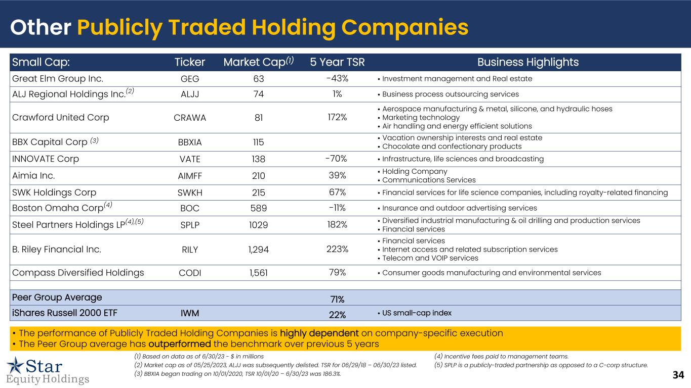 34 Small Cap: Ticker Market Cap(1) 5 Year TSR Business Highlights Great Elm Group Inc. GEG 63 -43% • Investment management and Real estate ALJ Regional Holdings Inc.(2) ALJJ 74 1% • Business process outsourcing services Crawford United Corp CRAWA 81 172% • Aerospace manufacturing & metal, silicone, and hydraulic hoses • Marketing technology • Air handling and energy efficient solutions BBX Capital Corp (3) BBXIA 115 • Vacation ownership interests and real estate • Chocolate and confectionary products INNOVATE Corp VATE 138 -70% • Infrastructure, life sciences and broadcasting Aimia Inc. AIMFF 210 39% • Holding Company • Communications Services SWK Holdings Corp SWKH 215 67% • Financial services for life science companies, including royalty-related financing Boston Omaha Corp(4) BOC 589 -11% • Insurance and outdoor advertising services Steel Partners Holdings LP(4),(5) SPLP 1029 182% • Diversified industrial manufacturing & oil drilling and production services • Financial services B. Riley Financial Inc. RILY 1,294 223% • Financial services • Internet access and related subscription services • Telecom and VOIP services Compass Diversified Holdings CODI 1,561 79% • Consumer goods manufacturing and environmental services Peer Group Average 71% iShares Russell 2000 ETF IWM 22% • US small-cap index Other Publicly Traded Holding Companies • The performance of Publicly Traded Holding Companies is highly dependent on company-specific execution • The Peer Group average has outperformed the benchmark over previous 5 years (1) Based on data as of 6/30/23 - $ in millions (2) Market cap as of 05/25/2023, ALJJ was subsequently delisted. TSR for 06/29/18 – 06/30/23 listed. (3) BBXIA began trading on 10/01/2020, TSR 10/01/20 – 6/30/23 was 186.3%. (4) Incentive fees paid to management teams. (5) SPLP is a publicly-traded partnership as opposed to a C-corp structure.