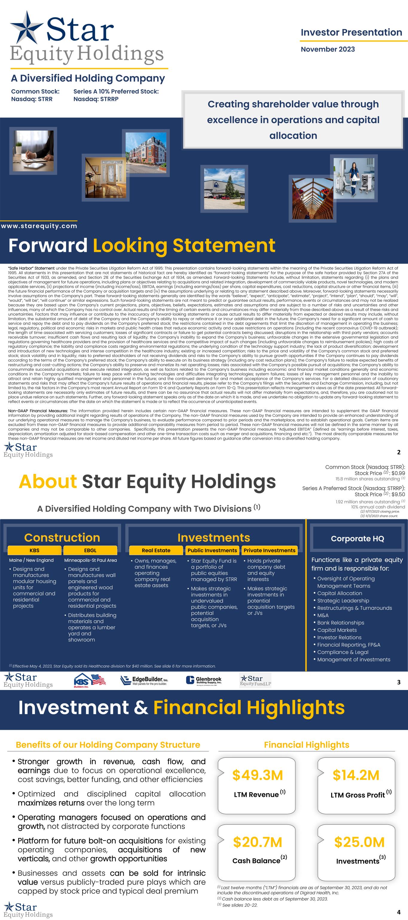 1 A Diversified Holding Company www.starequity.com Creating shareholder value through excellence in operations and capital allocation Common Stock: Nasdaq: STRR Series A 10% Preferred Stock: Nasdaq: STRRP Investor Presentation November 2023 2 “Safe Harbor” Statement under the Private Securities Litigation Reform Act of 1995: This presentation contains forward-looking statements within the meaning of the Private Securities Litigation Reform Act of 1995. All statements in this presentation that are not statements of historical fact are hereby identified as “forward-looking statements” for the purpose of the safe harbor provided by Section 27A of the Securities Act of 1933, as amended, and Section 21E of the Securities Exchange Act of 1934, as amended. Forward-looking Statements include, without limitation, statements regarding (i) the plans and objectives of management for future operations, including plans or objectives relating to acquisitions and related integration, development of commercially viable products, novel technologies, and modern applicable services, (ii) projections of income (including income/loss), EBITDA, earnings (including earnings/loss) per share, capital expenditures, cost reductions, capital structure or other financial items, (iii) the future financial performance of the Company or acquisition targets and (iv) the assumptions underlying or relating to any statement described above. Moreover, forward-looking statements necessarily involve assumptions on the Company’s part. These forward-looking statements generally are identified by the words “believe”, “expect”, “anticipate”, “estimate”, “project”, “intend”, “plan”, “should”, “may”, “will”, “would”, “will be”, “will continue” or similar expressions. Such forward-looking statements are not meant to predict or guarantee actual results, performance, events or circumstances and may not be realized because they are based upon the Company's current projections, plans, objectives, beliefs, expectations, estimates and assumptions and are subject to a number of risks and uncertainties and other influences, many of which the Company has no control over. Actual results and the timing of certain events and circumstances may differ materially from those described above as a result of these risks and uncertainties. Factors that may influence or contribute to the inaccuracy of forward-looking statements or cause actual results to differ materially from expected or desired results may include, without limitation, the substantial amount of debt of the Company and the Company’s ability to repay or refinance it or incur additional debt in the future; the Company’s need for a significant amount of cash to service and repay the debt and to pay dividends on the Company’s preferred stock; the restrictions contained in the debt agreements that limit the discretion of management in operating the business; legal, regulatory, political and economic risks in markets and public health crises that reduce economic activity and cause restrictions on operations (including the recent coronavirus COVID-19 outbreak); the length of time associated with servicing customers; losses of significant contracts or failure to get potential contracts being discussed; disruptions in the relationship with third party vendors; accounts receivable turnover; insufficient cash flows and resulting lack of liquidity; the Company's inability to expand the Company's business; unfavorable changes in the extensive governmental legislation and regulations governing healthcare providers and the provision of healthcare services and the competitive impact of such changes (including unfavorable changes to reimbursement policies); high costs of regulatory compliance; the liability and compliance costs regarding environmental regulations; the underlying condition of the technology support industry; the lack of product diversification; development and introduction of new technologies and intense competition in the healthcare industry; existing or increased competition; risks to the price and volatility of the Company’s common stock and preferred stock; stock volatility and in liquidity; risks to preferred stockholders of not receiving dividends and risks to the Company’s ability to pursue growth opportunities if the Company continues to pay dividends according to the terms of the Company’s preferred stock; the Company’s ability to execute on its business strategy (including any cost reduction plans); the Company’s failure to realize expected benefits of restructuring and cost-cutting actions; the Company’s ability to preserve and monetize its net operating losses; risks associated with the Company’s possible pursuit of acquisitions; the Company’s ability to consummate successful acquisitions and execute related integration, as well as factors related to the Company’s business including economic and financial market conditions generally and economic conditions in the Company’s markets; failure to keep pace with evolving technologies and difficulties integrating technologies; system failures; losses of key management personnel and the inability to attract and retain highly qualified management and personnel in the future; and the continued demand for and market acceptance of the Company’s services. For a detailed discussion of cautionary statements and risks that may affect the Company’s future results of operations and financial results, please refer to the Company’s filings with the Securities and Exchange Commission, including, but not limited to, the risk factors in the Company’s most recent Annual Report on Form 10-K and Quarterly Reports on Form 10-Q. This presentation reflects management’s views as of the date presented. All forward- looking statements are necessarily only estimates of future results, and there can be no assurance that actual results will not differ materially f