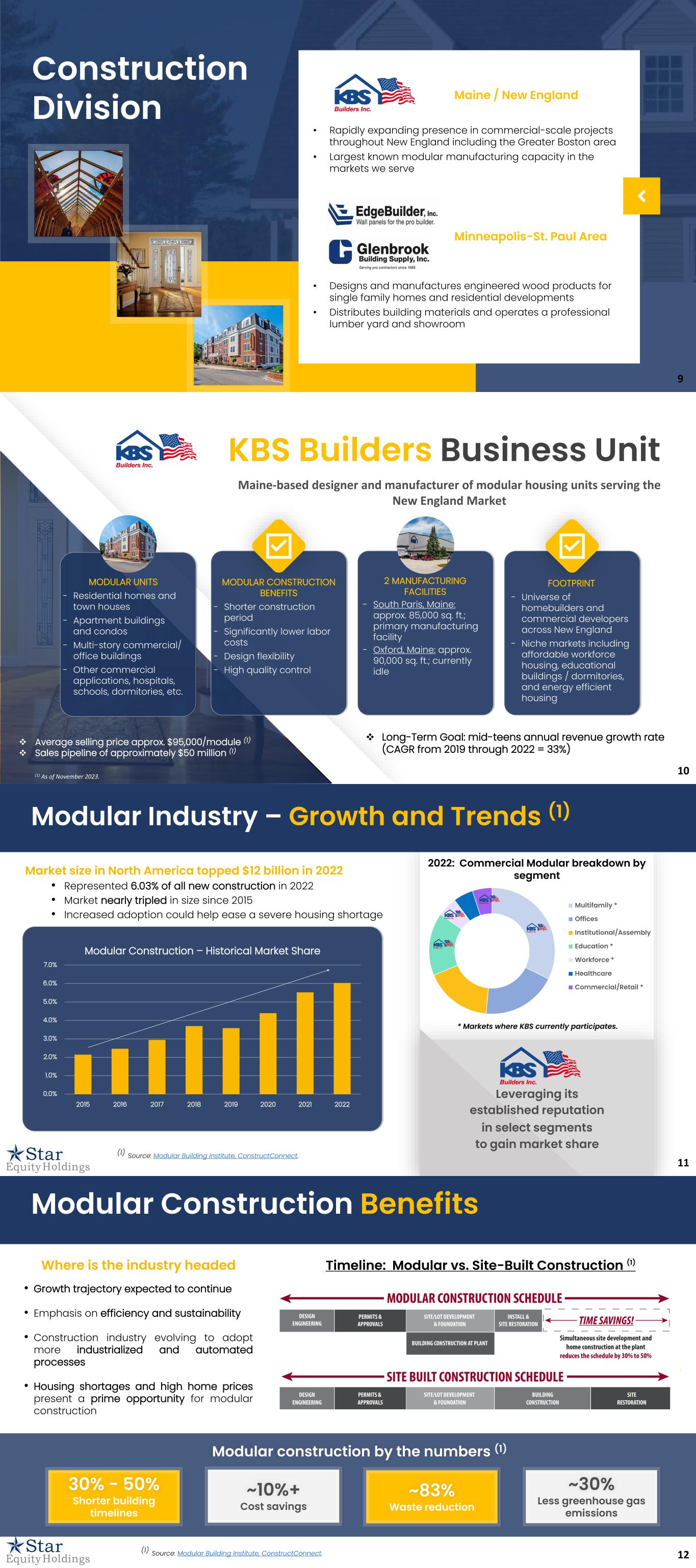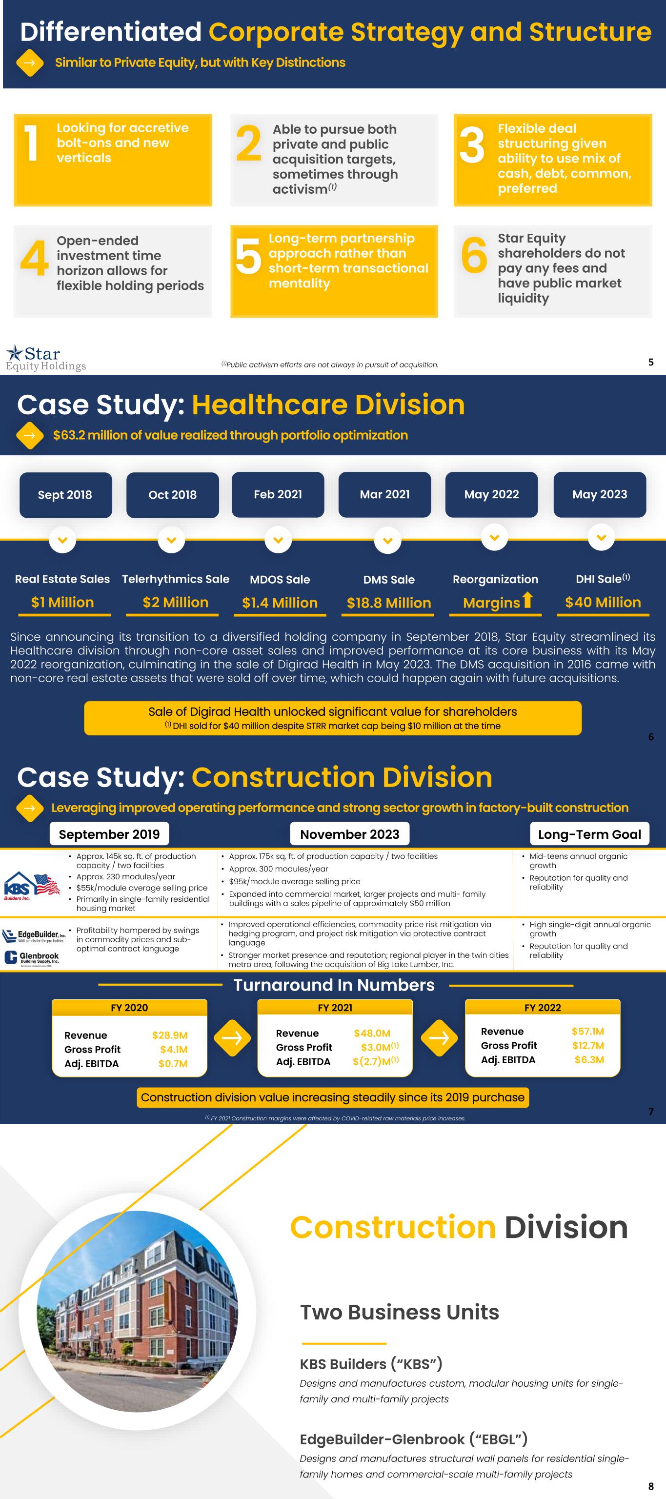 5 Differentiated Corporate Strategy and Structure Looking for accretive bolt-ons and new verticals Able to pursue both private and public acquisition targets, sometimes through activism(1) Flexible deal structuring given ability to use mix of cash, debt, common, preferred Open-ended investment time horizon allows for flexible holding periods Long-term partnership approach rather than short-term transactional mentality Star Equity shareholders do not pay any fees and have public market liquidity 1 2 3 4 5 6 (1)Public activism efforts are not always in pursuit of acquisition. Similar to Private Equity, but with Key Distinctions 6 Case Study: Healthcare Division Feb 2021 Mar 2021 May 2022 May 2023 Real Estate Sales $1 Million Sept 2018 Oct 2018 Telerhythmics Sale $2 Million Reorganization Margins DMS Sale $18.8 Million MDOS Sale $1.4 Million DHI Sale(1) $40 Million Since announcing its transition to a diversified holding company in September 2018, Star Equity streamlined its Healthcare division through non-core asset sales and improved performance at its core business with its May 2022 reorganization, culminating in the sale of Digirad Health in May 2023. The DMS acquisition in 2016 came with non-core real estate assets that were sold off over time, which could happen again with future acquisitions. $63.2 million of value realized through portfolio optimization Sale of Digirad Health unlocked significant value for shareholders (1) DHI sold for $40 million despite STRR market cap being $10 million at the time 7 Case Study: Construction Division November 2023 Long-Term GoalSeptember 2019 • Approx. 145k sq. ft. of production capacity / two facilities • Approx. 230 modules/year • $55k/module average selling price • Primarily in single-family residential housing market • Approx. 175k sq. ft. of production capacity / two facilities • Approx. 300 modules/year • $95k/module average selling price • Expanded into commercial market, larger projects and multi- family buildings with a sales pipeline of approximately $50 million • Mid-teens annual organic growth • Reputation for quality and reliability • Profitability hampered by swings in commodity prices and sub- optimal contract language • Improved operational efficiencies, commodity price risk mitigation via hedging program, and project risk mitigation via protective contract language • Stronger market presence and reputation; regional player in the twin cities metro area, following the acquisition of Big Lake Lumber, Inc. • High single-digit annual organic growth • Reputation for quality and reliability Turnaround In Numbers FY 2020 FY 2021 FY 2022 Revenue $28.9M Gross Profit $4.1M Adj. EBITDA $0.7M Revenue $48.0M Gross Profit $3.0M(1) Adj. EBITDA $(2.7)M(1) Revenue $57.1M Gross Profit $12.7M Adj. EBITDA $6.3M (1) FY 2021 Construction margins were affected by COVID-related raw materials price increases. Leveraging improved operating performance and strong sector growth in factory-built construction Construction division value increasing steadily since its 2019 purchase 8 Construction Division Two Business Units KBS Builders (“KBS”) Designs and manufactures custom, modular housing units for single- family and multi-family projects EdgeBuilder-Glenbrook (“EBGL”) Designs and manufactures structural wall panels for residential single- family homes and commercial-scale multi-family projects