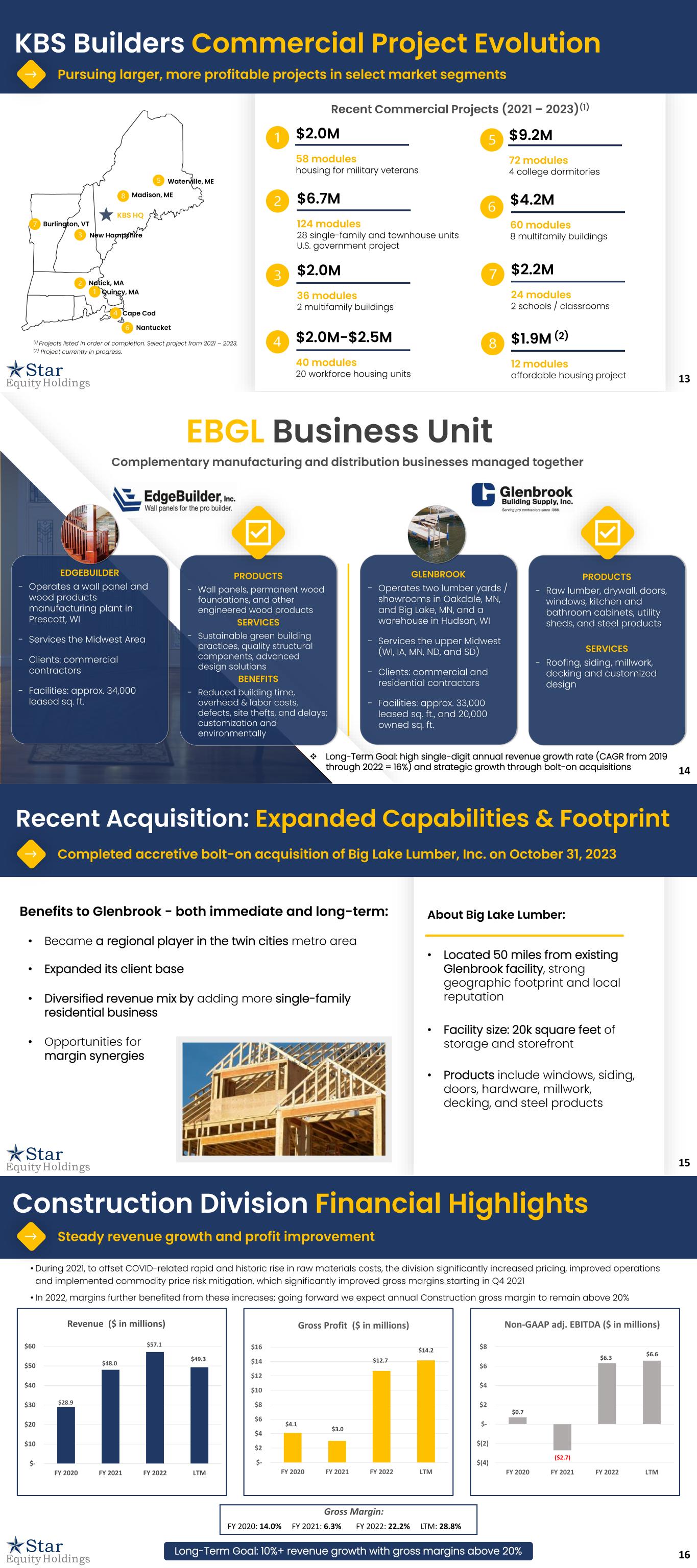 13 KBS Builders Commercial Project Evolution Pursuing larger, more profitable projects in select market segments $2.0M 58 modules housing for military veterans $6.7M 124 modules 28 single-family and townhouse units U.S. government project $2.0M 36 modules 2 multifamily buildings $2.0M-$2.5M 40 modules 20 workforce housing units $9.2M 72 modules 4 college dormitories $4.2M 60 modules 8 multifamily buildings (1) Projects listed in order of completion. Select project from 2021 – 2023. (2) Project currently in progress. $2.2M 24 modules 2 schools / classrooms Waterville, ME New Hampshire Burlington, VT Quincy, MA Cape Cod Nantucket Natick, MA KBS HQ $1.9M (2) 12 modules affordable housing project Madison, ME Recent Commercial Projects (2021 – 2023)(1) 14 EBGL Business Unit Complementary manufacturing and distribution businesses managed together ❖ Long-Term Goal: high single-digit annual revenue growth rate (CAGR from 2019 through 2022 = 16%) and strategic growth through bolt-on acquisitions GLENBROOK - Operates two lumber yards / showrooms in Oakdale, MN, and Big Lake, MN, and a warehouse in Hudson, WI - Services the upper Midwest (WI, IA, MN, ND, and SD) - Clients: commercial and residential contractors - Facilities: approx. 33,000 leased sq. ft., and 20,000 owned sq. ft. EDGEBUILDER - Operates a wall panel and wood products manufacturing plant in Prescott, WI - Services the Midwest Area - Clients: commercial contractors - Facilities: approx. 34,000 leased sq. ft. PRODUCTS - Wall panels, permanent wood foundations, and other engineered wood products SERVICES - Sustainable green building practices, quality structural components, advanced design solutions BENEFITS - Reduced building time, overhead & labor costs, defects, site thefts, and delays; customization and environmentally PRODUCTS - Raw lumber, drywall, doors, windows, kitchen and bathroom cabinets, utility sheds, and steel products SERVICES - Roofing, siding, millwork, decking and customized design 15 Recent Acquisition: Expanded Capabilities & Footprint Completed accretive bolt-on acquisition of Big Lake Lumber, Inc. on October 31, 2023 About Big Lake Lumber: • Located 50 miles from existing Glenbrook facility, strong geographic footprint and local reputation • Facility size: 20k square feet of storage and storefront • Products include windows, siding, doors, hardware, millwork, decking, and steel products Benefits to Glenbrook - both immediate and long-term: • Became a regional player in the twin cities metro area • Expanded its client base • Diversified revenue mix by adding more single-family residential business • Opportunities for margin synergies 16 Construction Division Financial Highlights $28.9 $48.0 $57.1 $49.3 $- $10 $20 $30 $40 $50 $60 FY 2020 FY 2021 FY 2022 LTM Revenue ($ in millions) $4.1 $3.0 $12.7 $14.2 $- $2 $4 $6 $8 $10 $12 $14 $16 FY 2020 FY 2021 FY 2022 LTM Gross Profit ($ in millions) $0.7 ($2.7) $6.3 $6.6 $(4) $(2) $- $2 $4 $6 $8 FY 2020 FY 2021 FY 2022 LTM Non-GAAP adj. EBITDA ($ in millions) • During 2021, to offset COVID-related rapid and historic rise in raw materials costs, the division significantly increased pricing, improved operations and implemented commodity price risk mitigation, which significantly improved gross margins starting in Q4 2021 • In 2022, margins further benefited from these increases; going forward we expect annual Construction gross margin to remain above 20% Steady revenue growth and profit improvement Long-Term Goal: 10%+ revenue growth with gross margins above 20% Gross Margin: FY 2020: 14.0% FY 2021: 6.3% FY 2022: 22.2% LTM: 28.8%