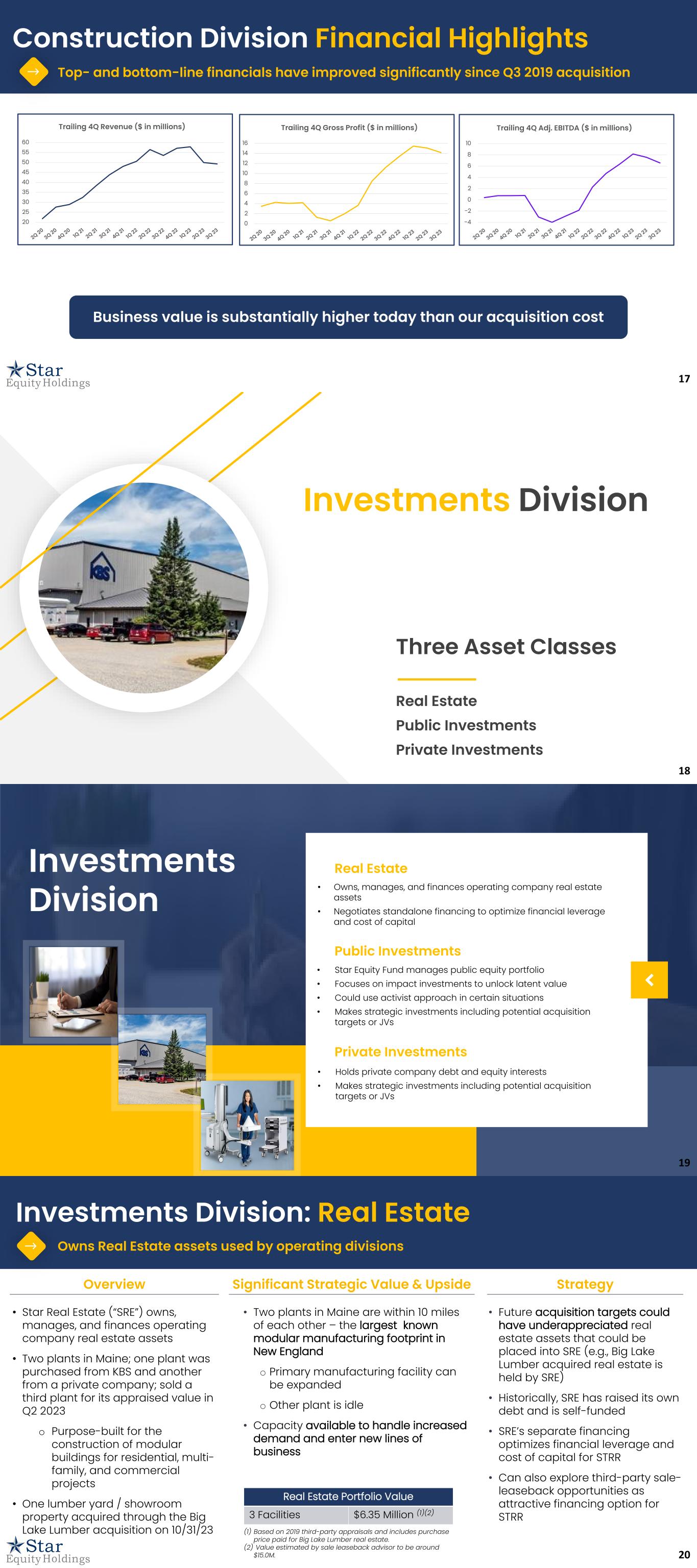 17 Construction Division Financial Highlights Top- and bottom-line financials have improved significantly since Q3 2019 acquisition 20 25 30 35 40 45 50 55 60 Trailing 4Q Revenue ($ in millions) 0 2 4 6 8 10 12 14 16 Trailing 4Q Gross Profit ($ in millions) -4 -2 0 2 4 6 8 10 Trailing 4Q Adj. EBITDA ($ in millions) Business value is substantially higher today than our acquisition cost 18 Three Asset Classes Real Estate Public Investments Private Investments Investments Division 19 Investments Division Real Estate • Star Equity Fund manages public equity portfolio • Focuses on impact investments to unlock latent value • Could use activist approach in certain situations • Makes strategic investments including potential acquisition targets or JVs • Owns, manages, and finances operating company real estate assets • Negotiates standalone financing to optimize financial leverage and cost of capital Public Investments Private Investments • Holds private company debt and equity interests • Makes strategic investments including potential acquisition targets or JVs 20 Investments Division: Real Estate Real Estate Portfolio Value 3 Facilities $6.35 Million (1)(2) (1) Based on 2019 third-party appraisals and includes purchase price paid for Big Lake Lumber real estate. (2) Value estimated by sale leaseback advisor to be around $15.0M. Owns Real Estate assets used by operating divisions Overview • Star Real Estate (“SRE”) owns, manages, and finances operating company real estate assets • Two plants in Maine; one plant was purchased from KBS and another from a private company; sold a third plant for its appraised value in Q2 2023 o Purpose-built for the construction of modular buildings for residential, multi- family, and commercial projects • One lumber yard / showroom property acquired through the Big Lake Lumber acquisition on 10/31/23 Significant Strategic Value & Upside • Two plants in Maine are within 10 miles of each other – the largest known modular manufacturing footprint in New England o Primary manufacturing facility can be expanded o Other plant is idle • Capacity available to handle increased demand and enter new lines of business Strategy • Future acquisition targets could have underappreciated real estate assets that could be placed into SRE (e.g., Big Lake Lumber acquired real estate is held by SRE) • Historically, SRE has raised its own debt and is self-funded • SRE’s separate financing optimizes financial leverage and cost of capital for STRR • Can also explore third-party sale- leaseback opportunities as attractive financing option for STRR