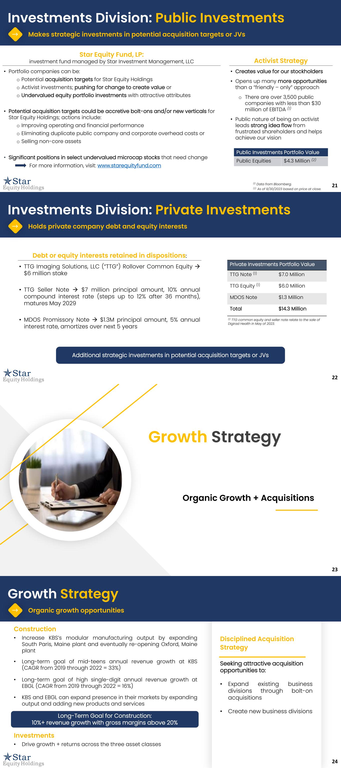 21 Star Equity Fund, LP: investment fund managed by Star Investment Management, LLC Investments Division: Public Investments • Portfolio companies can be: o Potential acquisition targets for Star Equity Holdings o Activist investments; pushing for change to create value or o Undervalued equity portfolio investments with attractive attributes • Potential acquisition targets could be accretive bolt-ons and/or new verticals for Star Equity Holdings; actions include: o Improving operating and financial performance o Eliminating duplicate public company and corporate overhead costs or o Selling non-core assets • Significant positions in select undervalued microcap stocks that need change For more information, visit: www.starequityfund.com Makes strategic investments in potential acquisition targets or JVs Public Investments Portfolio Value Public Equities $4.3 Million (2) Activist Strategy • Creates value for our stockholders • Opens up many more opportunities than a “friendly – only” approach o There are over 3,500 public companies with less than $30 million of EBITDA (1) • Public nature of being an activist leads strong idea flow from frustrated shareholders and helps achieve our vision (1) Data from Bloomberg. (2) As of 9/30/2023 based on price at close. 22 Investments Division: Private Investments Private Investments Portfolio Value TTG Note (1) $7.0 Million TTG Equity (1) $6.0 Million MDOS Note $1.3 Million Total $14.3 Million Holds private company debt and equity interests Debt or equity interests retained in dispositions: • TTG Imaging Solutions, LLC (“TTG”) Rollover Common Equity → $6 million stake • TTG Seller Note → $7 million principal amount, 10% annual compound interest rate (steps up to 12% after 36 months), matures May 2029 • MDOS Promissory Note → $1.3M principal amount, 5% annual interest rate, amortizes over next 5 years Additional strategic investments in potential acquisition targets or JVs (1) TTG common equity and seller note relate to the sale of Digirad Health in May of 2023. 23 Growth Strategy Organic Growth + Acquisitions 24 Disciplined Acquisition Strategy Seeking attractive acquisition opportunities to: • Expand existing business divisions through bolt-on acquisitions • Create new business divisions Construction • Increase KBS’s modular manufacturing output by expanding South Paris, Maine plant and eventually re-opening Oxford, Maine plant • Long-term goal of mid-teens annual revenue growth at KBS (CAGR from 2019 through 2022 = 33%) • Long-term goal of high single-digit annual revenue growth at EBGL (CAGR from 2019 through 2022 = 16%) • KBS and EBGL can expand presence in their markets by expanding output and adding new products and services Investments • Drive growth + returns across the three asset classes Growth Strategy Organic growth opportunities Long-Term Goal for Construction: 10%+ revenue growth with gross margins above 20%