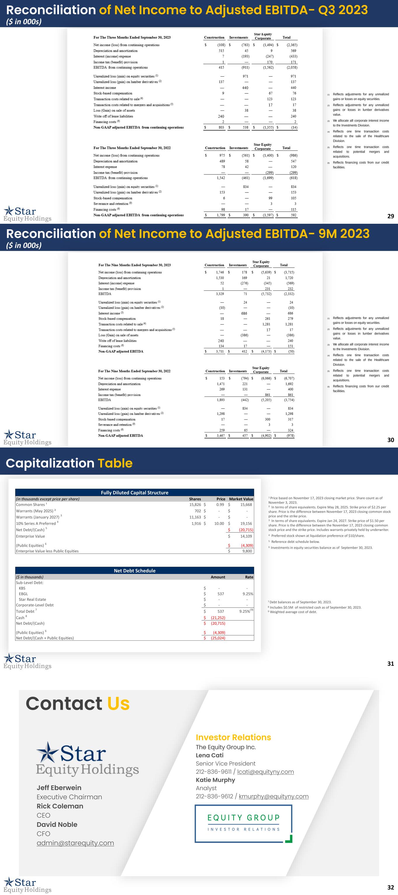 29 Reconciliation of Net Income to Adjusted EBITDA- Q3 2023 ($ in 000s) (1) Reflects adjustments for any unrealized gains or losses on equity securities. (2) Reflects adjustments for any unrealized gains or losses in lumber derivatives value. (3) We allocate all corporate interest income to the Investments Division. (4) Reflects one time transaction costs related to the sale of the Healthcare Division. (5) Reflects one time transaction costs related to potential mergers and acquisitions. (6) Reflects financing costs from our credit facilities. 30 Reconciliation of Net Income to Adjusted EBITDA- 9M 2023 ($ in 000s) (1) Reflects adjustments for any unrealized gains or losses on equity securities. (2) Reflects adjustments for any unrealized gains or losses in lumber derivatives value. (3) We allocate all corporate interest income to the Investments Division. (4) Reflects one time transaction costs related to the sale of the Healthcare Division. (5) Reflects one time transaction costs related to potential mergers and acquisitions. (6) Reflects financing costs from our credit facilities. 31 Capitalization Table 7 Debt balances as of September 30, 2023. 8 Includes $0.5M of restricted cash as of September 30, 2023. 9 Weighted average cost of debt. 1 Price based on November 17, 2023 closing market price. Share count as of November 3, 2023. ² In terms of share equivalents. Expire May 28, 2025. Strike price of $2.25 per share. Price is the difference between November 17, 2023 closing common stock price and the strike price. 3 In terms of share equivalents. Expire Jan 24, 2027. Strike price of $1.50 per share. Price is the difference between the November 17, 2023 closing common stock price and the strike price. Includes warrants privately held by underwriter. 4 Preferred stock shown at liquidation preference of $10/share. 5 Reference debt schedule below. 6 Investments in equity securities balance as of September 30, 2023. ($ in thousands) Amount Rate Sub-Level Debt: KBS -$ - EBGL 537$ 9.25% Star Real Estate -$ - Corporate-Level Debt -$ - Total Debt 7 537$ 9.25% (9) Cash 8 (21,252)$ Net Debt/(Cash) (20,715)$ (Public Equities) 6 (4,309)$ Net Debt/(Cash + Public Equities) (25,024)$ Net Debt Schedule (in thousands except price per share) Shares Price Market Value Common Shares ¹ 15,826 0.99$ 15,668$ Warrants (May 2025) ² 702 -$ -$ Warrants (January 2027) 3 11,163 -$ -$ 10% Series A Preferred 4 1,916 10.00$ 19,156$ Net Debt/(Cash) 5 (20,715)$ Enterprise Value 14,109$ (Public Equities) 6 (4,309)$ Enterprise Value less Public Equities 9,800$ Fully Diluted Capital Structure 32 Jeff Eberwein Executive Chairman Rick Coleman CEO David Noble CFO admin@starequity.com Investor Relations The Equity Group Inc. Lena Cati Senior Vice President 212-836-9611 / lcati@equityny.com Katie Murphy Analyst 212-836-9612 / kmurphy@equityny.com Contact Us