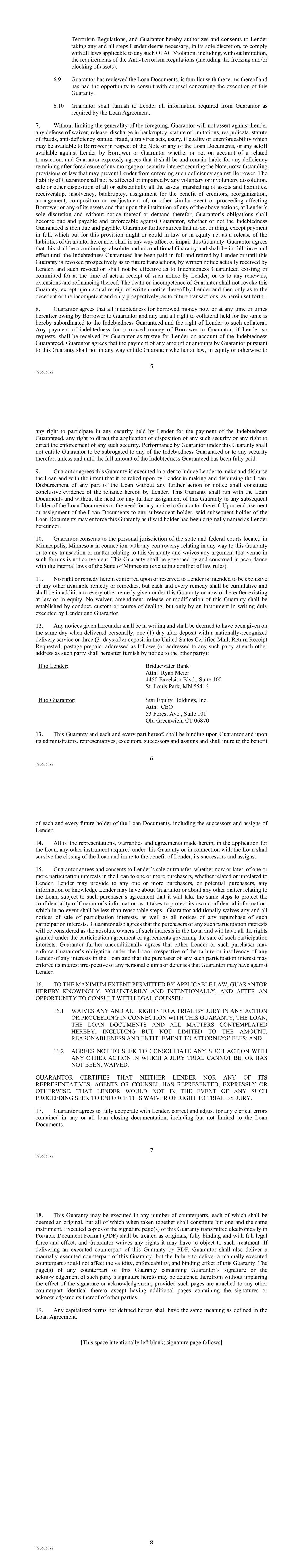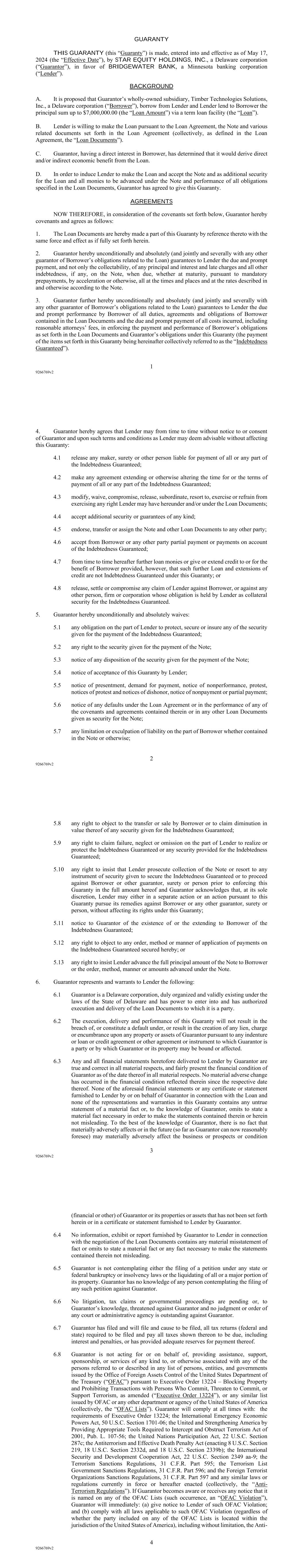 1 9266769v2 GUARANTY THIS GUARANTY (this “Guaranty”) is made, entered into and effective as of May 17, 2024 (the “Effective Date”), by STAR EQUITY HOLDINGS, INC., a Delaware corporation (“Guarantor”), in favor of BRIDGEWATER BANK, a Minnesota banking corporation (“Lender”). BACKGROUND A. It is proposed that Guarantor’s wholly-owned subsidiary, Timber Technologies Solutions, Inc., a Delaware corporation (“Borrower”), borrow from Lender and Lender lend to Borrower the principal sum up to $7,000,000.00 (the “Loan Amount”) via a term loan facility (the “Loan”). B. Lender is willing to make the Loan pursuant to the Loan Agreement, the Note and various related documents set forth in the Loan Agreement (collectively, as defined in the Loan Agreement, the “Loan Documents”). C. Guarantor, having a direct interest in Borrower, has determined that it would derive direct and/or indirect economic benefit from the Loan. D. In order to induce Lender to make the Loan and accept the Note and as additional security for the Loan and all monies to be advanced under the Note and performance of all obligations specified in the Loan Documents, Guarantor has agreed to give this Guaranty. AGREEMENTS NOW THEREFORE, in consideration of the covenants set forth below, Guarantor hereby covenants and agrees as follows: 1. The Loan Documents are hereby made a part of this Guaranty by reference thereto with the same force and effect as if fully set forth herein. 2. Guarantor hereby unconditionally and absolutely (and jointly and severally with any other guarantor of Borrower’s obligations related to the Loan) guarantees to Lender the due and prompt payment, and not only the collectability, of any principal and interest and late charges and all other indebtedness, if any, on the Note, when due, whether at maturity, pursuant to mandatory prepayments, by acceleration or otherwise, all at the times and places and at the rates described in and otherwise according to the Note. 3. Guarantor further hereby unconditionally and absolutely (and jointly and severally with any other guarantor of Borrower’s obligations related to the Loan) guarantees to Lender the due and prompt performance by Borrower of all duties, agreements and obligations of Borrower contained in the Loan Documents and the due and prompt payment of all costs incurred, including reasonable attorneys’ fees, in enforcing the payment and performance of Borrower’s obligations as set forth in the Loan Documents and Guarantor’s obligations under this Guaranty (the payment of the items set forth in this Guaranty being hereinafter collectively referred to as the “Indebtedness Guaranteed”). 2 9266769v2 4. Guarantor hereby agrees that Lender may from time to time without notice to or consent of Guarantor and upon such terms and conditions as Lender may deem advisable without affecting this Guaranty: 4.1 release any maker, surety or other person liable for payment of all or any part of the Indebtedness Guaranteed; 4.2 make any agreement extending or otherwise altering the time for or the terms of payment of all or any part of the Indebtedness Guaranteed; 4.3 modify, waive, compromise, release, subordinate, resort to, exercise or refrain from exercising any right Lender may have hereunder and/or under the Loan Documents; 4.4 accept additional security or guarantees of any kind; 4.5 endorse, transfer or assign the Note and other Loan Documents to any other party; 4.6 accept from Borrower or any other party partial payment or payments on account of the Indebtedness Guaranteed; 4.7 from time to time hereafter further loan monies or give or extend credit to or for the benefit of Borrower provided, however, that such further Loan and extensions of credit are not Indebtedness Guaranteed under this Guaranty; or 4.8 release, settle or compromise any claim of Lender against Borrower, or against any other person, firm or corporation whose obligation is held by Lender as collateral security for the Indebtedness Guaranteed. 5. Guarantor hereby unconditionally and absolutely waives: 5.1 any obligation on the part of Lender to protect, secure or insure any of the security given for the payment of the Indebtedness Guaranteed; 5.2 any right to the security given for the payment of the Note; 5.3 notice of any disposition of the security given for the payment of the Note; 5.4 notice of acceptance of this Guaranty by Lender; 5.5 notice of presentment, demand for payment, notice of nonperformance, protest, notices of protest and notices of dishonor, notice of nonpayment or partial payment; 5.6 notice of any defaults under the Loan Agreement or in the performance of any of the covenants and agreements contained therein or in any other Loan Documents given as security for the Note; 5.7 any limitation or exculpation of liability on the part of Borrower whether contained in the Note or otherwise; 3 9266769v2 5.8 any right to object to the transfer or sale by Borrower or to claim diminution in value thereof of any security given for the Indebtedness Guaranteed; 5.9 any right to claim failure, neglect or omission on the part of Lender to realize or protect the Indebtedness Guaranteed or any security provided for the Indebtedness Guaranteed; 5.10 any right to insist that Lender prosecute collection of the Note or resort to any instrument of security given to secure the Indebtedness Guaranteed or to proceed against Borrower or other guarantor, surety or person prior to enforcing this Guaranty in the full amount hereof and Guarantor acknowledges that, at its sole discretion, Lender may either in a separate action or an action pursuant to this Guaranty pursue its remedies against Borrower or any other guarantor, surety or person, without affecting its rights under this Guaranty; 5.11 notice to Guarantor of the existence of or the extending to Borrower of the Indebtedness Guaranteed; 5.12 any right to object to any order, method or manner of application of p