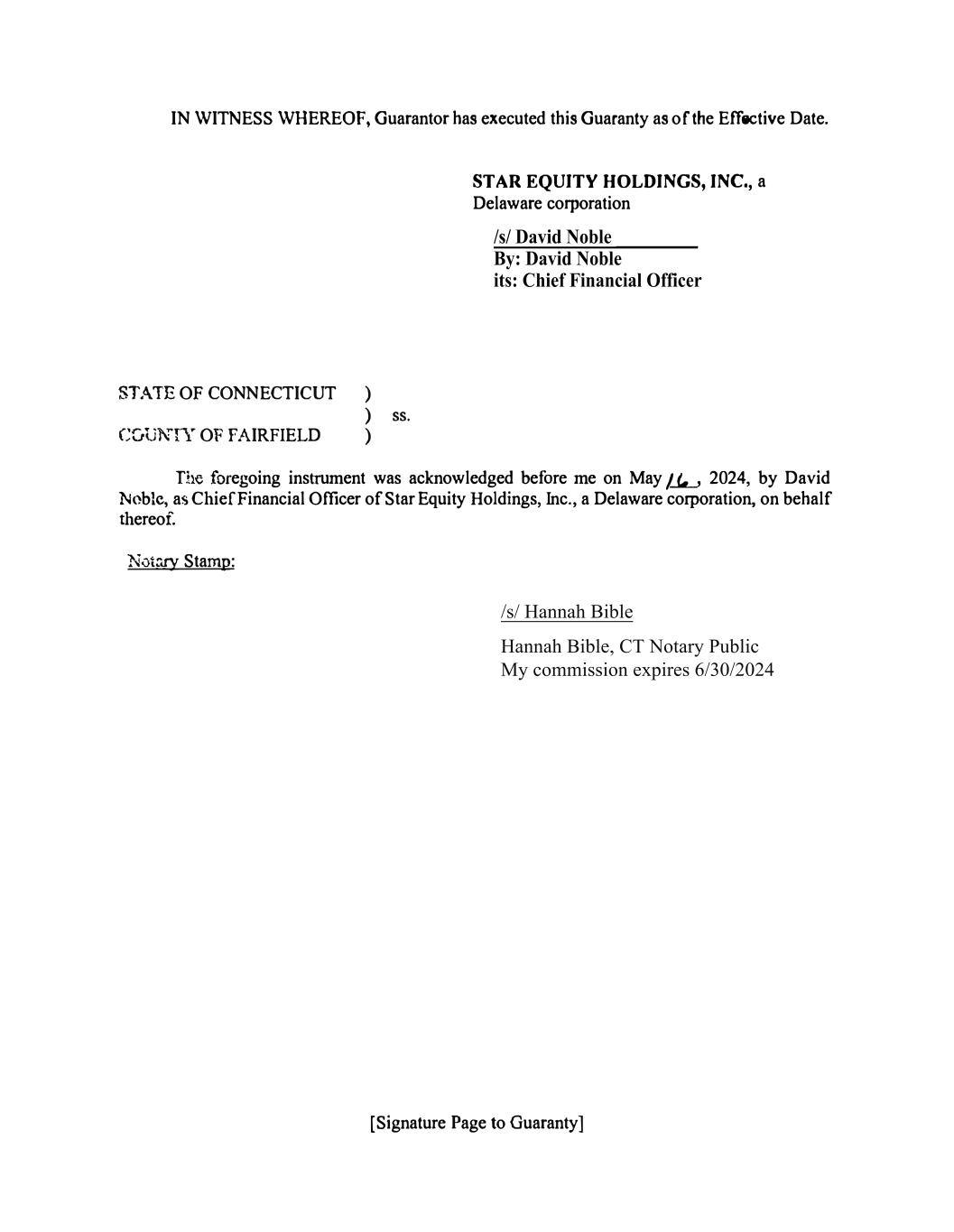 IN WITNESS WHEREOF, Guarantor has executed this Guaranty as of the Effective Date. STATE OF CONNECTICUT ) ) ss. C0l])\TTY OF FAIRFIELD ) STAR EQUITY HOLDINGS, INC., a Delaware col])oration The foregoing instrument was acknowledged before me on May /-1-, 2024, by David Noble, as Chief Financial Officer of Star Equity Holdings, Inc., a Delaware col])oration, on behalf thereof. Nvtmy Stamp: [Signature Page to Guaranty] /s/ Hannah Bible Hannah Bible, CT Notary Public My commission expires 6/30/2024 /s/ David Noble _________ By: David Noble its: Chief Financial Officer