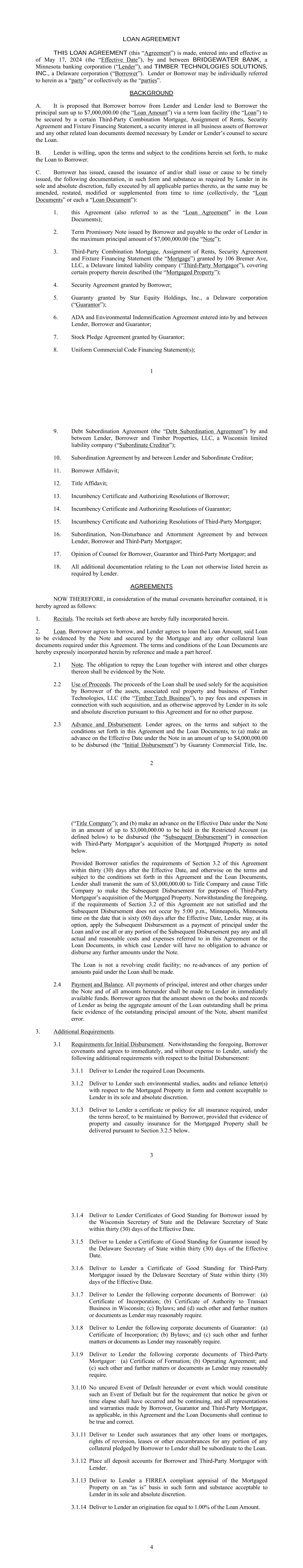 1 LOAN AGREEMENT THIS LOAN AGREEMENT (this “Agreement”) is made, entered into and effective as of May 17, 2024 (the “Effective Date”), by and between BRIDGEWATER BANK, a Minnesota banking corporation (“Lender”), and TIMBER TECHNOLOGIES SOLUTIONS, INC., a Delaware corporation (“Borrower”). Lender or Borrower may be individually referred to herein as a “party” or collectively as the “parties”. BACKGROUND A. It is proposed that Borrower borrow from Lender and Lender lend to Borrower the principal sum up to $7,000,000.00 (the “Loan Amount”) via a term loan facility (the “Loan”) to be secured by a certain Third-Party Combination Mortgage, Assignment of Rents, Security Agreement and Fixture Financing Statement, a security interest in all business assets of Borrower and any other related loan documents deemed necessary by Lender or Lender’s counsel to secure the Loan. B. Lender is willing, upon the terms and subject to the conditions herein set forth, to make the Loan to Borrower. C. Borrower has issued, caused the issuance of and/or shall issue or cause to be timely issued, the following documentation, in such form and substance as required by Lender in its sole and absolute discretion, fully executed by all applicable parties thereto, as the same may be amended, restated, modified or supplemented from time to time (collectively, the “Loan Documents” or each a “Loan Document”): 1. this Agreement (also referred to as the “Loan Agreement” in the Loan Documents); 2. Term Promissory Note issued by Borrower and payable to the order of Lender in the maximum principal amount of $7,000,000.00 (the “Note”); 3. Third-Party Combination Mortgage, Assignment of Rents, Security Agreement and Fixture Financing Statement (the “Mortgage”) granted by 106 Bremer Ave, LLC, a Delaware limited liability company (“Third-Party Mortgagor”), covering certain property therein described (the “Mortgaged Property”); 4. Security Agreement granted by Borrower; 5. Guaranty granted by Star Equity Holdings, Inc., a Delaware corporation (“Guarantor”); 6. ADA and Environmental Indemnification Agreement entered into by and between Lender, Borrower and Guarantor; 7. Stock Pledge Agreement granted by Guarantor; 8. Uniform Commercial Code Financing Statement(s); 2 9. Debt Subordination Agreement (the “Debt Subordination Agreement”) by and between Lender, Borrower and Timber Properties, LLC, a Wisconsin limited liability company (“Subordinate Creditor”); 10. Subordination Agreement by and between Lender and Subordinate Creditor; 11. Borrower Affidavit; 12. Title Affidavit; 13. Incumbency Certificate and Authorizing Resolutions of Borrower; 14. Incumbency Certificate and Authorizing Resolutions of Guarantor; 15. Incumbency Certificate and Authorizing Resolutions of Third-Party Mortgagor; 16. Subordination, Non-Disturbance and Attornment Agreement by and between Lender, Borrower and Third-Party Mortgagor; 17. Opinion of Counsel for Borrower, Guarantor and Third-Party Mortgagor; and 18. All additional documentation relating to the Loan not otherwise listed herein as required by Lender. AGREEMENTS NOW THEREFORE, in consideration of the mutual covenants hereinafter contained, it is hereby agreed as follows: 1. Recitals. The recitals set forth above are hereby fully incorporated herein. 2. Loan. Borrower agrees to borrow, and Lender agrees to loan the Loan Amount, said Loan to be evidenced by the Note and secured by the Mortgage and any other collateral loan documents required under this Agreement. The terms and conditions of the Loan Documents are hereby expressly incorporated herein by reference and made a part hereof. 2.1 Note. The obligation to repay the Loan together with interest and other charges thereon shall be evidenced by the Note. 2.2 Use of Proceeds. The proceeds of the Loan shall be used solely for the acquisition by Borrower of the assets, associated real property and business of Timber Technologies, LLC (the “Timber Tech Business”), to pay fees and expenses in connection with such acquisition, and as otherwise approved by Lender in its sole and absolute discretion pursuant to this Agreement and for no other purpose. 2.3 Advance and Disbursement. Lender agrees, on the terms and subject to the conditions set forth in this Agreement and the Loan Documents, to (a) make an advance on the Effective Date under the Note in an amount of up to $4,000,000.00 to be disbursed (the “Initial Disbursement”) by Guaranty Commercial Title, Inc. 3 (“Title Company”); and (b) make an advance on the Effective Date under the Note in an amount of up to $3,000,000.00 to be held in the Restricted Account (as defined below) to be disbursed (the “Subsequent Disbursement”) in connection with Third-Party Mortgagor’s acquisition of the Mortgaged Property as noted below. Provided Borrower satisfies the requirements of Section 3.2 of this Agreement within thirty (30) days after the Effective Date, and otherwise on the terms and subject to the conditions set forth in this Agreement and the Loan Documents, Lender shall transmit the sum of $3,000,000.00 to Title Company and cause Title Company to make the Subsequent Disbursement for purposes of Third-Party Mortgagor’s acquisition of the Mortgaged Property. Notwithstanding the foregoing, if the requirements of Section 3.2 of this Agreement are not satisfied and the Subsequent Disbursement does not occur by 5:00 p.m., Minneapolis, Minnesota time on the date that is sixty (60) days after the Effective Date, Lender may, at its option, apply the Subsequent Disbursement as a payment of principal under the Loan and/or use all or any portion of the Subsequent Disbursement pay any and all actual and reasonable costs and expenses referred to in this Agreement or the Loan Documents, in which case Lender will have no obligation to advance or disburse any further amounts under the Note. The Loan is not a revolving credit facility; 