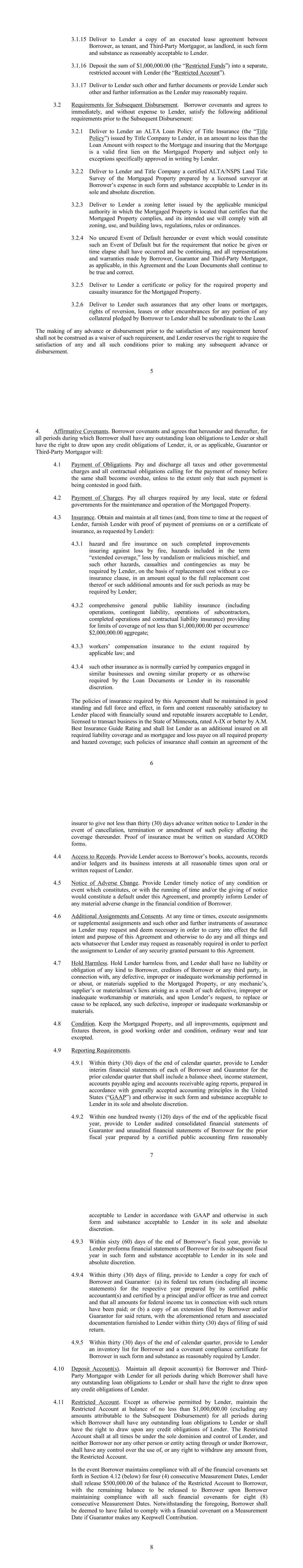 5 3.1.15 Deliver to Lender a copy of an executed lease agreement between Borrower, as tenant, and Third-Party Mortgagor, as landlord, in such form and substance as reasonably acceptable to Lender. 3.1.16 Deposit the sum of $1,000,000.00 (the “Restricted Funds”) into a separate, restricted account with Lender (the “Restricted Account”). 3.1.17 Deliver to Lender such other and further documents or provide Lender such other and further information as the Lender may reasonably require. 3.2 Requirements for Subsequent Disbursement. Borrower covenants and agrees to immediately, and without expense to Lender, satisfy the following additional requirements prior to the Subsequent Disbursement: 3.2.1 Deliver to Lender an ALTA Loan Policy of Title Insurance (the “Title Policy”) issued by Title Company to Lender, in an amount no less than the Loan Amount with respect to the Mortgage and insuring that the Mortgage is a valid first lien on the Mortgaged Property and subject only to exceptions specifically approved in writing by Lender. 3.2.2 Deliver to Lender and Title Company a certified ALTA/NSPS Land Title Survey of the Mortgaged Property prepared by a licensed surveyor at Borrower’s expense in such form and substance acceptable to Lender in its sole and absolute discretion. 3.2.3 Deliver to Lender a zoning letter issued by the applicable municipal authority in which the Mortgaged Property is located that certifies that the Mortgaged Property complies, and its intended use will comply with all zoning, use, and building laws, regulations, rules or ordinances. 3.2.4 No uncured Event of Default hereunder or event which would constitute such an Event of Default but for the requirement that notice be given or time elapse shall have occurred and be continuing, and all representations and warranties made by Borrower, Guarantor and Third-Party Mortgagor, as applicable, in this Agreement and the Loan Documents shall continue to be true and correct. 3.2.5 Deliver to Lender a certificate or policy for the required property and casualty insurance for the Mortgaged Property. 3.2.6 Deliver to Lender such assurances that any other loans or mortgages, rights of reversion, leases or other encumbrances for any portion of any collateral pledged by Borrower to Lender shall be subordinate to the Loan The making of any advance or disbursement prior to the satisfaction of any requirement hereof shall not be construed as a waiver of such requirement, and Lender reserves the right to require the satisfaction of any and all such conditions prior to making any subsequent advance or disbursement. 6 4. Affirmative Covenants. Borrower covenants and agrees that hereunder and thereafter, for all periods during which Borrower shall have any outstanding loan obligations to Lender or shall have the right to draw upon any credit obligations of Lender, it, or as applicable, Guarantor or Third-Party Mortgagor will: 4.1 Payment of Obligations. Pay and discharge all taxes and other governmental charges and all contractual obligations calling for the payment of money before the same shall become overdue, unless to the extent only that such payment is being contested in good faith. 4.2 Payment of Charges. Pay all charges required by any local, state or federal governments for the maintenance and operation of the Mortgaged Property. 4.3 Insurance. Obtain and maintain at all times (and, from time to time at the request of Lender, furnish Lender with proof of payment of premiums on or a certificate of insurance, as requested by Lender): 4.3.1 hazard and fire insurance on such completed improvements insuring against loss by fire, hazards included in the term “extended coverage,” loss by vandalism or malicious mischief, and such other hazards, casualties and contingencies as may be required by Lender, on the basis of replacement cost without a co- insurance clause, in an amount equal to the full replacement cost thereof or such additional amounts and for such periods as may be required by Lender; 4.3.2 comprehensive general public liability insurance (including operations, contingent liability, operations of subcontractors, completed operations and contractual liability insurance) providing for limits of coverage of not less than $1,000,000.00 per occurrence/ $2,000,000.00 aggregate; 4.3.3 workers’ compensation insurance to the extent required by applicable law; and 4.3.4 such other insurance as is normally carried by companies engaged in similar businesses and owning similar property or as otherwise required by the Loan Documents or Lender in its reasonable discretion. The policies of insurance required by this Agreement shall be maintained in good standing and full force and effect, in form and content reasonably satisfactory to Lender placed with financially sound and reputable insurers acceptable to Lender, licensed to transact business in the State of Minnesota, rated A-IX or better by A.M. Best Insurance Guide Rating and shall list Lender as an additional insured on all required liability coverage and as mortgagee and loss payee on all required property and hazard coverage; such policies of insurance shall contain an agreement of the 7 insurer to give not less than thirty (30) days advance written notice to Lender in the event of cancellation, termination or amendment of such policy affecting the coverage thereunder. Proof of insurance must be written on standard ACORD forms. 4.4 Access to Records. Provide Lender access to Borrower’s books, accounts, records and/or ledgers and its business interests at all reasonable times upon oral or written request of Lender. 4.5 Notice of Adverse Change. Provide Lender timely notice of any condition or event which constitutes, or with the running of time and/or the giving of notice would constitute a default under this Agreement, and promptly inform Lender of any material adverse change in the financial condition of Borrower. 4.6 Additional Assignments and Consents. At any time o