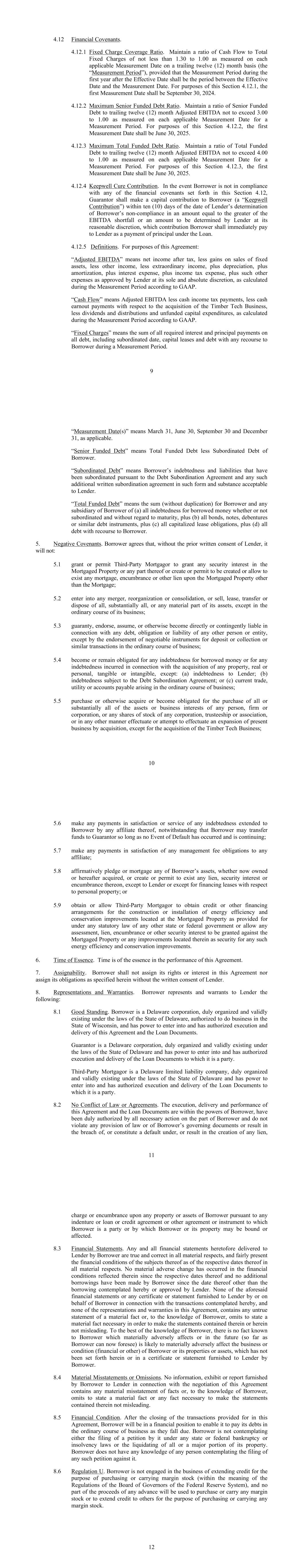 9 4.12 Financial Covenants. 4.12.1 Fixed Charge Coverage Ratio. Maintain a ratio of Cash Flow to Total Fixed Charges of not less than 1.30 to 1.00 as measured on each applicable Measurement Date on a trailing twelve (12) month basis (the “Measurement Period”), provided that the Measurement Period during the first year after the Effective Date shall be the period between the Effective Date and the Measurement Date. For purposes of this Section 4.12.1, the first Measurement Date shall be September 30, 2024. 4.12.2 Maximum Senior Funded Debt Ratio. Maintain a ratio of Senior Funded Debt to trailing twelve (12) month Adjusted EBITDA not to exceed 3.00 to 1.00 as measured on each applicable Measurement Date for a Measurement Period. For purposes of this Section 4.12.2, the first Measurement Date shall be June 30, 2025. 4.12.3 Maximum Total Funded Debt Ratio. Maintain a ratio of Total Funded Debt to trailing twelve (12) month Adjusted EBITDA not to exceed 4.00 to 1.00 as measured on each applicable Measurement Date for a Measurement Period. For purposes of this Section 4.12.3, the first Measurement Date shall be June 30, 2025. 4.12.4 Keepwell Cure Contribution. In the event Borrower is not in compliance with any of the financial covenants set forth in this Section 4.12, Guarantor shall make a capital contribution to Borrower (a “Keepwell Contribution”) within ten (10) days of the date of Lender’s determination of Borrower’s non-compliance in an amount equal to the greater of the EBITDA shortfall or an amount to be determined by Lender at its reasonable discretion, which contribution Borrower shall immediately pay to Lender as a payment of principal under the Loan. 4.12.5 Definitions. For purposes of this Agreement: “Adjusted EBITDA” means net income after tax, less gains on sales of fixed assets, less other income, less extraordinary income, plus depreciation, plus amortization, plus interest expense, plus income tax expense, plus such other expenses as approved by Lender at its sole and absolute discretion, as calculated during the Measurement Period according to GAAP. “Cash Flow” means Adjusted EBITDA less cash income tax payments, less cash earnout payments with respect to the acquisition of the Timber Tech Business, less dividends and distributions and unfunded capital expenditures, as calculated during the Measurement Period according to GAAP. “Fixed Charges” means the sum of all required interest and principal payments on all debt, including subordinated date, capital leases and debt with any recourse to Borrower during a Measurement Period. 10 “Measurement Date(s)” means March 31, June 30, September 30 and December 31, as applicable. “Senior Funded Debt” means Total Funded Debt less Subordinated Debt of Borrower. “Subordinated Debt” means Borrower’s indebtedness and liabilities that have been subordinated pursuant to the Debt Subordination Agreement and any such additional written subordination agreement in such form and substance acceptable to Lender. “Total Funded Debt” means the sum (without duplication) for Borrower and any subsidiary of Borrower of (a) all indebtedness for borrowed money whether or not subordinated and without regard to maturity, plus (b) all bonds, notes, debentures or similar debt instruments, plus (c) all capitalized lease obligations, plus (d) all debt with recourse to Borrower. 5. Negative Covenants. Borrower agrees that, without the prior written consent of Lender, it will not: 5.1 grant or permit Third-Party Mortgagor to grant any security interest in the Mortgaged Property or any part thereof or create or permit to be created or allow to exist any mortgage, encumbrance or other lien upon the Mortgaged Property other than the Mortgage; 5.2 enter into any merger, reorganization or consolidation, or sell, lease, transfer or dispose of all, substantially all, or any material part of its assets, except in the ordinary course of its business; 5.3 guaranty, endorse, assume, or otherwise become directly or contingently liable in connection with any debt, obligation or liability of any other person or entity, except by the endorsement of negotiable instruments for deposit or collection or similar transactions in the ordinary course of business; 5.4 become or remain obligated for any indebtedness for borrowed money or for any indebtedness incurred in connection with the acquisition of any property, real or personal, tangible or intangible, except: (a) indebtedness to Lender; (b) indebtedness subject to the Debt Subordination Agreement; or (c) current trade, utility or accounts payable arising in the ordinary course of business; 5.5 purchase or otherwise acquire or become obligated for the purchase of all or substantially all of the assets or business interests of any person, firm or corporation, or any shares of stock of any corporation, trusteeship or association, or in any other manner effectuate or attempt to effectuate an expansion of present business by acquisition, except for the acquisition of the Timber Tech Business; 11 5.6 make any payments in satisfaction or service of any indebtedness extended to Borrower by any affiliate thereof, notwithstanding that Borrower may transfer funds to Guarantor so long as no Event of Default has occurred and is continuing; 5.7 make any payments in satisfaction of any management fee obligations to any affiliate; 5.8 affirmatively pledge or mortgage any of Borrower’s assets, whether now owned or hereafter acquired, or create or permit to exist any lien, security interest or encumbrance thereon, except to Lender or except for financing leases with respect to personal property; or 5.9 obtain or allow Third-Party Mortgagor to obtain credit or other financing arrangements for the construction or installation of energy efficiency and conservation improvements located at the Mortgaged Property as provided for under any statutory law of any other state or federal government or allow any ass