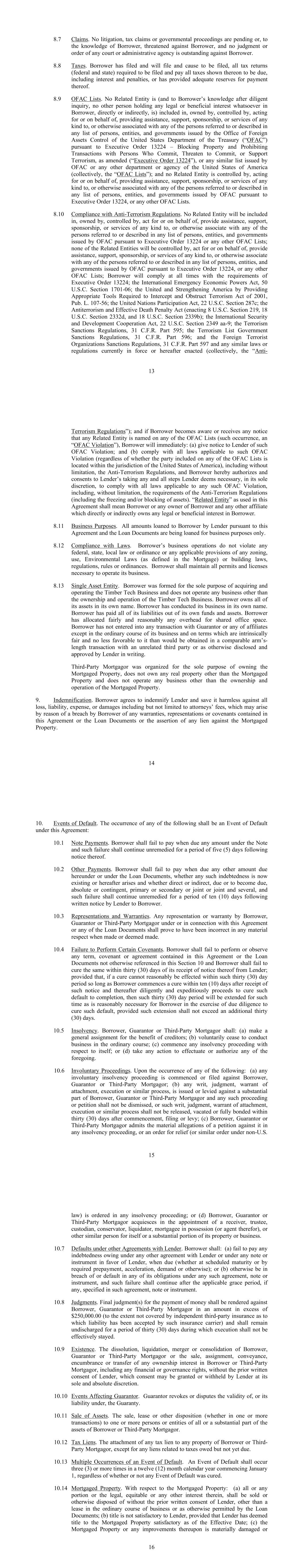 13 8.7 Claims. No litigation, tax claims or governmental proceedings are pending or, to the knowledge of Borrower, threatened against Borrower, and no judgment or order of any court or administrative agency is outstanding against Borrower. 8.8 Taxes. Borrower has filed and will file and cause to be filed, all tax returns (federal and state) required to be filed and pay all taxes shown thereon to be due, including interest and penalties, or has provided adequate reserves for payment thereof. 8.9 OFAC Lists. No Related Entity is (and to Borrower’s knowledge after diligent inquiry, no other person holding any legal or beneficial interest whatsoever in Borrower, directly or indirectly, is) included in, owned by, controlled by, acting for or on behalf of, providing assistance, support, sponsorship, or services of any kind to, or otherwise associated with any of the persons referred to or described in any list of persons, entities, and governments issued by the Office of Foreign Assets Control of the United States Department of the Treasury (“OFAC”) pursuant to Executive Order 13224 – Blocking Property and Prohibiting Transactions with Persons Who Commit, Threaten to Commit, or Support Terrorism, as amended (“Executive Order 13224”), or any similar list issued by OFAC or any other department or agency of the United States of America (collectively, the “OFAC Lists”); and no Related Entity is controlled by, acting for or on behalf of, providing assistance, support, sponsorship, or services of any kind to, or otherwise associated with any of the persons referred to or described in any list of persons, entities, and governments issued by OFAC pursuant to Executive Order 13224, or any other OFAC Lists. 8.10 Compliance with Anti-Terrorism Regulations. No Related Entity will be included in, owned by, controlled by, act for or on behalf of, provide assistance, support, sponsorship, or services of any kind to, or otherwise associate with any of the persons referred to or described in any list of persons, entities, and governments issued by OFAC pursuant to Executive Order 13224 or any other OFAC Lists; none of the Related Entities will be controlled by, act for or on behalf of, provide assistance, support, sponsorship, or services of any kind to, or otherwise associate with any of the persons referred to or described in any list of persons, entities, and governments issued by OFAC pursuant to Executive Order 13224, or any other OFAC Lists; Borrower will comply at all times with the requirements of Executive Order 13224; the International Emergency Economic Powers Act, 50 U.S.C. Section 1701-06; the United and Strengthening America by Providing Appropriate Tools Required to Intercept and Obstruct Terrorism Act of 2001, Pub. L. 107-56; the United Nations Participation Act, 22 U.S.C. Section 287c; the Antiterrorism and Effective Death Penalty Act (enacting 8 U.S.C. Section 219, 18 U.S.C. Section 2332d, and 18 U.S.C. Section 2339b); the International Security and Development Cooperation Act, 22 U.S.C. Section 2349 aa-9; the Terrorism Sanctions Regulations, 31 C.F.R. Part 595; the Terrorism List Government Sanctions Regulations, 31 C.F.R. Part 596; and the Foreign Terrorist Organizations Sanctions Regulations, 31 C.F.R. Part 597 and any similar laws or regulations currently in force or hereafter enacted (collectively, the “Anti- 14 Terrorism Regulations”); and if Borrower becomes aware or receives any notice that any Related Entity is named on any of the OFAC Lists (such occurrence, an “OFAC Violation”), Borrower will immediately: (a) give notice to Lender of such OFAC Violation; and (b) comply with all laws applicable to such OFAC Violation (regardless of whether the party included on any of the OFAC Lists is located within the jurisdiction of the United States of America), including without limitation, the Anti-Terrorism Regulations, and Borrower hereby authorizes and consents to Lender’s taking any and all steps Lender deems necessary, in its sole discretion, to comply with all laws applicable to any such OFAC Violation, including, without limitation, the requirements of the Anti-Terrorism Regulations (including the freezing and/or blocking of assets). “Related Entity” as used in this Agreement shall mean Borrower or any owner of Borrower and any other affiliate which directly or indirectly owns any legal or beneficial interest in Borrower. 8.11 Business Purposes. All amounts loaned to Borrower by Lender pursuant to this Agreement and the Loan Documents are being loaned for business purposes only. 8.12 Compliance with Laws. Borrower’s business operations do not violate any federal, state, local law or ordinance or any applicable provisions of any zoning, use, Environmental Laws (as defined in the Mortgage) or building laws, regulations, rules or ordinances. Borrower shall maintain all permits and licenses necessary to operate its business. 8.13 Single Asset Entity. Borrower was formed for the sole purpose of acquiring and operating the Timber Tech Business and does not operate any business other than the ownership and operation of the Timber Tech Business. Borrower owns all of its assets in its own name. Borrower has conducted its business in its own name. Borrower has paid all of its liabilities out of its own funds and assets. Borrower has allocated fairly and reasonably any overhead for shared office space. Borrower has not entered into any transaction with Guarantor or any of affiliates except in the ordinary course of its business and on terms which are intrinsically fair and no less favorable to it than would be obtained in a comparable arm’s- length transaction with an unrelated third party or as otherwise disclosed and approved by Lender in writing. Third-Party Mortgagor was organized for the sole purpose of owning the Mortgaged Property, does not own any real property other than the Mortgaged Property and does not operate any business other than the ownership an