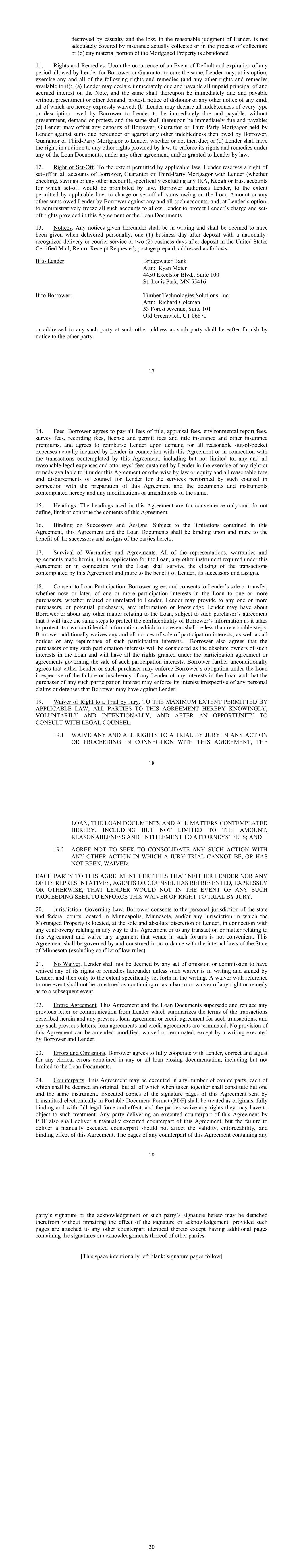 17 destroyed by casualty and the loss, in the reasonable judgment of Lender, is not adequately covered by insurance actually collected or in the process of collection; or (d) any material portion of the Mortgaged Property is abandoned. 11. Rights and Remedies. Upon the occurrence of an Event of Default and expiration of any period allowed by Lender for Borrower or Guarantor to cure the same, Lender may, at its option, exercise any and all of the following rights and remedies (and any other rights and remedies available to it): (a) Lender may declare immediately due and payable all unpaid principal of and accrued interest on the Note, and the same shall thereupon be immediately due and payable without presentment or other demand, protest, notice of dishonor or any other notice of any kind, all of which are hereby expressly waived; (b) Lender may declare all indebtedness of every type or description owed by Borrower to Lender to be immediately due and payable, without presentment, demand or protest, and the same shall thereupon be immediately due and payable; (c) Lender may offset any deposits of Borrower, Guarantor or Third-Party Mortgagor held by Lender against sums due hereunder or against any other indebtedness then owed by Borrower, Guarantor or Third-Party Mortgagor to Lender, whether or not then due; or (d) Lender shall have the right, in addition to any other rights provided by law, to enforce its rights and remedies under any of the Loan Documents, under any other agreement, and/or granted to Lender by law. 12. Right of Set-Off. To the extent permitted by applicable law, Lender reserves a right of set-off in all accounts of Borrower, Guarantor or Third-Party Mortgagor with Lender (whether checking, savings or any other account), specifically excluding any IRA, Keogh or trust accounts for which set-off would be prohibited by law. Borrower authorizes Lender, to the extent permitted by applicable law, to charge or set-off all sums owing on the Loan Amount or any other sums owed Lender by Borrower against any and all such accounts, and, at Lender’s option, to administratively freeze all such accounts to allow Lender to protect Lender’s charge and set- off rights provided in this Agreement or the Loan Documents. 13. Notices. Any notices given hereunder shall be in writing and shall be deemed to have been given when delivered personally, one (1) business day after deposit with a nationally- recognized delivery or courier service or two (2) business days after deposit in the United States Certified Mail, Return Receipt Requested, postage prepaid, addressed as follows: If to Lender: Bridgewater Bank Attn: Ryan Meier 4450 Excelsior Blvd., Suite 100 St. Louis Park, MN 55416 If to Borrower: Timber Technologies Solutions, Inc. Attn: Richard Coleman 53 Forest Avenue, Suite 101 Old Greenwich, CT 06870 or addressed to any such party at such other address as such party shall hereafter furnish by notice to the other party. 18 14. Fees. Borrower agrees to pay all fees of title, appraisal fees, environmental report fees, survey fees, recording fees, license and permit fees and title insurance and other insurance premiums, and agrees to reimburse Lender upon demand for all reasonable out-of-pocket expenses actually incurred by Lender in connection with this Agreement or in connection with the transactions contemplated by this Agreement, including but not limited to, any and all reasonable legal expenses and attorneys’ fees sustained by Lender in the exercise of any right or remedy available to it under this Agreement or otherwise by law or equity and all reasonable fees and disbursements of counsel for Lender for the services performed by such counsel in connection with the preparation of this Agreement and the documents and instruments contemplated hereby and any modifications or amendments of the same. 15. Headings. The headings used in this Agreement are for convenience only and do not define, limit or construe the contents of this Agreement. 16. Binding on Successors and Assigns. Subject to the limitations contained in this Agreement, this Agreement and the Loan Documents shall be binding upon and inure to the benefit of the successors and assigns of the parties hereto. 17. Survival of Warranties and Agreements. All of the representations, warranties and agreements made herein, in the application for the Loan, any other instrument required under this Agreement or in connection with the Loan shall survive the closing of the transactions contemplated by this Agreement and inure to the benefit of Lender, its successors and assigns. 18. Consent to Loan Participation. Borrower agrees and consents to Lender’s sale or transfer, whether now or later, of one or more participation interests in the Loan to one or more purchasers, whether related or unrelated to Lender. Lender may provide to any one or more purchasers, or potential purchasers, any information or knowledge Lender may have about Borrower or about any other matter relating to the Loan, subject to such purchaser’s agreement that it will take the same steps to protect the confidentiality of Borrower’s information as it takes to protect its own confidential information, which in no event shall be less than reasonable steps. Borrower additionally waives any and all notices of sale of participation interests, as well as all notices of any repurchase of such participation interests. Borrower also agrees that the purchasers of any such participation interests will be considered as the absolute owners of such interests in the Loan and will have all the rights granted under the participation agreement or agreements governing the sale of such participation interests. Borrower further unconditionally agrees that either Lender or such purchaser may enforce Borrower’s obligation under the Loan irrespective of the failure or insolvency of any Lender of any interests in the Loan and that the purchaser of any such participation interest may enfor