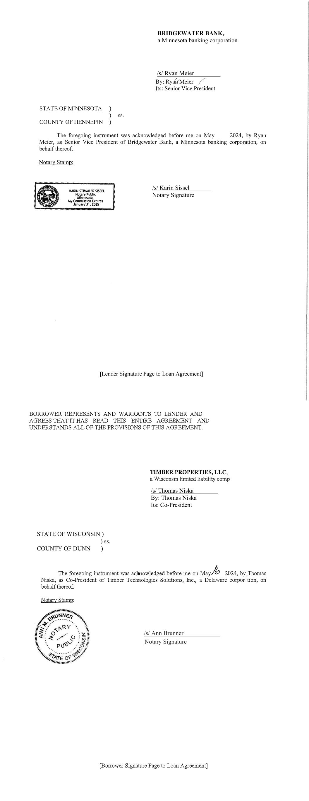 By: Ryan'Meier //. Its: Senior Vice President STATE OF MINNESOTA ) ) ss. COUNTY OF HENNEPIN ) The foregoing instrument was acknowledged before me on May 2024, by Ryan Meier, as Senior Vice President of Bridgewater Bank, a Minnesota banking corporation, on behalf thereof. Notary Stamp: KARIN STI.W.U.ER SISSEL Notary Public Minnesota 'kt Commission Expires January'31, 2025 [Lender Signature Page to Loan Agreement] BRIDGEWATER BANK, a Minnesota banking corporation /s/ Ryan Meier ________ /s/ Karin Sissel_______ Notary Signature BORROWER REPRESENTS AND WARRANTS TO LENDER AND AGREES THAT IT HAS READ THIS ENTIRE AGREEMENT AND UNDERSTANDS ALL OF THE PROVISIONS OF THIS AGREEMENT. The foregoing instrument was acknowledged before me on May/b 2024, by.Thomas Niska, as Co-President of Timber Technolagies Solutions, Inc., a Delaware corpot '.ti•on, on behalf thereof. Notary Stamp: [Borrower Signature Page to Loan Agreement] RE l TIMBER TECHNOLOGIES SOLD IONS, STATE OF WISCONSIN ) ) ss. COUNTY OF DUNN ) TllVIBER PROPERTIES, LLC, a Wisconsin limited liability comp /s/ Thomas Niska________ By: Thomas Niska Its: Co-President /s/ Ann Brunner____________ Notary Signature