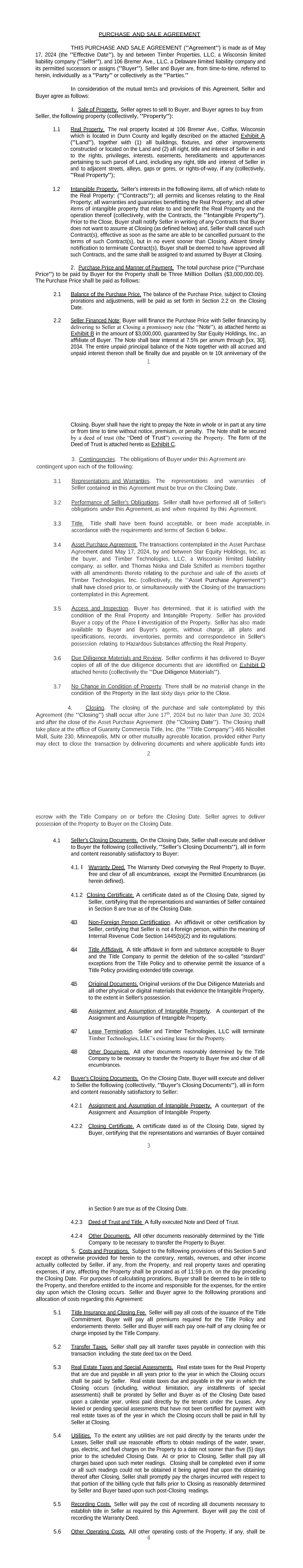 1 PURCHASE AND SALE AGREEMENT THIS PURCHASE AND SALE AGREEMENT ("Agreement") is made as of May 17, 2024 (the "Effective Date"), by and between Timber Properties, LLC, a Wisconsin limited liability company ("Seller"), and 106 Bremer Ave., LLC, a Delaware limited liability company and its permitted successors or assigns ("Buyer"). Seller and Buyer are, from time-to-time, referred to herein, individually as a "Party" or collectively as the "Parties." In consideration of the mutual tem1s and provisions of this Agreement, Seller and Buyer agree as follows: I. Sale of Property. Seller agrees to sell to Buyer, and Buyer agrees to buy from Seller, the following property (collectively, "Property"): 1.1 Real Property. The real property located at 106 Bremer Ave., Colfax, Wisconsin which is located in Dunn County and legally described on the attached Exhibit A ("Land"), together with (1) all buildings, fixtures, and other improvements constructed or located on the Land and (2) all right, title and interest of Seller in and to the rights, privileges, interests, easements, hereditaments and appurtenances pertaining to such parcel of Land, including any right, title and interest of Seller in and to adjacent streets, alleys, gaps or gores, or rights-of-way, if any (collectively, "Real Property"); 1.2 Intangible Property. Seller's interests in the following items, all of which relate to the Real Property: ("Contracts"); all permits and licenses relating to the Real Property; all warranties and guaranties benefitting the Real Property; and all other items of intangible property that relate to and benefit the Real Property and the operation thereof (collectively, with the Contracts, the "Intangible Property"). Prior to the Close, Buyer shall notify Seller in writing of any Contracts that Buyer does not want to assume at Closing (as defined below) and, Seller shall cancel such Contract(s), effective as soon as the same are able to be cancelled pursuant to the terms of such Contract(s), but in no event sooner than Closing. Absent timely notification to terminate Contract(s), Buyer shall be deemed to have approved all such Contracts, and the same shall be assigned to and assumed by Buyer at Closing. 2. Purchase Price and Manner of Payment. The total purchase price ("Purchase Price") to be paid by Buyer for the Property shall be Three Million Dollars ($3,000,000.00). The Purchase Price shall be paid as follows: 2.1 Balance of the Purchase Price. The balance of the Purchase Price, subject to Closing prorations and adjustments, will be paid as set forth in Section 2.2 on the Closing Date. 2.2 Seller Financed Note: Buyer will finance the Purchase Price with Seller financing by delivering to Seller at Closing a promissory note (the “Note”), as attached hereto as Exhibit B in the amount of $3,000,000, guaranteed by Star Equity Holdings, Inc., an affiliate of Buyer. The Note shall bear interest at 7.5% per annum through [xx, 30], 2034. The entire unpaid principal balance of the Note together with all accrued and unpaid interest thereon shall be finally due and payable on te 10t anniversary of the 2 Closing. Buyer shall have the right to prepay the Note in whole or in part at any time or from time to time without notice, premium, or penalty. The Note shall be secured by a deed of trust (the “Deed of Trust”) covering the Property. The form of the Deed of Trust is attached hereto as Exhibit C. 3. Contingencies. The obligations of Buyer under this Agreement are contingent upon each of the following: 3.1 Representations and Warranties. The representations and warranties of Seller contained in this Agreement must be true on the Closing Date. 3.2 Performance of Seller's Obligations. Seller shall have performed all of Seller's obligations under this Agreement, as and when required by this Agreement. 3.3 Title. Title shall have been found acceptable, or been made acceptable, in accordance with the requirements and terms of Section 6 below. 3.4 Asset Purchase Agreement. The transactions contemplated in the Asset Purchase Agreement dated May 17, 2024, by and between Star Equity Holdings, Inc, as the buyer, and Timber Technologies, LLC, a Wisconsin limited liability company, as seller, and Thomas Niska and Dale Schiferl as members together with all amendments thereto relating to the purchase and sale of the assets of Timber Technologies, Inc. (collectively, the "Asset Purchase Agreement") shall have closed prior to, or simultaneously with the Closing of the transactions contemplated in this Agreement. 3.5 Access and Inspection. Buyer has determined, that it is satisfied with the condition of the Real Property and Intangible Property. Seller has provided Buyer a copy of the Phase I investigation of the Property. Seller has also made available to Buyer and Buyer's agents, without charge, all plans and specifications, records, inventories, permits and correspondence in Seller's possession relating to Hazardous Substances affecting the Real Property. 3.6 Due Diligence Materials and Review. Seller confirms it has delivered to Buyer copies of all of the due diligence documents that are identified on Exhibit D attached hereto (collectively the "Due Diligence Materials"). 3.7 No Change in Condition of Property. There shall be no material change in the condition of the Property in the last sixty days prior to the Close. 4. Closing. The closing of the purchase and sale contemplated by this Agreement (the "Closing") shall occur after June 17th, 2024 but no later than June 30, 2024 and after the close of the Asset Purchase Agreement (the "Closing Date"). The Closing shall take place at the office of Guaranty Commercia Title, Inc. (the "Title Company") 465 Nicollet Mall, Suite 230, Minneapolis, MN or other mutually agreeable location, provided either Party may elect to close the transaction by delivering documents and where applicable funds into 3 escrow with the Title Company on or before the Closing Date. Seller agrees to deliver