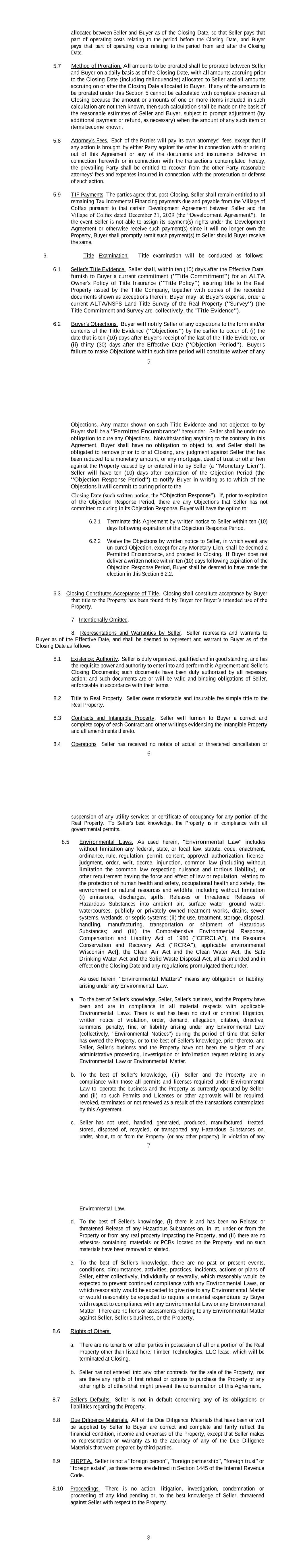 5 allocated between Seller and Buyer as of the Closing Date, so that Seller pays that part of operating costs relating to the period before the Closing Date, and Buyer pays that part of operating costs relating to the period from and after the Closing Date. 5.7 Method of Proration. All amounts to be prorated shall be prorated between Seller and Buyer on a daily basis as of the Closing Date, with all amounts accruing prior to the Closing Date (including delinquencies) allocated to Seller and all amounts accruing on or after the Closing Date allocated to Buyer. If any of the amounts to be prorated under this Section 5 cannot be calculated with complete precision at Closing because the amount or amounts of one or more items included in such calculation are not then known, then such calculation shall be made on the basis of the reasonable estimates of Seller and Buyer, subject to prompt adjustment (by additional payment or refund, as necessary) when the amount of any such item or items become known. 5.8 Attorney's Fees. Each of the Parties will pay its own attorneys' fees, except that if any action is brought by either Party against the other in connection with or arising out of this Agreement or any of the documents and instruments delivered in connection herewith or in connection with the transactions contemplated hereby, the prevailing Party shall be entitled to recover from the other Party reasonable attorneys' fees and expenses incurred in connection with the prosecution or defense of such action. 5.9 TIF Payments. The parties agree that, post-Closing, Seller shall remain entitled to all remaining Tax Incremental Financing payments due and payable from the Village of Colfax pursuant to that certain Development Agreement between Seller and the Village of Colfax dated December 31, 2029 (the “Development Agreement”). In the event Seller is not able to assign its payment(s) rights under the Development Agreement or otherwise receive such payment(s) since it will no longer own the Property, Buyer shall promptly remit such payment(s) to Seller should Buyer receive the same. 6. Title Examination. Title examination will be conducted as follows: 6.1 Seller's Title Evidence. Seller shall, within ten (10) days after the Effective Date, furnish to Buyer a current commitment ("Title Commitment") for an ALTA Owner's Policy of Title Insurance ("Title Policy") insuring title to the Real Property issued by the Title Company, together with copies of the recorded documents shown as exceptions therein. Buyer may, at Buyer's expense, order a current ALTA/NSPS Land Title Survey of the Real Property ("Survey") (the Title Commitment and Survey are, collectively, the 'Title Evidence"). 6.2 Buyer's Objections. Buyer will notify Seller of any objections to the form and/or contents of the Title Evidence ("Objections") by the earlier to occur of: (i) the date that is ten (10) days after Buyer's receipt of the last of the Title Evidence, or (ii) thirty (30) days after the Effective Date ("Objection Period"). Buyer's failure to make Objections within such time period will constitute waiver of any 6 Objections. Any matter shown on such Title Evidence and not objected to by Buyer shall be a "Permitted Encumbrance" hereunder. Seller shall be under no obligation to cure any Objections. Notwithstanding anything to the contrary in this Agreement, Buyer shall have no obligation to object to, and Seller shall be obligated to remove prior to or at Closing, any judgment against Seller that has been reduced to a monetary amount, or any mortgage, deed of trust or other lien against the Property caused by or entered into by Seller (a "Monetary Lien"). Seller will have ten (10) days after expiration of the Objection Period (the "Objection Response Period") to notify Buyer in writing as to which of the Objections it will commit to curing prior to the Closing Date (such written notice, the “Objection Response”). If, prior to expiration of the Objection Response Period, there are any Objections that Seller has not committed to curing in its Objection Response, Buyer will have the option to: 6.2.1 Terminate this Agreement by written notice to Seller within ten (10) days following expiration of the Objection Response Period. 6.2.2 Waive the Objections by written notice to Seller, in which event any un-cured Objection, except for any Monetary Lien, shall be deemed a Permitted Encumbrance, and proceed to Closing. If Buyer does not deliver a written notice within ten (10) days following expiration of the Objection Response Period, Buyer shall be deemed to have made the election in this Section 6.2.2. 6.3 Closing Constitutes Acceptance of Title. Closing shall constitute acceptance by Buyer that title to the Property has been found fit by Buyer for Buyer’s intended use of the Property. 7. Intentionally Omitted. 8. Representations and Warranties by Seller. Seller represents and warrants to Buyer as of the Effective Date, and shall be deemed to represent and warrant to Buyer as of the Closing Date as follows: 8.1 Existence; Authority. Seller is duly organized, qualified and in good standing, and has the requisite power and authority to enter into and perform this Agreement and Seller's Closing Documents; such documents have been duly authorized by all necessary action; and such documents are or will be valid and binding obligations of Seller, enforceable in accordance with their terms. 8.2 Title to Real Property. Seller owns marketable and insurable fee simple title to the Real Property. 8.3 Contracts and Intangible Property. Seller will furnish to Buyer a correct and complete copy of each Contract and other writings evidencing the Intangible Property and all amendments thereto. 8.4 Operations. Seller has received no notice of actual or threatened cancellation or 7 suspension of any utility services or certificate of occupancy for any portion of the Real Property. To Seller's best knowledge, the Property is in compliance with all go