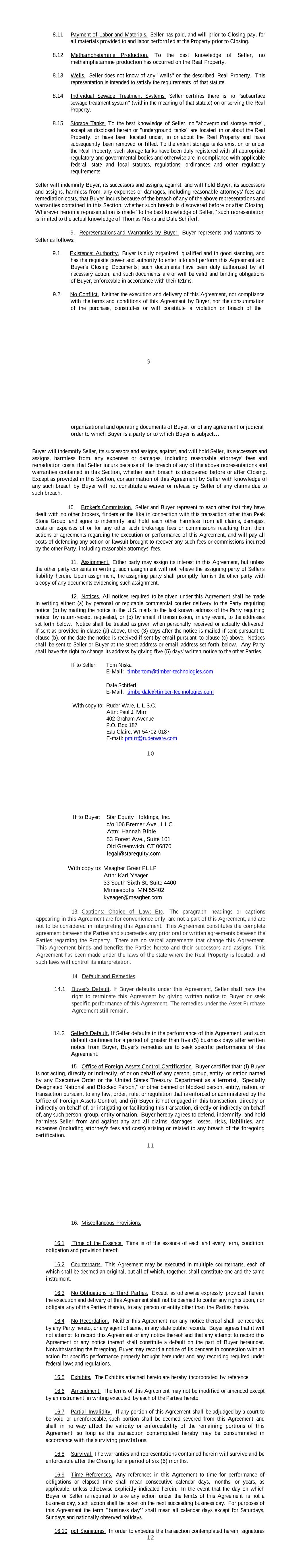 9 8.11 Payment of Labor and Materials. Seller has paid, and will prior to Closing pay, for all materials provided to and labor perforn1ed at the Property prior to Closing. 8.12 Methamphetamine Production. To the best knowledge of Seller, no methamphetamine production has occurred on the Real Property. 8.13 Wells. Seller does not know of any "wells" on the described Real Property. This representation is intended to satisfy the requirements of that statute. 8.14 Individual Sewage Treatment Systems. Seller certifies there is no "subsurface sewage treatment system" (within the meaning of that statute) on or serving the Real Property. 8.15 Storage Tanks. To the best knowledge of Seller, no "aboveground storage tanks", except as disclosed herein or "underground tanks" are located in or about the Real Property, or have been located under, in or about the Real Property and have subsequently been removed or filled. To the extent storage tanks exist on or under the Real Property, such storage tanks have been duly registered with all appropriate regulatory and governmental bodies and otherwise are in compliance with applicable federal, state and local statutes, regulations, ordinances and other regulatory requirements. Seller will indemnify Buyer, its successors and assigns, against, and will hold Buyer, its successors and assigns, harmless from, any expenses or damages, including reasonable attorneys' fees and remediation costs, that Buyer incurs because of the breach of any of the above representations and warranties contained in this Section, whether such breach is discovered before or after Closing. Wherever herein a representation is made "to the best knowledge of Seller," such representation is limited to the actual knowledge of Thomas Niska and Dale Schiferl. 9. Representations and Warranties by Buyer. Buyer represents and warrants to Seller as follows: 9.1 Existence; Authority. Buyer is duly organized, qualified and in good standing, and has the requisite power and authority to enter into and perform this Agreement and Buyer's Closing Documents; such documents have been duly authorized by all necessary action; and such documents are or will be valid and binding obligations of Buyer, enforceable in accordance with their te1ms. 9.2 No Conflict. Neither the execution and delivery of this Agreement, nor compliance with the terms and conditions of this Agreement by Buyer, nor the consummation of the purchase, constitutes or will constitute a violation or breach of the 10 organizational and operating documents of Buyer, or of any agreement or judicial order to which Buyer is a party or to which Buyer is subject… Buyer will indemnify Seller, its successors and assigns, against, and will hold Seller, its successors and assigns, harmless from, any expenses or damages, including reasonable attorneys' fees and remediation costs, that Seller incurs because of the breach of any of the above representations and warranties contained in this Section, whether such breach is discovered before or after Closing. Except as provided in this Section, consummation of this Agreement by Seller with knowledge of any such breach by Buyer will not constitute a waiver or release by Seller of any claims due to such breach. 10. Broker's Commission. Seller and Buyer represent to each other that they have dealt with no other brokers, finders or the like in connection with this transaction other than Peak Stone Group, and agree to indemnify and hold each other harmless from all claims, damages, costs or expenses of or for any other such brokerage fees or commissions resulting from their actions or agreements regarding the execution or performance of this Agreement, and will pay all costs of defending any action or lawsuit brought to recover any such fees or commissions incurred by the other Party, including reasonable attorneys' fees. 11. Assignment. Either party may assign its interest in this Agreement, but unless the other party consents in writing, such assignment will not relieve the assigning party of Seller's liability herein. Upon assignment, the assigning party shall promptly furnish the other party with a copy of any documents evidencing such assignment. 12. Notices. All notices required to be given under this Agreement shall be made in writing either: (a) by personal or reputable commercial courier delivery to the Party requiring notice, (b) by mailing the notice in the U.S. mails to the last known address of the Party requiring notice, by return-receipt requested, or (c) by email if transmission, in any event, to the addresses set forth below. Notice shall be treated as given when personally received or actually delivered, if sent as provided in clause (a) above, three (3) days after the notice is mailed if sent pursuant to clause (b), or the date the notice is received if sent by email pursuant to clause (c) above. Notices shall be sent to Seller or Buyer at the street address or email address set forth below. Any Party shall have the right to change its address by giving five (5) days' written notice to the other Parties. If to Seller: Tom Niska E-Mail: timbertom@timber-technologies.com Dale Schiferl E-Mail: timberdale@timber-technologies.com With copy to: Ruder Ware, L.L.S.C. Attn: Paul J. Mirr 402 Graham Avenue P.O. Box 187 Eau Claire, WI 54702-0187 E-mail: pmirr@ruderware.com 11 If to Buyer: Star Equity Holdings, Inc. c/o 106 Bremer Ave., LLC Attn: Hannah Bible 53 Forest Ave., Suite 101 Old Greenwich, CT 06870 legal@starequity.com With copy to: Meagher Greer PLLP Attn: Karl Yeager 33 South Sixth St. Suite 4400 Minneapolis, MN 55402 kyeager@meagher.com 13. Captions; Choice of Law; Etc. The paragraph headings or captions appearing in this Agreement are for convenience only, are not a part of this Agreement, and are not to be considered in interpreting this Agreement. This Agreement constitutes the complete agreement between the Parties and supersedes any prior oral or written agreements between the Patties r
