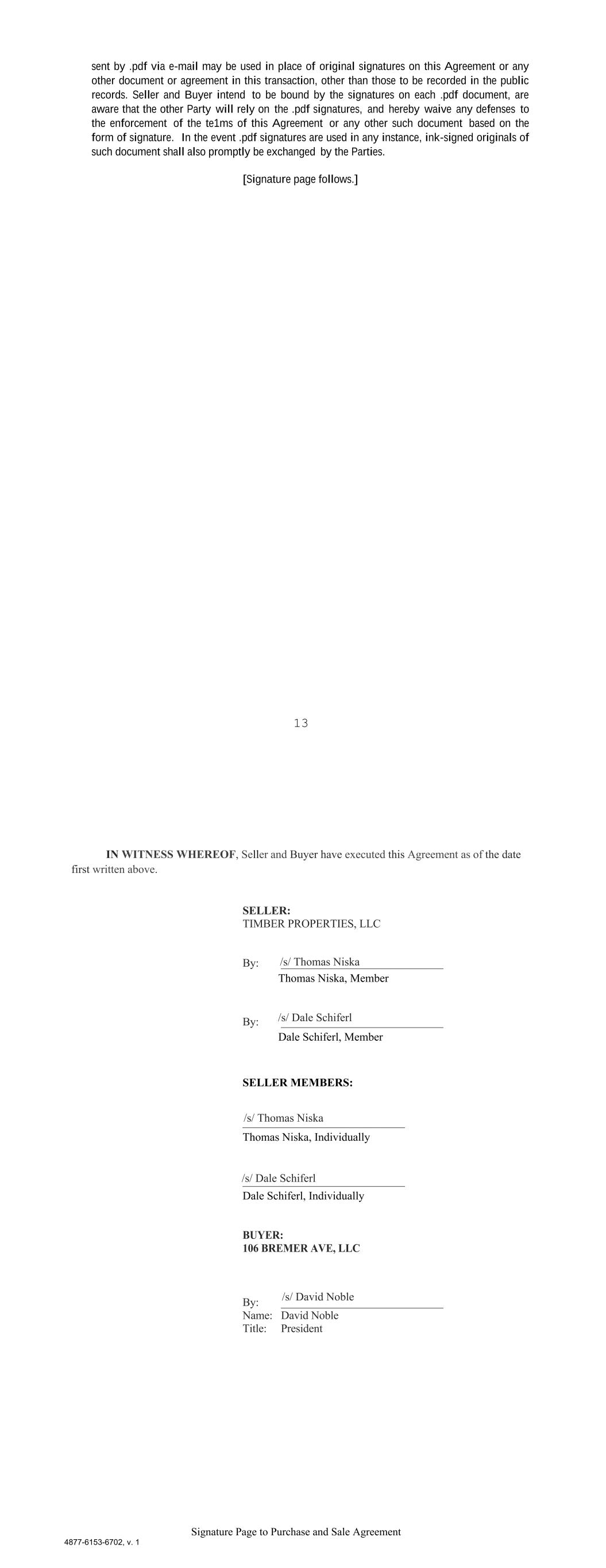 13 sent by .pdf via e-mail may be used in place of original signatures on this Agreement or any other document or agreement in this transaction, other than those to be recorded in the public records. Seller and Buyer intend to be bound by the signatures on each .pdf document, are aware that the other Party will rely on the .pdf signatures, and hereby waive any defenses to the enforcement of the te1ms of this Agreement or any other such document based on the form of signature. In the event .pdf signatures are used in any instance, ink-signed originals of such document shall also promptly be exchanged by the Parties. [Signature page follows.] Signature Page to Purchase and Sale Agreement 4877-6153-6702, v. 1 IN WITNESS WHEREOF, Seller and Buyer have executed this Agreement as of the date first written above. SELLER: TIMBER PROPERTIES, LLC By: _____________________________ Thomas Niska, Member By: _____________________________ Dale Schiferl, Member SELLER MEMBERS: _____________________________ Thomas Niska, Individually _____________________________ Dale Schiferl, Individually BUYER: 106 BREMER AVE, LLC By: _____________________________ Name: David Noble Title: President /s/ Thomas Niska /s/ Dale Schiferl /s/ David Noble /s/ Dale Schiferl /s/ Thomas Niska