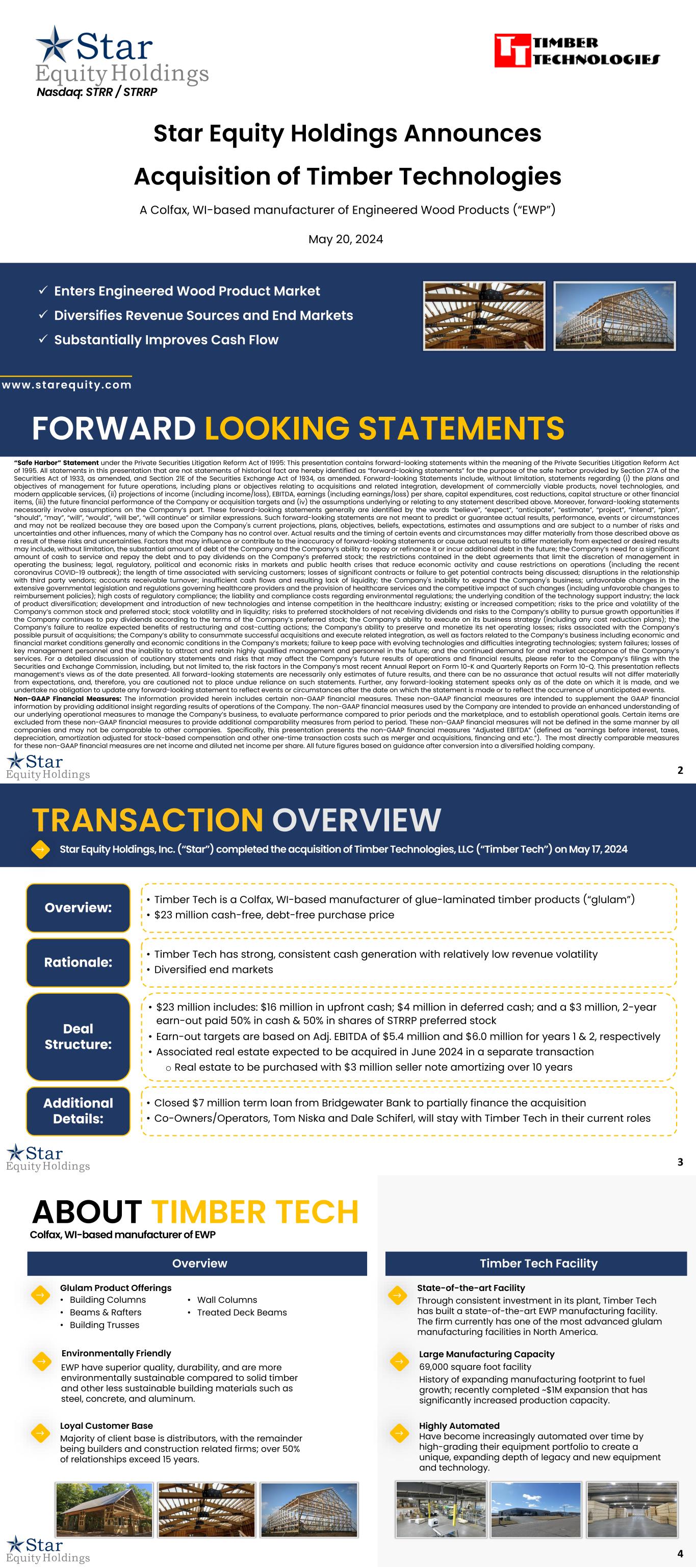 1 Star Equity Holdings Announces Acquisition of Timber Technologies A Colfax, WI-based manufacturer of Engineered Wood Products (“EWP”) Nasdaq: STRR / STRRP www.starequity.com ✓ Enters Engineered Wood Product Market ✓ Diversifies Revenue Sources and End Markets ✓ Substantially Improves Cash Flow May 20, 2024 2 “Safe Harbor” Statement under the Private Securities Litigation Reform Act of 1995: This presentation contains forward-looking statements within the meaning of the Private Securities Litigation Reform Act of 1995. All statements in this presentation that are not statements of historical fact are hereby identified as “forward-looking statements” for the purpose of the safe harbor provided by Section 27A of the Securities Act of 1933, as amended, and Section 21E of the Securities Exchange Act of 1934, as amended. Forward-looking Statements include, without limitation, statements regarding (i) the plans and objectives of management for future operations, including plans or objectives relating to acquisitions and related integration, development of commercially viable products, novel technologies, and modern applicable services, (ii) projections of income (including income/loss), EBITDA, earnings (including earnings/loss) per share, capital expenditures, cost reductions, capital structure or other financial items, (iii) the future financial performance of the Company or acquisition targets and (iv) the assumptions underlying or relating to any statement described above. Moreover, forward-looking statements necessarily involve assumptions on the Company’s part. These forward-looking statements generally are identified by the words “believe”, “expect”, “anticipate”, “estimate”, “project”, “intend”, “plan”, “should”, “may”, “will”, “would”, “will be”, “will continue” or similar expressions. Such forward-looking statements are not meant to predict or guarantee actual results, performance, events or circumstances and may not be realized because they are based upon the Company's current projections, plans, objectives, beliefs, expectations, estimates and assumptions and are subject to a number of risks and uncertainties and other influences, many of which the Company has no control over. Actual results and the timing of certain events and circumstances may differ materially from those described above as a result of these risks and uncertainties. Factors that may influence or contribute to the inaccuracy of forward-looking statements or cause actual results to differ materially from expected or desired results may include, without limitation, the substantial amount of debt of the Company and the Company’s ability to repay or refinance it or incur additional debt in the future; the Company’s need for a significant amount of cash to service and repay the debt and to pay dividends on the Company’s preferred stock; the restrictions contained in the debt agreements that limit the discretion of management in operating the business; legal, regulatory, political and economic risks in markets and public health crises that reduce economic activity and cause restrictions on operations (including the recent coronavirus COVID-19 outbreak); the length of time associated with servicing customers; losses of significant contracts or failure to get potential contracts being discussed; disruptions in the relationship with third party vendors; accounts receivable turnover; insufficient cash flows and resulting lack of liquidity; the Company's inability to expand the Company's business; unfavorable changes in the extensive governmental legislation and regulations governing healthcare providers and the provision of healthcare services and the competitive impact of such changes (including unfavorable changes to reimbursement policies); high costs of regulatory compliance; the liability and compliance costs regarding environmental regulations; the underlying condition of the technology support industry; the lack of product diversification; development and introduction of new technologies and intense competition in the healthcare industry; existing or increased competition; risks to the price and volatility of the Company’s common stock and preferred stock; stock volatility and in liquidity; risks to preferred stockholders of not receiving dividends and risks to the Company’s ability to pursue growth opportunities if the Company continues to pay dividends according to the terms of the Company’s preferred stock; the Company’s ability to execute on its business strategy (including any cost reduction plans); the Company’s failure to realize expected benefits of restructuring and cost-cutting actions; the Company’s ability to preserve and monetize its net operating losses; risks associated with the Company’s possible pursuit of acquisitions; the Company’s ability to consummate successful acquisitions and execute related integration, as well as factors related to the Company’s business including economic and financial market conditions generally and economic conditions in the Company’s markets; failure to keep pace with evolving technologies and difficulties integrating technologies; system failures; losses of key management personnel and the inability to attract and retain highly qualified management and personnel in the future; and the continued demand for and market acceptance of the Company’s services. For a detailed discussion of cautionary statements and risks that may affect the Company’s future results of operations and financial results, please refer to the Company’s filings with the Securities and Exchange Commission, including, but not limited to, the risk factors in the Company’s most recent Annual Report on Form 10-K and Quarterly Reports on Form 10-Q. This presentation reflects management’s views as of the date presented. All forward-looking statements are necessarily only estimates of future results, 