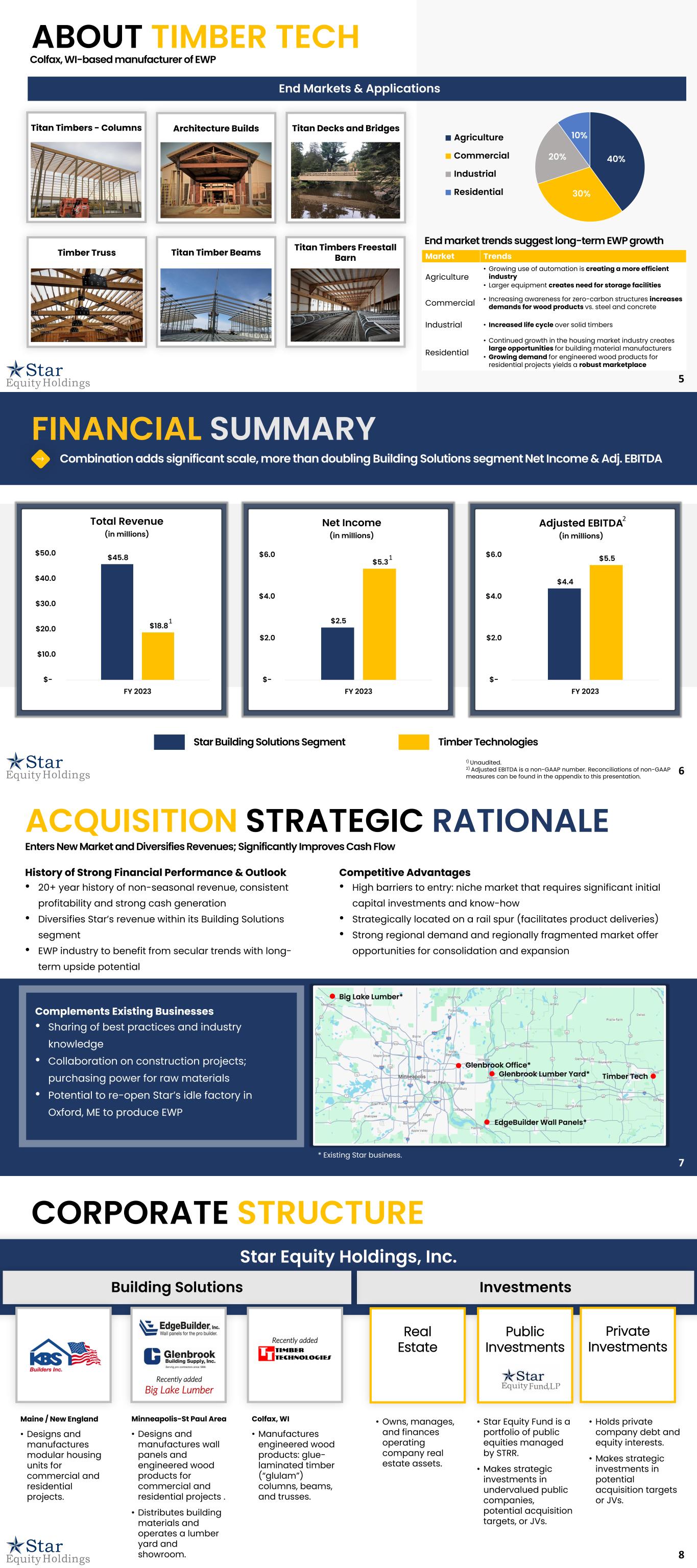 5 End Markets & Applications Colfax, WI-based manufacturer of EWP 40% 30% 20% 10%Agriculture Commercial Industrial Residential Market Trends Agriculture • Growing use of automation is creating a more efficient industry • Larger equipment creates need for storage facilities Commercial • Increasing awareness for zero-carbon structures increases demands for wood products vs. steel and concrete Industrial • Increased life cycle over solid timbers Residential • Continued growth in the housing market industry creates large opportunities for building material manufacturers • Growing demand for engineered wood products for residential projects yields a robust marketplace End market trends suggest long-term EWP growth Titan Timbers - Columns Architecture Builds Timber Truss Titan Timber Beams Titan Timbers Freestall Barn Titan Decks and Bridges ABOUT TIMBER TECH 6 Combination adds significant scale, more than doubling Building Solutions segment Net Income & Adj. EBITDA FINANCIAL SUMMARY Star Building Solutions Segment Timber Technologies $45.8 $18.8 $- $10.0 $20.0 $30.0 $40.0 $50.0 FY 2023 Total Revenue (in millions) 1 1) Unaudited. 2) Adjusted EBITDA is a non-GAAP number. Reconciliations of non-GAAP measures can be found in the appendix to this presentation. $4.4 $5.5 $- $2.0 $4.0 $6.0 FY 2023 Adjusted EBITDA (in millions) 2 $2.5 $5.3 $- $2.0 $4.0 $6.0 FY 2023 Net Income (in millions) 1 7 ACQUISITION STRATEGIC RATIONALE History of Strong Financial Performance & Outlook • 20+ year history of non-seasonal revenue, consistent profitability and strong cash generation • Diversifies Star’s revenue within its Building Solutions segment • EWP industry to benefit from secular trends with long- term upside potential Enters New Market and Diversifies Revenues; Significantly Improves Cash Flow Complements Existing Businesses • Sharing of best practices and industry knowledge • Collaboration on construction projects; purchasing power for raw materials • Potential to re-open Star’s idle factory in Oxford, ME to produce EWP Competitive Advantages • High barriers to entry: niche market that requires significant initial capital investments and know-how • Strategically located on a rail spur (facilitates product deliveries) • Strong regional demand and regionally fragmented market offer opportunities for consolidation and expansion Big Lake Lumber* Glenbrook Office* Glenbrook Lumber Yard* Timber Tech EdgeBuilder Wall Panels* * Existing Star business. 8 CORPORATE STRUCTURE Star Equity Holdings, Inc. InvestmentsBuilding Solutions Private Investments Public Investments Real Estate • Star Equity Fund is a portfolio of public equities managed by STRR. • Makes strategic investments in undervalued public companies, potential acquisition targets, or JVs. • Owns, manages, and finances operating company real estate assets. • Holds private company debt and equity interests. • Makes strategic investments in potential acquisition targets or JVs. Colfax, WI • Manufactures engineered wood products: glue- laminated timber (“glulam”) columns, beams, and trusses. Minneapolis-St Paul Area • Designs and manufactures wall panels and engineered wood products for commercial and residential projects . • Distributes building materials and operates a lumber yard and showroom. Recently added Big Lake Lumber Maine / New England • Designs and manufactures modular housing units for commercial and residential projects. Recently added