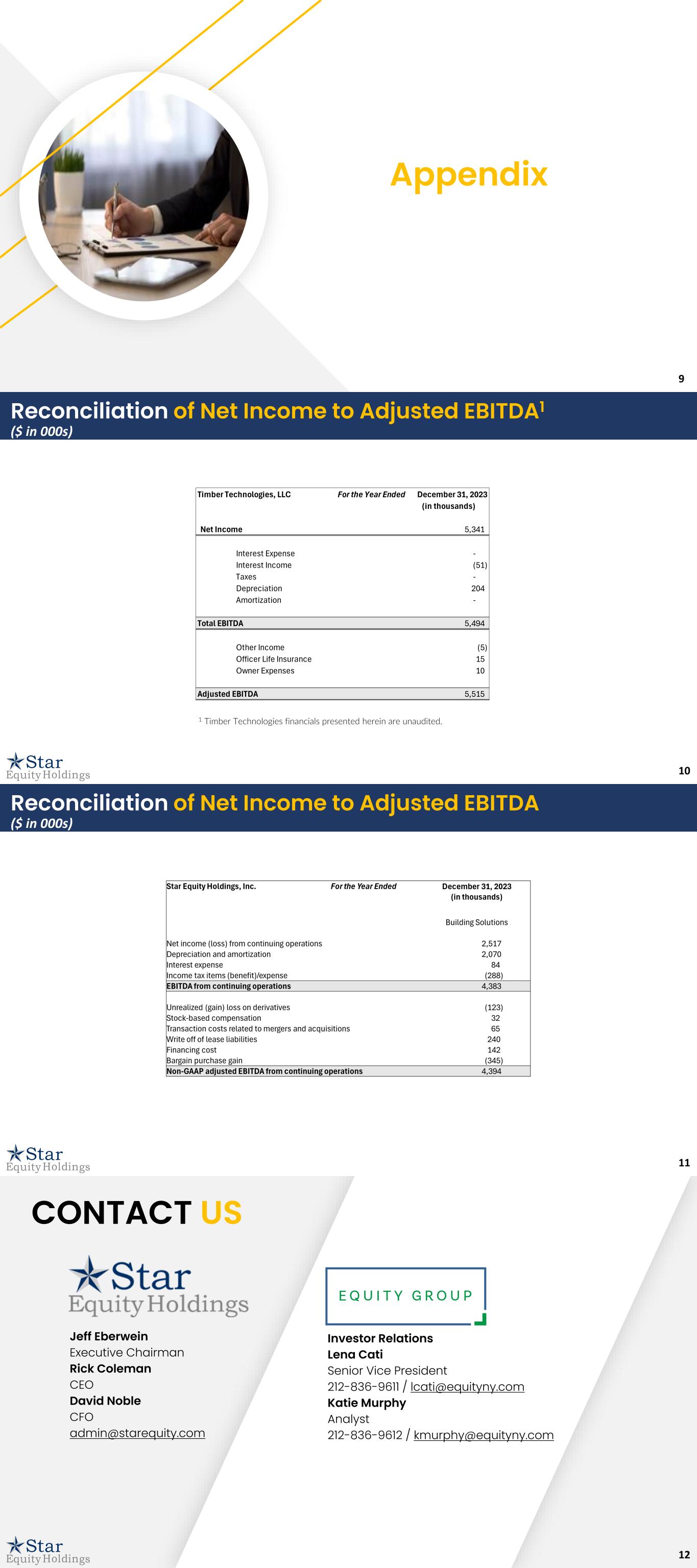 9 Appendix 10 Reconciliation of Net Income to Adjusted EBITDA1 ($ in 000s) Timber Technologies, LLC For the Year Ended December 31, 2023 (in thousands) Net Income 5,341 Interest Expense - Interest Income (51) Taxes - Depreciation 204 Amortization - Total EBITDA 5,494 Other Income (5) Officer Life Insurance 15 Owner Expenses 10 Adjusted EBITDA 5,515 1 Timber Technologies financials presented herein are unaudited. 11 Reconciliation of Net Income to Adjusted EBITDA ($ in 000s) 12 Jeff Eberwein Executive Chairman Rick Coleman CEO David Noble CFO admin@starequity.com Investor Relations Lena Cati Senior Vice President 212-836-9611 / lcati@equityny.com Katie Murphy Analyst 212-836-9612 / kmurphy@equityny.com CONTACT US