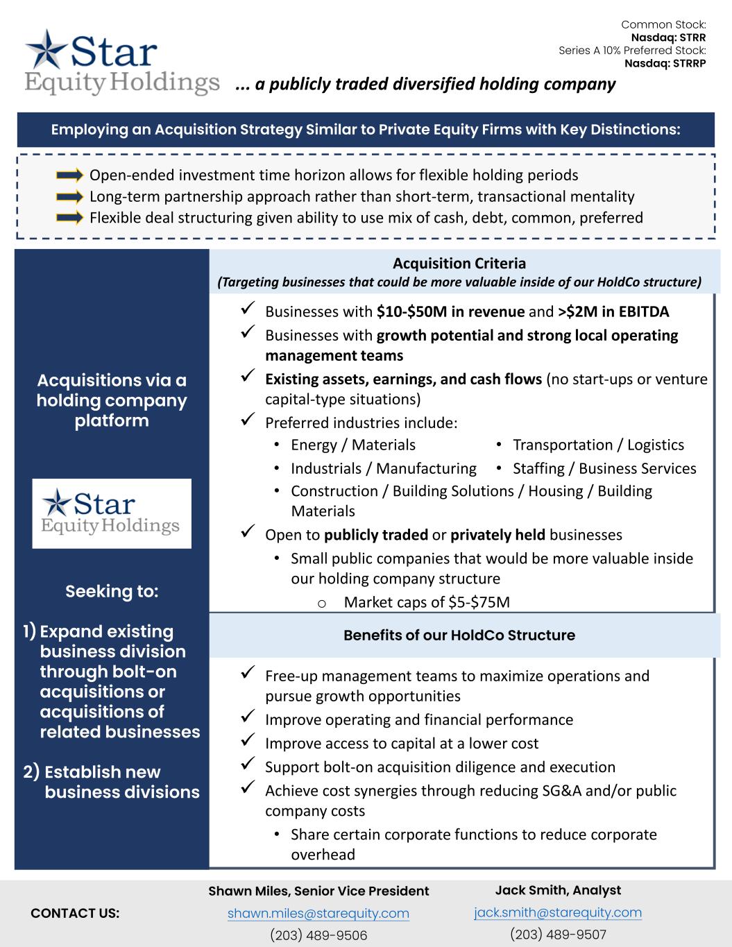 Common Stock: Nasdaq: STRR Series A 10% Preferred Stock: Nasdaq: STRRP Acquisition Criteria (Targeting businesses that could be more valuable inside of our HoldCo structure) ✓ Businesses with $10-$50M in revenue and >$2M in EBITDA ✓ Businesses with growth potential and strong local operating management teams ✓ Existing assets, earnings, and cash flows (no start-ups or venture capital-type situations) ✓ Preferred industries include: • Construction / Building Solutions / Housing / Building Materials ✓ Open to publicly traded or privately held businesses • Small public companies that would be more valuable inside our holding company structure o Market caps of $5-$75M ✓ Free-up management teams to maximize operations and pursue growth opportunities ✓ Improve operating and financial performance ✓ Improve access to capital at a lower cost ✓ Support bolt-on acquisition diligence and execution ✓ Achieve cost synergies through reducing SG&A and/or public company costs • Share certain corporate functions to reduce corporate overhead Benefits of our HoldCo Structure Shawn Miles, Senior Vice President shawn.miles@starequity.com (203) 489-9506 Jack Smith, Analyst jack.smith@starequity.com (203) 489-9507 CONTACT US: Employing an Acquisition Strategy Similar to Private Equity Firms with Key Distinctions: Acquisitions via a holding company platform Seeking to: 1) Expand existing business division through bolt-on acquisitions or acquisitions of related businesses 2) Establish new business divisions ... a publicly traded diversified holding company Open-ended investment time horizon allows for flexible holding periods Long-term partnership approach rather than short-term, transactional mentality Flexible deal structuring given ability to use mix of cash, debt, common, preferred • Energy / Materials • Industrials / Manufacturing • Transportation / Logistics • Staffing / Business Services
