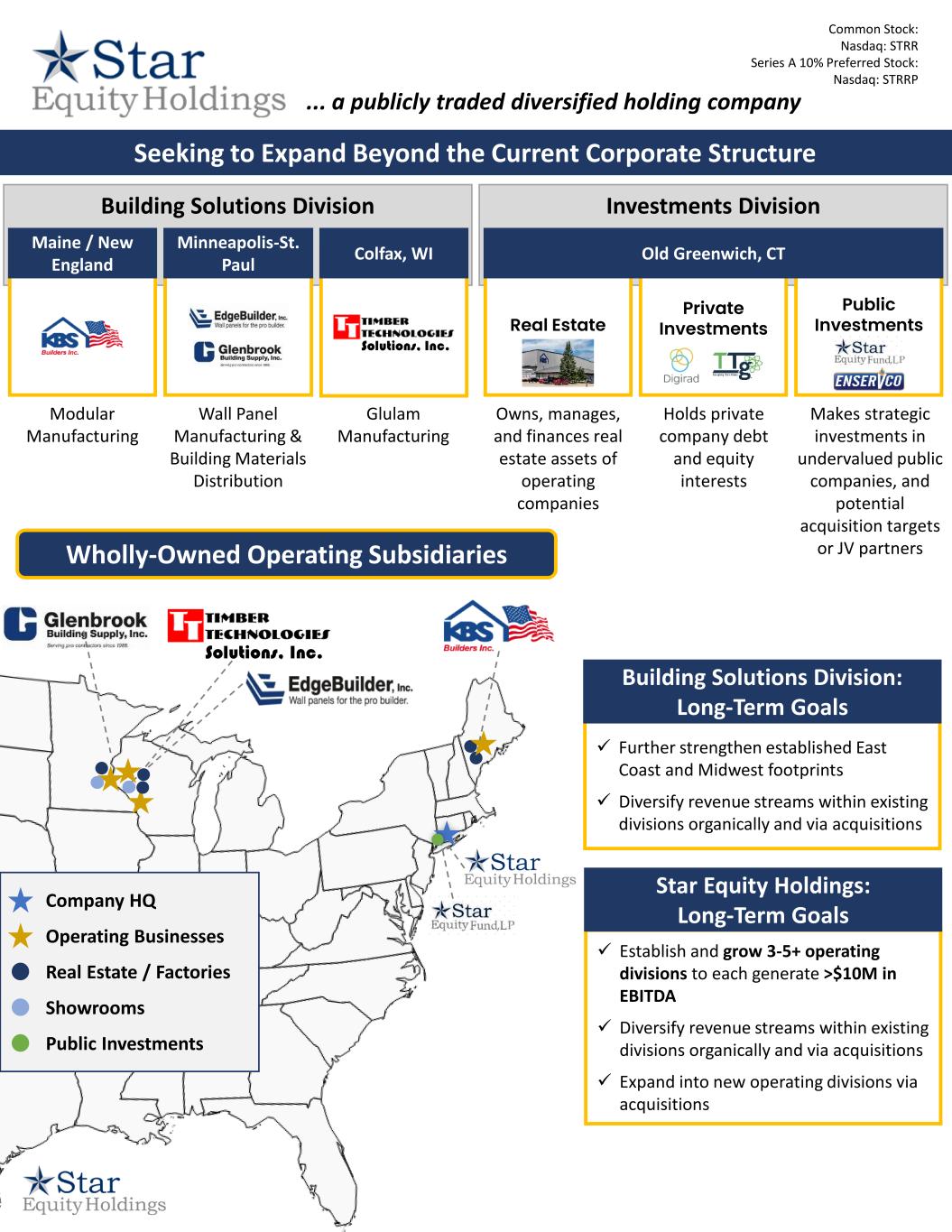 Common Stock: Nasdaq: STRR Series A 10% Preferred Stock: Nasdaq: STRRP Building Solutions Division Investments Division Real Estate Owns, manages, and finances real estate assets of operating companies Glulam Manufacturing Wall Panel Manufacturing & Building Materials Distribution Modular Manufacturing Makes strategic investments in undervalued public companies, and potential acquisition targets or JV partners Seeking to Expand Beyond the Current Corporate Structure Common Stock: Nasdaq: STRR Series A 10% Preferred Stock: Nasdaq: STRRP ... a publicly traded diversified holding company Operating Businesses Real Estate / Factories Showrooms Company HQ Public Investments Holds private company debt and equity interests Private Investments Colfax, WI Minneapolis-St. Paul Maine / New England ✓ Establish and grow 3-5+ operating divisions to each generate >$10M in EBITDA ✓ Diversify revenue streams within existing divisions organically and via acquisitions ✓ Expand into new operating divisions via acquisitions Star Equity Holdings: Long-Term Goals ✓ Further strengthen established East Coast and Midwest footprints ✓ Diversify revenue streams within existing divisions organically and via acquisitions Building Solutions Division: Long-Term Goals Wholly-Owned Operating Subsidiaries Public Investments Old Greenwich, CT Solutions, Inc. Solutions, Inc.