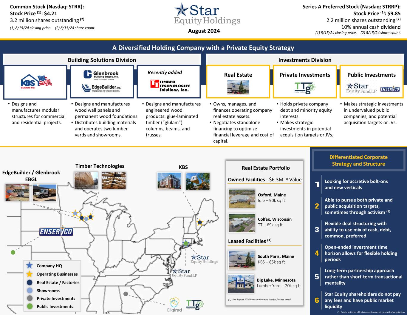 August 2024 A Diversified Holding Company with a Private Equity Strategy Building Solutions Division Investments Division Real Estate Private Investments Public Investments • Makes strategic investments in undervalued public companies, and potential acquisition targets or JVs. • Owns, manages, and finances operating company real estate assets. • Negotiates standalone financing to optimize financial leverage and cost of capital. • Designs and manufactures engineered wood products: glue-laminated timber (“glulam”) columns, beams, and trusses. • Designs and manufactures wood wall panels and permanent wood foundations. • Distributes building materials and operates two lumber yards and showrooms. • Designs and manufactures modular structures for commercial and residential projects. • Holds private company debt and minority equity interests. • Makes strategic investments in potential acquisition targets or JVs. Recently added (1) 8/15/24 closing price. (2) 8/15/24 share count. Common Stock (Nasdaq: STRR): Stock Price (1): $4.21 3.2 million shares outstanding (2) Series A Preferred Stock (Nasdaq: STRRP): Stock Price (1): $9.85 2.2 million shares outstanding (2) 10% annual cash dividend (1) 8/15/24 closing price. (2) 8/15/24 share count. KBS EdgeBuilder / Glenbrook EBGL Timber Technologies Flexible deal structuring with ability to use mix of cash, debt, common, preferred Star Equity shareholders do not pay any fees and have public market liquidity Looking for accretive bolt-ons and new verticals Open-ended investment time horizon allows for flexible holding periods Differentiated Corporate Strategy and Structure Operating Businesses Real Estate / Factories Showrooms Private Investments Company HQ Public Investments Long-term partnership approach rather than short-term transactional mentality Able to pursue both private and public acquisition targets, sometimes through activism (1) Real Estate Portfolio South Paris, Maine KBS – 85k sq ft Oxford, Maine Idle – 90k sq ft Big Lake, Minnesota Lumber Yard – 20k sq ft Colfax, Wisconsin TT – 69k sq ft Owned Facilities - $6.3M (1) Value Leased Facilities (1) (1) See August 2024 Investor Presentation for further detail. (1) Public activism efforts are not always in pursuit of acquisition. Solutions, Inc.