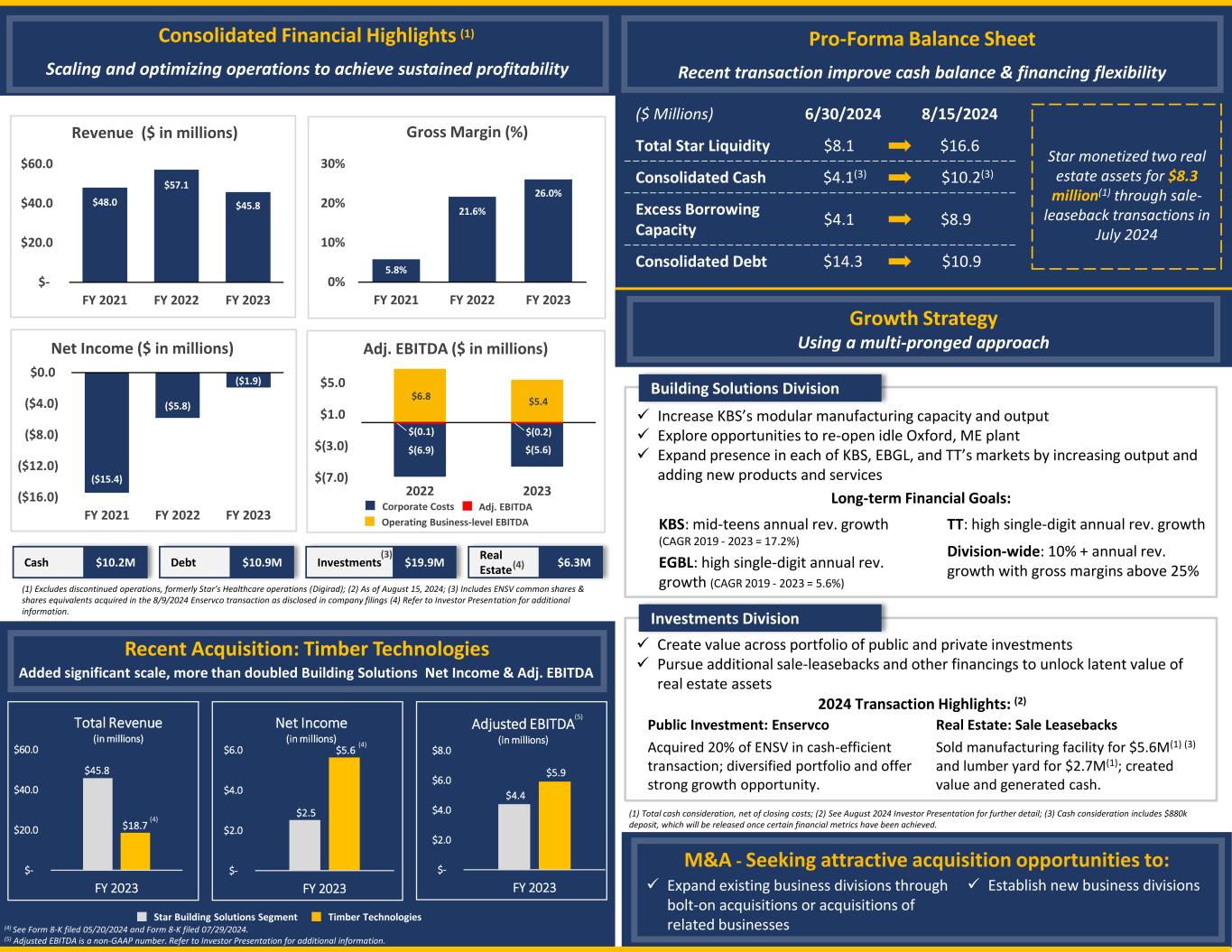 Consolidated Financial Highlights Scaling and optimizing operations to achieve sustained profitability $48.0 $57.1 $45.8 $- $20.0 $40.0 $60.0 FY 2021 FY 2022 FY 2023 Revenue ($ in millions) 5.8% 21.6% 26.0% 0% 10% 20% 30% FY 2021 FY 2022 FY 2023 Gross Margin (%) ($15.4) ($5.8) ($1.9) ($16.0) ($12.0) ($8.0) ($4.0) $0.0 FY 2021 FY 2022 FY 2023 Net Income ($ in millions) Growth Strategy Using a multi-pronged approach (1) $10.2M Cash $19.9MInvestments$10.9MDebt (1) Excludes discontinued operations, formerly Star’s Healthcare operations (Digirad); (2) As of August 15, 2024; (3) Includes ENSV common shares & shares equivalents acquired in the 8/9/2024 Enservco transaction as disclosed in company filings (4) Refer to Investor Presentation for additional information. Recent Acquisition: Timber Technologies $6.3M Real Estate(4) $6.8 $5.4 $(6.9) $(5.6) $(7.0) $(3.0) $1.0 $5.0 2022 2023 Adj. EBITDA ($ in millions) $(0.1) $(0.2) Corporate Costs Adj. EBITDA Operating Business-level EBITDA ✓ Increase KBS’s modular manufacturing capacity and output ✓ Explore opportunities to re-open idle Oxford, ME plant ✓ Expand presence in each of KBS, EBGL, and TT’s markets by increasing output and adding new products and services Long-term Financial Goals: Building Solutions Division KBS: mid-teens annual rev. growth (CAGR 2019 - 2023 = 17.2%) EGBL: high single-digit annual rev. growth (CAGR 2019 - 2023 = 5.6%) TT: high single-digit annual rev. growth Division-wide: 10% + annual rev. growth with gross margins above 25% Added significant scale, more than doubled Building Solutions Net Income & Adj. EBITDA Star Building Solutions Segment Timber Technologies (4) See Form 8-K filed 05/20/2024 and Form 8-K filed 07/29/2024. (5) Adjusted EBITDA is a non-GAAP number. Refer to Investor Presentation for additional information. M&A - Seeking attractive acquisition opportunities to: ✓ Expand existing business divisions through bolt-on acquisitions or acquisitions of related businesses ✓ Establish new business divisions $45.8 $18.7 $- $20.0 $40.0 $60.0 FY 2023 Total Revenue (in millions) (4) $2.5 $5.6 $- $2.0 $4.0 $6.0 FY 2023 Net Income (in millions) (4) $4.4 $5.9 $- $2.0 $4.0 $6.0 $8.0 FY 2023 Adjusted EBITDA (in millions) (5) ($ Millions) 6/30/2024 8/15/2024 Total Star Liquidity $8.1 $16.6 Consolidated Cash $4.1(3) $10.2(3) Excess Borrowing Capacity $4.1 $8.9 Consolidated Debt $14.3 $10.9 Pro-Forma Balance Sheet Recent transaction improve cash balance & financing flexibility Star monetized two real estate assets for $8.3 million(1) through sale- leaseback transactions in July 2024 (1) Total cash consideration, net of closing costs; (2) See August 2024 Investor Presentation for further detail; (3) Cash consideration includes $880k deposit, which will be released once certain financial metrics have been achieved. Investments Division ✓ Create value across portfolio of public and private investments ✓ Pursue additional sale-leasebacks and other financings to unlock latent value of real estate assets 2024 Transaction Highlights: (2) Public Investment: Enservco Acquired 20% of ENSV in cash-efficient transaction; diversified portfolio and offer strong growth opportunity. Real Estate: Sale Leasebacks Sold manufacturing facility for $5.6M(1) (3) and lumber yard for $2.7M(1); created value and generated cash. (3)