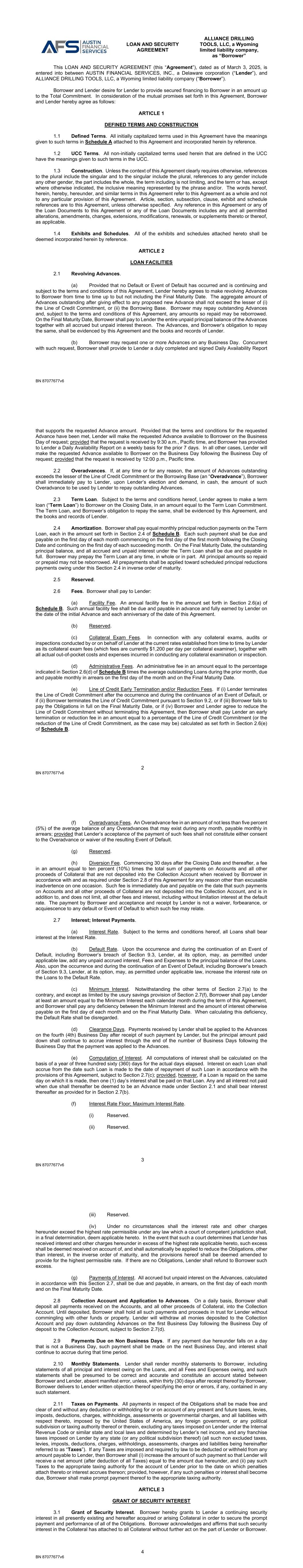 BN 87077677v6 LOAN AND SECURITY AGREEMENT ALLIANCE DRILLING TOOLS, LLC, a Wyoming limited liability company, as “Borrower” This LOAN AND SECURITY AGREEMENT (this “Agreement”), dated as of March 3, 2025, is entered into between AUSTIN FINANCIAL SERVICES, INC., a Delaware corporation (“Lender”), and ALLIANCE DRILLING TOOLS, LLC, a Wyoming limited liability company (“Borrower”). Borrower and Lender desire for Lender to provide secured financing to Borrower in an amount up to the Total Commitment. In consideration of the mutual promises set forth in this Agreement, Borrower and Lender hereby agree as follows: ARTICLE 1 DEFINED TERMS AND CONSTRUCTION 1.1 Defined Terms. All initially capitalized terms used in this Agreement have the meanings given to such terms in Schedule A attached to this Agreement and incorporated herein by reference. 1.2 UCC Terms. All non-initially capitalized terms used herein that are defined in the UCC have the meanings given to such terms in the UCC. 1.3 Construction. Unless the context of this Agreement clearly requires otherwise, references to the plural include the singular and to the singular include the plural, references to any gender include any other gender, the part includes the whole, the term including is not limiting, and the term or has, except where otherwise indicated, the inclusive meaning represented by the phrase and/or. The words hereof, herein, hereby, hereunder, and similar terms in this Agreement refer to this Agreement as a whole and not to any particular provision of this Agreement. Article, section, subsection, clause, exhibit and schedule references are to this Agreement, unless otherwise specified. Any reference in this Agreement or any of the Loan Documents to this Agreement or any of the Loan Documents includes any and all permitted alterations, amendments, changes, extensions, modifications, renewals, or supplements thereto or thereof, as applicable. 1.4 Exhibits and Schedules. All of the exhibits and schedules attached hereto shall be deemed incorporated herein by reference. ARTICLE 2 LOAN FACILITIES 2.1 Revolving Advances. (a) Provided that no Default or Event of Default has occurred and is continuing and subject to the terms and conditions of this Agreement, Lender hereby agrees to make revolving Advances to Borrower from time to time up to but not including the Final Maturity Date. The aggregate amount of Advances outstanding after giving effect to any proposed new Advance shall not exceed the lesser of (i) the Line of Credit Commitment, or (ii) the Borrowing Base. Borrower may repay outstanding Advances and, subject to the terms and conditions of this Agreement, any amounts so repaid may be reborrowed. On the Final Maturity Date, Borrower shall pay to Lender the entire unpaid principal balance of the Advances together with all accrued but unpaid interest thereon. The Advances, and Borrower’s obligation to repay the same, shall be evidenced by this Agreement and the books and records of Lender. (b) Borrower may request one or more Advances on any Business Day. Concurrent with such request, Borrower shall provide to Lender a duly completed and signed Daily Availability Report 2 BN 87077677v6 that supports the requested Advance amount. Provided that the terms and conditions for the requested Advance have been met, Lender will make the requested Advance available to Borrower on the Business Day of request; provided that the request is received by 9:30 a.m., Pacific time, and Borrower has provided to Lender a Daily Availability Report on a weekly basis for the prior 7 days. In all other cases, Lender will make the requested Advance available to Borrower on the Business Day following the Business Day of request; provided that the request is received by 12:00 p.m., Pacific time. 2.2 Overadvances. If, at any time or for any reason, the amount of Advances outstanding exceeds the lesser of the Line of Credit Commitment or the Borrowing Base (an “Overadvance”), Borrower shall immediately pay to Lender, upon Lender’s election and demand, in cash, the amount of such Overadvance to be used by Lender to repay outstanding Advances. 2.3 Term Loan. Subject to the terms and conditions hereof, Lender agrees to make a term loan (“Term Loan”) to Borrower on the Closing Date, in an amount equal to the Term Loan Commitment. The Term Loan, and Borrower’s obligation to repay the same, shall be evidenced by this Agreement, and the books and records of Lender. 2.4 Amortization. Borrower shall pay equal monthly principal reduction payments on the Term Loan, each in the amount set forth in Section 2.4 of Schedule B. Each such payment shall be due and payable on the first day of each month commencing on the first day of the first month following the Closing Date and continuing on the first day of each succeeding month. On the Final Maturity Date, the outstanding principal balance, and all accrued and unpaid interest under the Term Loan shall be due and payable in full. Borrower may prepay the Term Loan at any time, in whole or in part. All principal amounts so repaid or prepaid may not be reborrowed. All prepayments shall be applied toward scheduled principal reductions payments owing under this Section 2.4 in inverse order of maturity. 2.5 Reserved. 2.6 Fees. Borrower shall pay to Lender: (a) Facility Fee. An annual facility fee in the amount set forth in Section 2.6(a) of Schedule B. Such annual facility fee shall be due and payable in advance and fully earned by Lender on the date of the initial Advance and each anniversary of the date of this Agreement. (b) Reserved. (c) Collateral Exam Fees. In connection with any collateral exams, audits or inspections conducted by or on behalf of Lender at the current rates established from time to time by Lender as its collateral exam fees (which fees are currently $1,200 per day per collateral examiner), together with all actual out-of-pocket costs and expenses incurred in conducting any col