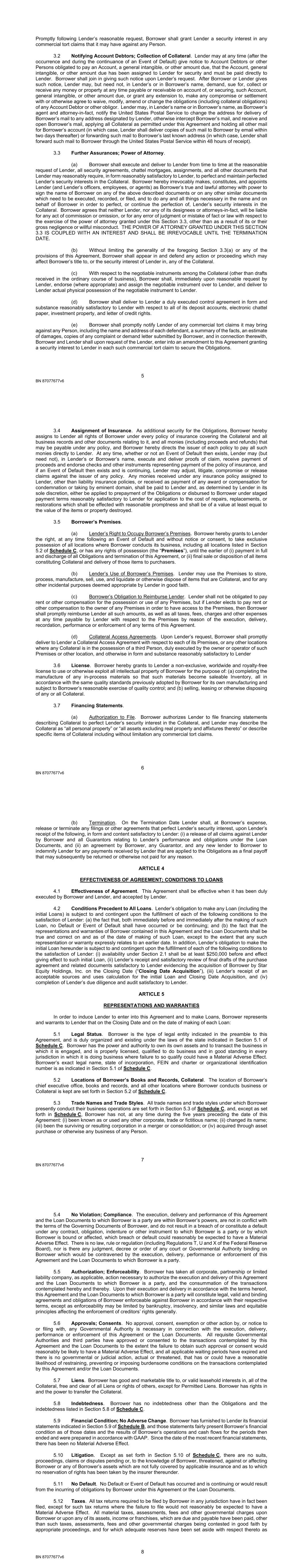 13 BN 87077677v6 the Lender shall not be impaired or invalidated by any act or omission of Borrower or the owner of the property nor by the occupation of the premises wherein such property is located for purposes more hazardous than are permitted by said policy. If Borrower fails to provide and pay for such insurance, Lender may procure the same at Borrower’s expense, but shall not be required to do so. Borrower agrees to deliver to Lender, promptly as rendered, true copies of all monthly reports made to insurance companies. 6.12 Notice to Lender. Promptly, upon Borrower acquiring knowledge thereof, give written notice to Lender of: (a) all litigation affecting Borrower where the amount in controversy is in excess of $25,000, and thereafter an update on such litigation on a quarterly basis; (b) any dispute which may exist between Borrower and any Governmental Authority; (c) any labor controversy resulting in or threatening to result in a strike against Borrower; (d) any proposal by any Governmental Authority to acquire the assets or business of Borrower, or to directly compete with Borrower; (e) any Default or Event of Default; and (f) any other matter which has resulted or could reasonably be expected to result in a Material Adverse Effect. 6.13 Delivery of Instruments, etc. Upon request by Lender, promptly deliver to Lender in pledge all instruments, documents and chattel paper constituting Collateral, endorsed or assigned by Borrower. 6.14 Environment. Be and remain, and cause each operator of any of Borrower’s assets to be and remain, in compliance in all material respects with the provisions of all federal, state and local environmental, health and safety laws, codes and ordinances, and all rules and regulations issued thereunder; notify Lender promptly of any notice of a hazardous discharge or environmental complaint received from any Governmental Authority or any other Person; notify Lender promptly of any material hazardous discharge from or affecting its premises not in compliance in all material respects with applicable laws; promptly contain and remove the same, in compliance in all material respects with all applicable laws; promptly pay any fine or penalty assessed in connection therewith other than such fines or penalties being contested in good faith by appropriate proceedings, and for which adequate reserves have been set aside with respect thereto as required by GAAP and, by reason of such contest or nonpayment, no property is subject to a material risk of loss or forfeiture; permit Lender to inspect the premises and to inspect all books, correspondence, and records pertaining thereto; and at Lender’s reasonable request, and at Borrower’s expense, provide a report of a qualified environmental engineer, reasonably satisfactory in scope, form and content to Lender, and such other and further assurances reasonably satisfactory to Lender that the condition has been corrected. 6.15 Returns. Cause returns and allowances, as between Borrower and its Account Debtors, to be on the same basis and in accordance with the usual customary practices of Borrower, as they exist at the time of the execution and delivery of this Agreement. If, at a time when no Event of Default has occurred and is continuing, any Account Debtor returns any Inventory to Borrower, Borrower promptly shall determine the reason for such return and, if Borrower accepts such return, issue a credit memorandum in the appropriate amount to such Account Debtor. If, at a time when an Event of Default has occurred and is continuing, any Account Debtor returns any Inventory to Borrower, Borrower promptly shall determine the reason for such return and, if Lender consents (which consent shall not be unreasonably withheld), issue a credit memorandum (with a copy to be sent to Lender) in the appropriate amount to such Account Debtor. 14 BN 87077677v6 6.16 Bank Accounts. Maintain its cash on hand and cash equivalent investments solely in deposit accounts held at the financial institutions listed in Section 5.21 of Schedule C. 6.17 Attorney in Fact. To facilitate Lender’s performance or observance of Borrower’s obligations under this Agreement, Borrower hereby irrevocably appoints Lender and Lender’s agents, as Borrower’s attorney in fact (which appointment is coupled with an interest) with the right (but not the duty) to, upon the occurrence and continuance of an Event of Default, create, prepare, complete, execute, deliver, endorse or file on behalf of Borrower any instruments, documents, assignments, security agreements, financing statements, applications for insurance and any other agreements, instruments or documents required to be obtained, executed, delivered or endorsed by Borrower in accordance with the terms of this Agreement. ARTICLE 7 NEGATIVE COVENANTS Borrower covenants and agrees that from the Closing Date and thereafter until the Termination Date, Borrower shall not: 7.1 Use of Proceeds of Loans; Margin Regulation. (a) Use any proceeds of the Loans for any purpose other than to pay the purchase price under the Closing Date Acquisition, and thereafter for working capital and for general corporate purposes; or (b) Use any portion of the proceeds of the Loans in any manner which might cause the Loans, the application of the proceeds thereof, or the transactions contemplated by this Agreement to violate Regulation T, U, or X of the Board of Governors of the Federal Reserve System, or any other regulation of such board, or to violate the Securities and Exchange Act of 1934, as amended or supplemented. 7.2 Indebtedness. Create, incur, assume or suffer to exist any indebtedness except (a) the Obligations, (b) unsecured debt to trade creditors incurred in the ordinary course of business and (c) the indebtedness listed in Section 5.8 of Schedule C. 7.3 Liens. Create, incur, assume or suffer to exist any Lien (including the lien of an attachment, judgment or execution) on any of its assets, whether now o