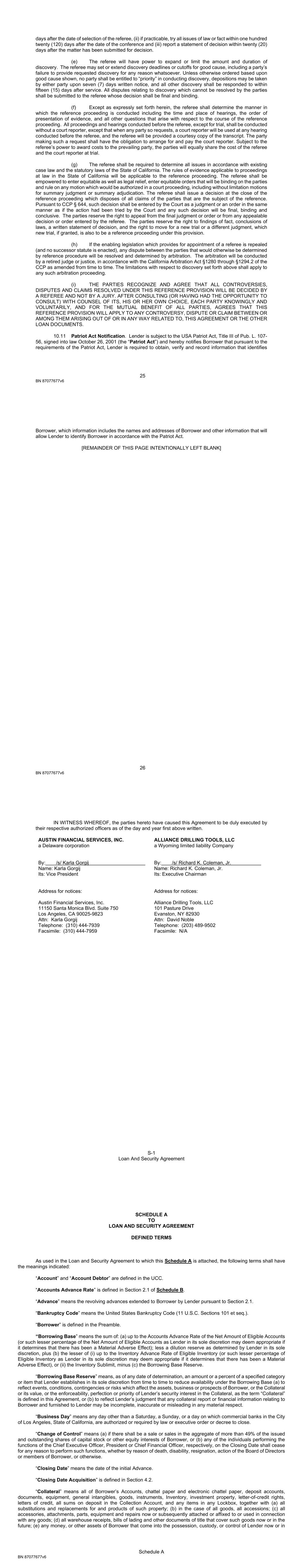 25 BN 87077677v6 days after the date of selection of the referee, (ii) if practicable, try all issues of law or fact within one hundred twenty (120) days after the date of the conference and (iii) report a statement of decision within twenty (20) days after the matter has been submitted for decision. (e) The referee will have power to expand or limit the amount and duration of discovery. The referee may set or extend discovery deadlines or cutoffs for good cause, including a party’s failure to provide requested discovery for any reason whatsoever. Unless otherwise ordered based upon good cause shown, no party shall be entitled to “priority” in conducting discovery, depositions may be taken by either party upon seven (7) days written notice, and all other discovery shall be responded to within fifteen (15) days after service. All disputes relating to discovery which cannot be resolved by the parties shall be submitted to the referee whose decision shall be final and binding. (f) Except as expressly set forth herein, the referee shall determine the manner in which the reference proceeding is conducted including the time and place of hearings, the order of presentation of evidence, and all other questions that arise with respect to the course of the reference proceeding. All proceedings and hearings conducted before the referee, except for trial, shall be conducted without a court reporter, except that when any party so requests, a court reporter will be used at any hearing conducted before the referee, and the referee will be provided a courtesy copy of the transcript. The party making such a request shall have the obligation to arrange for and pay the court reporter. Subject to the referee’s power to award costs to the prevailing party, the parties will equally share the cost of the referee and the court reporter at trial. (g) The referee shall be required to determine all issues in accordance with existing case law and the statutory laws of the State of California. The rules of evidence applicable to proceedings at law in the State of California will be applicable to the reference proceeding. The referee shall be empowered to enter equitable as well as legal relief, enter equitable orders that will be binding on the parties and rule on any motion which would be authorized in a court proceeding, including without limitation motions for summary judgment or summary adjudication. The referee shall issue a decision at the close of the reference proceeding which disposes of all claims of the parties that are the subject of the reference. Pursuant to CCP § 644, such decision shall be entered by the Court as a judgment or an order in the same manner as if the action had been tried by the Court and any such decision will be final, binding and conclusive. The parties reserve the right to appeal from the final judgment or order or from any appealable decision or order entered by the referee. The parties reserve the right to findings of fact, conclusions of laws, a written statement of decision, and the right to move for a new trial or a different judgment, which new trial, if granted, is also to be a reference proceeding under this provision. (h) If the enabling legislation which provides for appointment of a referee is repealed (and no successor statute is enacted), any dispute between the parties that would otherwise be determined by reference procedure will be resolved and determined by arbitration. The arbitration will be conducted by a retired judge or justice, in accordance with the California Arbitration Act §1280 through §1294.2 of the CCP as amended from time to time. The limitations with respect to discovery set forth above shall apply to any such arbitration proceeding. (i) THE PARTIES RECOGNIZE AND AGREE THAT ALL CONTROVERSIES, DISPUTES AND CLAIMS RESOLVED UNDER THIS REFERENCE PROVISION WILL BE DECIDED BY A REFEREE AND NOT BY A JURY. AFTER CONSULTING (OR HAVING HAD THE OPPORTUNITY TO CONSULT) WITH COUNSEL OF ITS, HIS OR HER OWN CHOICE, EACH PARTY KNOWINGLY AND VOLUNTARILY, AND FOR THE MUTUAL BENEFIT OF ALL PARTIES, AGREES THAT THIS REFERENCE PROVISION WILL APPLY TO ANY CONTROVERSY, DISPUTE OR CLAIM BETWEEN OR AMONG THEM ARISING OUT OF OR IN ANY WAY RELATED TO, THIS AGREEMENT OR THE OTHER LOAN DOCUMENTS. 10.11 Patriot Act Notification. Lender is subject to the USA Patriot Act, Title III of Pub. L. 107- 56, signed into law October 26, 2001 (the “Patriot Act”) and hereby notifies Borrower that pursuant to the requirements of the Patriot Act, Lender is required to obtain, verify and record information that identifies 26 BN 87077677v6 Borrower, which information includes the names and addresses of Borrower and other information that will allow Lender to identify Borrower in accordance with the Patriot Act. [REMAINDER OF THIS PAGE INTENTIONALLY LEFT BLANK] S-1 Loan And Security Agreement IN WITNESS WHEREOF, the parties hereto have caused this Agreement to be duly executed by their respective authorized officers as of the day and year first above written. AUSTIN FINANCIAL SERVICES, INC. a Delaware corporation By: /s/ Karla Gorgij Name: Karla Gorgij Its: Vice President ALLIANCE DRILLING TOOLS, LLC a Wyoming limited liability Company By: /s/ Richard K. Coleman, Jr. Name: Richard K. Coleman, Jr. Its: Executive Chairman Address for notices: Austin Financial Services, Inc. 11150 Santa Monica Blvd. Suite 750 Los Angeles, CA 90025-9823 Attn: Karla Gorgij Telephone: (310) 444-7939 Facsimile: (310) 444-7959 Address for notices: Alliance Drilling Tools, LLC 101 Pasture Drive Evanston, NY 82930 Attn: David Noble Telephone: (203) 489-9502 Facsimile: N/A Schedule A BN 87077677v6 SCHEDULE A TO LOAN AND SECURITY AGREEMENT DEFINED TERMS As used in the Loan and Security Agreement to which this Schedule A is attached, the following terms shall have the meanings indicated: “Account” and “Account Debtor” are defined in the UCC. “Accounts Advance Rate” is defined in Section 2.1 of Schedu
