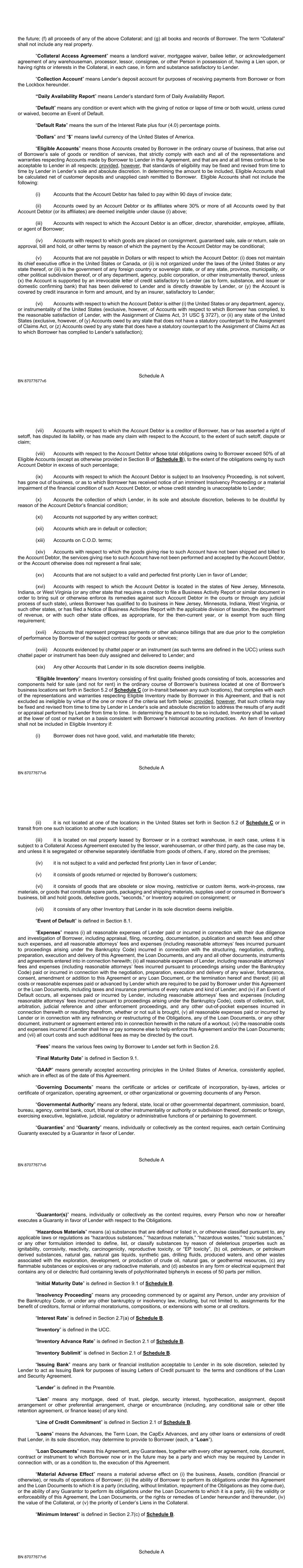 Schedule A BN 87077677v6 the future; (f) all proceeds of any of the above Collateral; and (g) all books and records of Borrower. The term “Collateral” shall not include any real property. “Collateral Access Agreement” means a landlord waiver, mortgagee waiver, bailee letter, or acknowledgement agreement of any warehouseman, processor, lessor, consignee, or other Person in possession of, having a Lien upon, or having rights or interests in the Collateral, in each case, in form and substance satisfactory to Lender. “Collection Account” means Lender’s deposit account for purposes of receiving payments from Borrower or from the Lockbox hereunder. “Daily Availability Report” means Lender’s standard form of Daily Availability Report. “Default” means any condition or event which with the giving of notice or lapse of time or both would, unless cured or waived, become an Event of Default. “Default Rate” means the sum of the Interest Rate plus four (4.0) percentage points. “Dollars” and “$” means lawful currency of the United States of America. “Eligible Accounts” means those Accounts created by Borrower in the ordinary course of business, that arise out of Borrower’s sale of goods or rendition of services, that strictly comply with each and all of the representations and warranties respecting Accounts made by Borrower to Lender in this Agreement, and that are and at all times continue to be acceptable to Lender in all respects; provided, however, that standards of eligibility may be fixed and revised from time to time by Lender in Lender’s sole and absolute discretion. In determining the amount to be included, Eligible Accounts shall be calculated net of customer deposits and unapplied cash remitted to Borrower. Eligible Accounts shall not include the following: (i) Accounts that the Account Debtor has failed to pay within 90 days of invoice date; (ii) Accounts owed by an Account Debtor or its affiliates where 30% or more of all Accounts owed by that Account Debtor (or its affiliates) are deemed ineligible under clause (i) above; (iii) Accounts with respect to which the Account Debtor is an officer, director, shareholder, employee, affiliate, or agent of Borrower; (iv) Accounts with respect to which goods are placed on consignment, guaranteed sale, sale or return, sale on approval, bill and hold, or other terms by reason of which the payment by the Account Debtor may be conditional; (v) Accounts that are not payable in Dollars or with respect to which the Account Debtor: (i) does not maintain its chief executive office in the United States or Canada, or (ii) is not organized under the laws of the United States or any state thereof, or (iii) is the government of any foreign country or sovereign state, or of any state, province, municipality, or other political subdivision thereof, or of any department, agency, public corporation, or other instrumentality thereof, unless (x) the Account is supported by an irrevocable letter of credit satisfactory to Lender (as to form, substance, and issuer or domestic confirming bank) that has been delivered to Lender and is directly drawable by Lender, or (y) the Account is covered by credit insurance in form and amount, and by an insurer, satisfactory to Lender; (vi) Accounts with respect to which the Account Debtor is either (i) the United States or any department, agency, or instrumentality of the United States (exclusive, however, of Accounts with respect to which Borrower has complied, to the reasonable satisfaction of Lender, with the Assignment of Claims Act, 31 USC § 3727), or (ii) any state of the United States (exclusive, however, of (y) Accounts owed by any state that does not have a statutory counterpart to the Assignment of Claims Act, or (z) Accounts owed by any state that does have a statutory counterpart to the Assignment of Claims Act as to which Borrower has complied to Lender’s satisfaction); Schedule A BN 87077677v6 (vii) Accounts with respect to which the Account Debtor is a creditor of Borrower, has or has asserted a right of setoff, has disputed its liability, or has made any claim with respect to the Account, to the extent of such setoff, dispute or claim; (viii) Accounts with respect to the Account Debtor whose total obligations owing to Borrower exceed 50% of all Eligible Accounts (except as otherwise provided in Section B of Schedule B), to the extent of the obligations owing by such Account Debtor in excess of such percentage; (ix) Accounts with respect to which the Account Debtor is subject to an Insolvency Proceeding, is not solvent, has gone out of business, or as to which Borrower has received notice of an imminent Insolvency Proceeding or a material impairment of the financial condition of such Account Debtor, or whose credit standing is unacceptable to Lender; (x) Accounts the collection of which Lender, in its sole and absolute discretion, believes to be doubtful by reason of the Account Debtor’s financial condition; (xi) Accounts not supported by any written contract; (xii) Accounts which are in default or collection; (xiii) Accounts on C.O.D. terms; (xiv) Accounts with respect to which the goods giving rise to such Account have not been shipped and billed to the Account Debtor, the services giving rise to such Account have not been performed and accepted by the Account Debtor, or the Account otherwise does not represent a final sale; (xv) Accounts that are not subject to a valid and perfected first priority Lien in favor of Lender; (xvi) Accounts with respect to which the Account Debtor is located in the states of New Jersey, Minnesota, Indiana, or West Virginia (or any other state that requires a creditor to file a Business Activity Report or similar document in order to bring suit or otherwise enforce its remedies against such Account Debtor in the courts or through any judicial process of such state), unless Borrower has qualified to do business in New Jersey, Minnesota, Indi