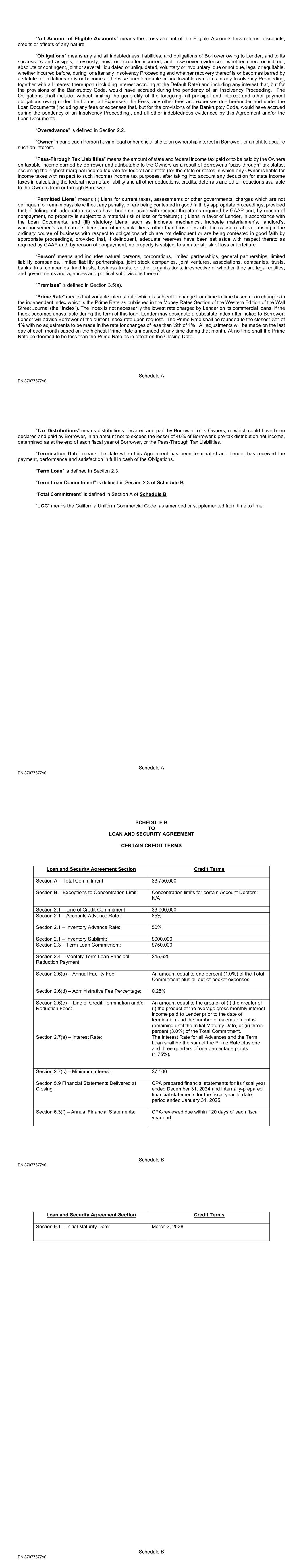 Schedule A BN 87077677v6 “Net Amount of Eligible Accounts” means the gross amount of the Eligible Accounts less returns, discounts, credits or offsets of any nature. “Obligations” means any and all indebtedness, liabilities, and obligations of Borrower owing to Lender, and to its successors and assigns, previously, now, or hereafter incurred, and howsoever evidenced, whether direct or indirect, absolute or contingent, joint or several, liquidated or unliquidated, voluntary or involuntary, due or not due, legal or equitable, whether incurred before, during, or after any Insolvency Proceeding and whether recovery thereof is or becomes barred by a statute of limitations or is or becomes otherwise unenforceable or unallowable as claims in any Insolvency Proceeding, together with all interest thereupon (including interest accruing at the Default Rate) and including any interest that, but for the provisions of the Bankruptcy Code, would have accrued during the pendency of an Insolvency Proceeding. The Obligations shall include, without limiting the generality of the foregoing, all principal and interest and other payment obligations owing under the Loans, all Expenses, the Fees, any other fees and expenses due hereunder and under the Loan Documents (including any fees or expenses that, but for the provisions of the Bankruptcy Code, would have accrued during the pendency of an Insolvency Proceeding), and all other indebtedness evidenced by this Agreement and/or the Loan Documents. “Overadvance” is defined in Section 2.2. “Owner” means each Person having legal or beneficial title to an ownership interest in Borrower, or a right to acquire such an interest. “Pass-Through Tax Liabilities” means the amount of state and federal income tax paid or to be paid by the Owners on taxable income earned by Borrower and attributable to the Owners as a result of Borrower’s “pass-through” tax status, assuming the highest marginal income tax rate for federal and state (for the state or states in which any Owner is liable for income taxes with respect to such income) income tax purposes, after taking into account any deduction for state income taxes in calculating the federal income tax liability and all other deductions, credits, deferrals and other reductions available to the Owners from or through Borrower. “Permitted Liens” means (i) Liens for current taxes, assessments or other governmental charges which are not delinquent or remain payable without any penalty, or are being contested in good faith by appropriate proceedings, provided that, if delinquent, adequate reserves have been set aside with respect thereto as required by GAAP and, by reason of nonpayment, no property is subject to a material risk of loss or forfeiture; (ii) Liens in favor of Lender, in accordance with the Loan Documents, and (iii) statutory Liens, such as inchoate mechanics’, inchoate materialmen’s, landlord’s, warehousemen’s, and carriers’ liens, and other similar liens, other than those described in clause (i) above, arising in the ordinary course of business with respect to obligations which are not delinquent or are being contested in good faith by appropriate proceedings, provided that, if delinquent, adequate reserves have been set aside with respect thereto as required by GAAP and, by reason of nonpayment, no property is subject to a material risk of loss or forfeiture. “Person” means and includes natural persons, corporations, limited partnerships, general partnerships, limited liability companies, limited liability partnerships, joint stock companies, joint ventures, associations, companies, trusts, banks, trust companies, land trusts, business trusts, or other organizations, irrespective of whether they are legal entities, and governments and agencies and political subdivisions thereof. “Premises” is defined in Section 3.5(a). “Prime Rate” means that variable interest rate which is subject to change from time to time based upon changes in the independent index which is the Prime Rate as published in the Money Rates Section of the Western Edition of the Wall Street Journal (the “Index”). The Index is not necessarily the lowest rate charged by Lender on its commercial loans. If the Index becomes unavailable during the term of this loan, Lender may designate a substitute index after notice to Borrower. Lender will advise Borrower of the current Index rate upon request. The Prime Rate shall be rounded to the closest ¼th of 1% with no adjustments to be made in the rate for changes of less than ¼th of 1%. All adjustments will be made on the last day of each month based on the highest Prime Rate announced at any time during that month. At no time shall the Prime Rate be deemed to be less than the Prime Rate as in effect on the Closing Date. Schedule A BN 87077677v6 “Tax Distributions” means distributions declared and paid by Borrower to its Owners, or which could have been declared and paid by Borrower, in an amount not to exceed the lesser of 40% of Borrower’s pre-tax distribution net income, determined as at the end of each fiscal year of Borrower, or the Pass-Through Tax Liabilities. “Termination Date” means the date when this Agreement has been terminated and Lender has received the payment, performance and satisfaction in full in cash of the Obligations. “Term Loan” is defined in Section 2.3. “Term Loan Commitment” is defined in Section 2.3 of Schedule B. “Total Commitment” is defined in Section A of Schedule B. “UCC” means the California Uniform Commercial Code, as amended or supplemented from time to time. Schedule B BN 87077677v6 SCHEDULE B TO LOAN AND SECURITY AGREEMENT CERTAIN CREDIT TERMS Loan and Security Agreement Section Credit Terms Section A – Total Commitment $3,750,000 Section B – Exceptions to Concentration Limit: Concentration limits for certain Account Debtors: N/A Section 2.1 – Line of Credit Commitment: $3,000,000 Sectio