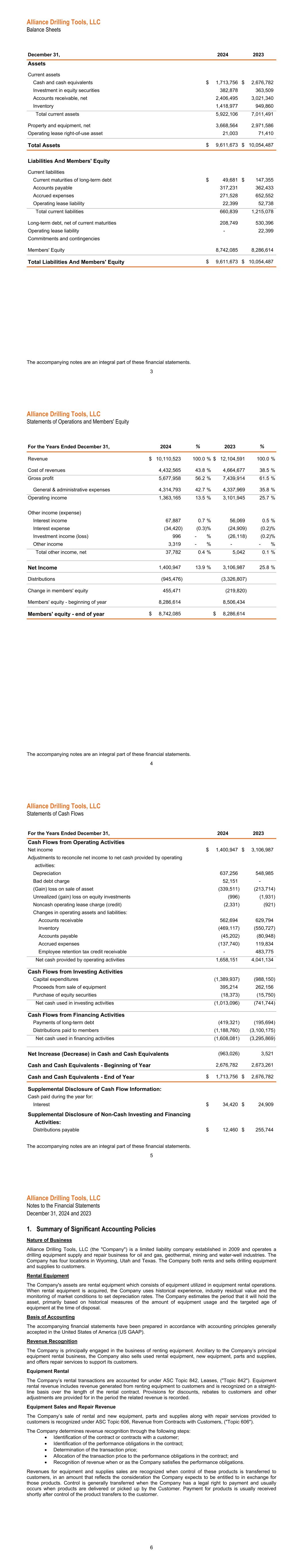 Alliance Drilling Tools, LLC Balance Sheets December 31, 2024 2023 Assets Current assets Cash and cash equivalents $ 1,713,756 $ 2,676,782 Investment in equity securities 382,878 363,509 Accounts receivable, net 2,406,495 3,021,340 Inventory 1,418,977 949,860 Total current assets 5,922,106 7,011,491 Property and equipment, net 3,668,564 2,971,586 Operating lease right-of-use asset 21,003 71,410 Total Assets $ 9,611,673 $ 10,054,487 Liabilities And Members' Equity Current liabilities Current maturities of long-term debt $ 49,681 $ 147,355 Accounts payable 317,231 362,433 Accrued expenses 271,528 652,552 Operating lease liability 22,399 52,738 Total current liabilities 660,839 1,215,078 Long-term debt, net of current maturities 208,749 530,396 Operating lease liability - 22,399 Commitments and contingencies Members' Equity 8,742,085 8,286,614 Total Liabilities And Members' Equity $ 9,611,673 $ 10,054,487 The accompanying notes are an integral part of these financial statements. 3 Alliance Drilling Tools, LLC Statements of Operations and Members' Equity For the Years Ended December 31, 2024 % 2023 % Revenue $ 10,110,523 %100.0 $ 12,104,591 %100.0 Cost of revenues 4,432,565 %43.8 4,664,677 %38.5 Gross profit 5,677,958 %56.2 7,439,914 %61.5 General & administrative expenses 4,314,793 %42.7 4,337,969 %35.8 Operating income 1,363,165 %13.5 3,101,945 %25.7 Other income (expense) Interest income 67,887 %0.7 56,069 %0.5 Interest expense (34,420) %(0.3) (24,909) %(0.2) Investment income (loss) 996 %- (26,118) %(0.2) Other income 3,319 %- - %- Total other income, net 37,782 %0.4 5,042 %0.1 Net Income 1,400,947 %13.9 3,106,987 %25.8 Distributions (945,476) (3,326,807) Change in members' equity 455,471 (219,820) Members' equity - beginning of year 8,286,614 8,506,434 Members' equity - end of year $ 8,742,085 $ 8,286,614 The accompanying notes are an integral part of these financial statements. 4 Alliance Drilling Tools, LLC Statements of Cash Flows For the Years Ended December 31, 2024 2023 Cash Flows from Operating Activities Net income $ 1,400,947 $ 3,106,987 Adjustments to reconcile net income to net cash provided by operating activities: Depreciation 637,256 548,985 Bad debt charge 52,151 - (Gain) loss on sale of asset (339,511) (213,714) Unrealized (gain) loss on equity investments (996) (1,931) Noncash operating lease charge (credit) (2,331) (921) Changes in operating assets and liabilities: Accounts receivable 562,694 629,794 Inventory (469,117) (550,727) Accounts payable (45,202) (80,948) Accrued expenses (137,740) 119,834 Employee retention tax credit receivable - 483,775 Net cash provided by operating activities 1,658,151 4,041,134 Cash Flows from Investing Activities Capital expenditures (1,389,937) (988,150) Proceeds from sale of equipment 395,214 262,156 Purchase of equity securities (18,373) (15,750) Net cash used in investing activities (1,013,096) (741,744) Cash Flows from Financing Activities Payments of long-term debt (419,321) (195,694) Distributions paid to members (1,188,760) (3,100,175) Net cash used in financing activities (1,608,081) (3,295,869) Net Increase (Decrease) in Cash and Cash Equivalents (963,026) 3,521 Cash and Cash Equivalents - Beginning of Year 2,676,782 2,673,261 Cash and Cash Equivalents - End of Year $ 1,713,756 $ 2,676,782 Supplemental Disclosure of Cash Flow Information: Cash paid during the year for: Interest $ 34,420 $ 24,909 Supplemental Disclosure of Non-Cash Investing and Financing Activities: Distributions payable $ 12,460 $ 255,744 The accompanying notes are an integral part of these financial statements. 5 Alliance Drilling Tools, LLC Notes to the Financial Statements December 31, 2024 and 2023 1. Summary of Significant Accounting Policies Nature of Business Alliance Drilling Tools, LLC (the "Company") is a limited liability company established in 2009 and operates a drilling equipment supply and repair business for oil and gas, geothermal, mining and water-well industries. The Company has four locations in Wyoming, Utah and Texas. The Company both rents and sells drilling equipment and supplies to customers. Rental Equipment The Company's assets are rental equipment which consists of equipment utilized in equipment rental operations. When rental equipment is acquired, the Company uses historical experience, industry residual value and the monitoring of market conditions to set depreciation rates. The Company estimates the period that it will hold the asset, primarily based on historical measures of the amount of equipment usage and the targeted age of equipment at the time of disposal. Basis of Accounting The accompanying financial statements have been prepared in accordance with accounting principles generally accepted in the United States of America (US GAAP). Revenue Recognition The Company is principally engaged in the business of renting equipment. Ancillary to the Company’s principal equipment rental business, the Company also sells used rental equipment, new equipment, parts and supplies, and offers repair services to support its customers. Equipment Rental The Company’s rental transactions are accounted for under ASC Topic 842, Leases, ("Topic 842"). Equipment rental revenue includes revenue generated from renting equipment to customers and is recognized on a straight- line basis over the length of the rental contract. Provisions for discounts, rebates to customers and other adjustments are provided for in the period the related revenue is recorded. Equipment Sales and Repair Revenue The Company’s sale of rental and new equipment, parts and supplies along with repair services provided to customers is recognized under ASC Topic 606, Revenue from Contracts with Customers, ("Topic 606"). The Company determines revenue recognition through the following steps:  Identification of the contract or contracts with a customer;  Identification of the performance obligations in the contract;  Determination of the transaction price;  Allo