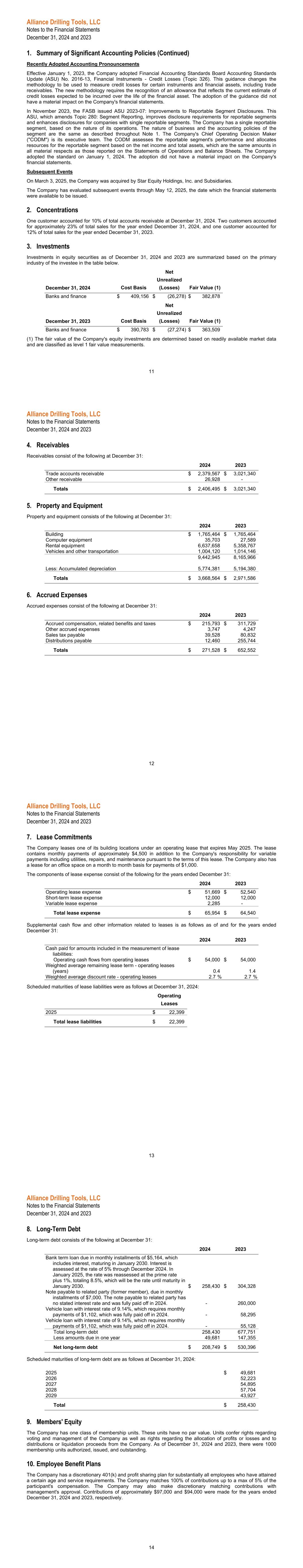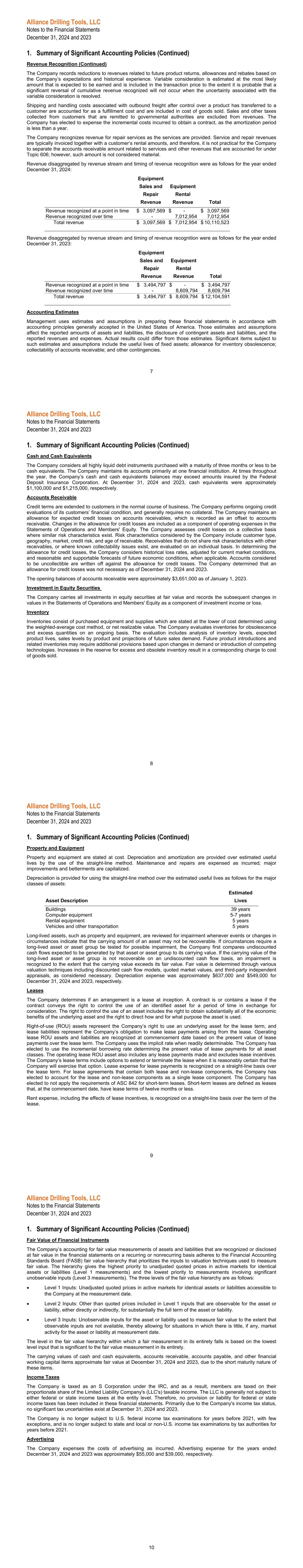 Alliance Drilling Tools, LLC Notes to the Financial Statements December 31, 2024 and 2023 1. Summary of Significant Accounting Policies (Continued) Revenue Recognition (Continued) The Company records reductions to revenues related to future product returns, allowances and rebates based on the Company’s expectations and historical experience. Variable consideration is estimated at the most likely amount that is expected to be earned and is included in the transaction price to the extent it is probable that a significant reversal of cumulative revenue recognized will not occur when the uncertainty associated with the variable consideration is resolved. Shipping and handling costs associated with outbound freight after control over a product has transferred to a customer are accounted for as a fulfillment cost and are included in cost of goods sold. Sales and other taxes collected from customers that are remitted to governmental authorities are excluded from revenues. The Company has elected to expense the incremental costs incurred to obtain a contract, as the amortization period is less than a year. The Company recognizes revenue for repair services as the services are provided. Service and repair revenues are typically invoiced together with a customer’s rental amounts, and therefore, it is not practical for the Company to separate the accounts receivable amount related to services and other revenues that are accounted for under Topic 606; however, such amount is not considered material. Revenue disaggregated by revenue stream and timing of revenue recognition were as follows for the year ended December 31, 2024: Equipment Sales and Repair Revenue Equipment Rental Revenue Total Revenue recognized at a point in time $ 3,097,569 $ - $ 3,097,569 Revenue recognized over time - 7,012,954 7,012,954 Total revenue $ 3,097,569 $ 7,012,954 $ 10,110,523 Revenue disaggregated by revenue stream and timing of revenue recognition were as follows for the year ended December 31, 2023: Equipment Sales and Repair Revenue Equipment Rental Revenue Total Revenue recognized at a point in time $ 3,494,797 $ - $ 3,494,797 Revenue recognized over time - 8,609,794 8,609,794 Total revenue $ 3,494,797 $ 8,609,794 $ 12,104,591 Accounting Estimates Management uses estimates and assumptions in preparing these financial statements in accordance with accounting principles generally accepted in the United States of America. Those estimates and assumptions affect the reported amounts of assets and liabilities, the disclosure of contingent assets and liabilities, and the reported revenues and expenses. Actual results could differ from those estimates. Significant items subject to such estimates and assumptions include the useful lives of fixed assets; allowance for inventory obsolescence; collectability of accounts receivable; and other contingencies. 7 Alliance Drilling Tools, LLC Notes to the Financial Statements December 31, 2024 and 2023 1. Summary of Significant Accounting Policies (Continued) Cash and Cash Equivalents The Company considers all highly liquid debt instruments purchased with a maturity of three months or less to be cash equivalents. The Company maintains its accounts primarily at one financial institution. At times throughout the year, the Company’s cash and cash equivalents balances may exceed amounts insured by the Federal Deposit Insurance Corporation. At December 31, 2024 and 2023, cash equivalents were approximately $1,100,000 and $1,215,000, respectively. Accounts Receivable Credit terms are extended to customers in the normal course of business. The Company performs ongoing credit evaluations of its customers’ financial condition, and generally requires no collateral. The Company maintains an allowance for expected credit losses on accounts receivables, which is recorded as an offset to accounts receivable. Changes in the allowance for credit losses are included as a component of operating expenses in the Statements of Operations and Members' Equity. The Company assesses credit losses on a collective basis where similar risk characteristics exist. Risk characteristics considered by the Company include customer type, geography, market, credit risk, and age of receivable. Receivables that do not share risk characteristics with other receivables, or where known collectability issues exist, are evaluated on an individual basis. In determining the allowance for credit losses, the Company considers historical loss rates, adjusted for current market conditions, and reasonable and supportable forecasts of future economic conditions, when applicable. Accounts considered to be uncollectible are written off against the allowance for credit losses. The Company determined that an allowance for credit losses was not necessary as of December 31, 2024 and 2023. The opening balances of accounts receivable were approximately $3,651,000 as of January 1, 2023. Investment in Equity Securities The Company carries all investments in equity securities at fair value and records the subsequent changes in values in the Statements of Operations and Members' Equity as a component of investment income or loss. Inventory Inventories consist of purchased equipment and supplies which are stated at the lower of cost determined using the weighted-average cost method, or net realizable value. The Company evaluates inventories for obsolescence and excess quantities on an ongoing basis. The evaluation includes analysis of inventory levels, expected product lives, sales levels by product and projections of future sales demand. Future product introductions and related inventories may require additional provisions based upon changes in demand or introduction of competing technologies. Increases in the reserve for excess and obsolete inventory result in a corresponding charge to cost of goods sold. 8 Alliance Drilling Tools, LLC Notes to the Financial Statements December 31, 2024 and 2023 1. Summary of Significant Accounting Polic
