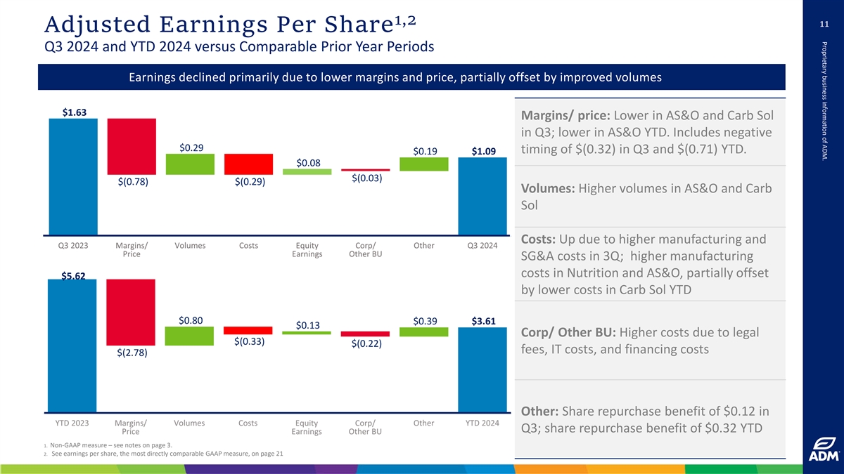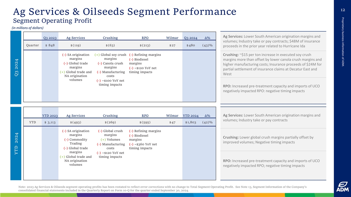 Proprietary business information of ADM. 1,2 11 Adjusted Earnings Per Share Q3 2024 and YTD 2024 versus Comparable Prior Year Periods Earnings declined primarily due to lower margins and price, partially offset by improved volumes Margins/ price: Lower in AS&O and Carb Sol in Q3; lower in AS&O YTD. Includes negative timing of $(0.32) in Q3 and $(0.71) YTD. Volumes: Higher volumes in AS&O and Carb Sol Costs: Up due to higher manufacturing and SG&A costs in 3Q; higher manufacturing costs in Nutrition and AS&O, partially offset by lower costs in Carb Sol YTD Corp/ Other BU: Higher costs due to legal fees, IT costs, and financing costs Other: Share repurchase benefit of $0.12 in Q3; share repurchase benefit of $0.32 YTD 1. Non-GAAP measure – see notes on page 3. 2. See earnings per share, the most directly comparable GAAP measure, on page 21